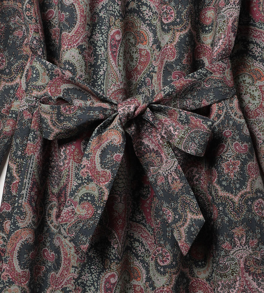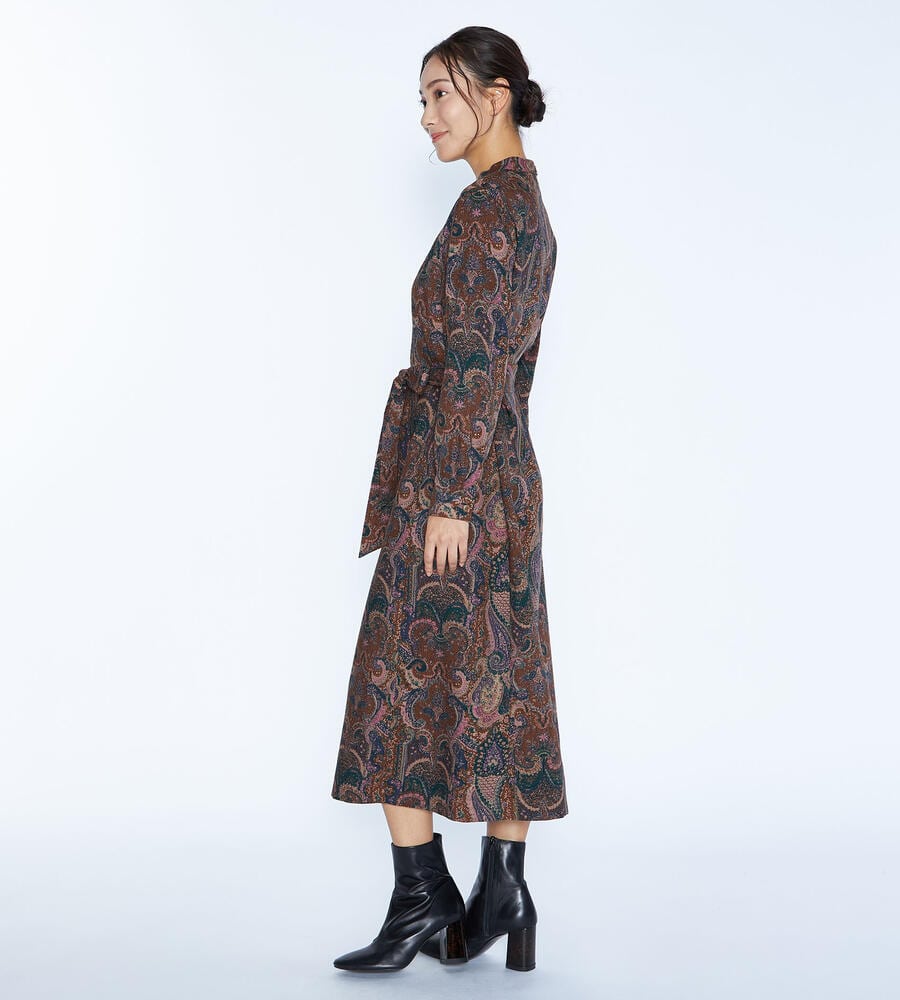 モダンシックに着こなせる、ヴィンテージペーズリー柄のワンピース。スタンドカラーデザイン、袖口はカフスで切り替え、フロントにタックを取り入れて程よいゆとりをプラス。ウエストベルトのオンオフで雰囲気のアレンジを楽しんでいただけます。