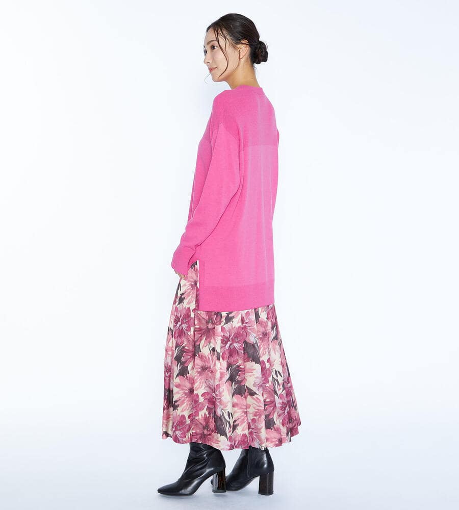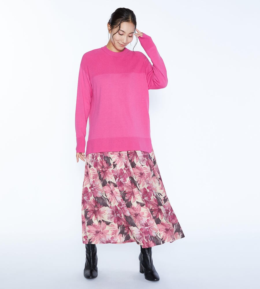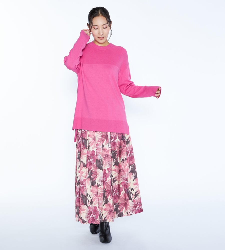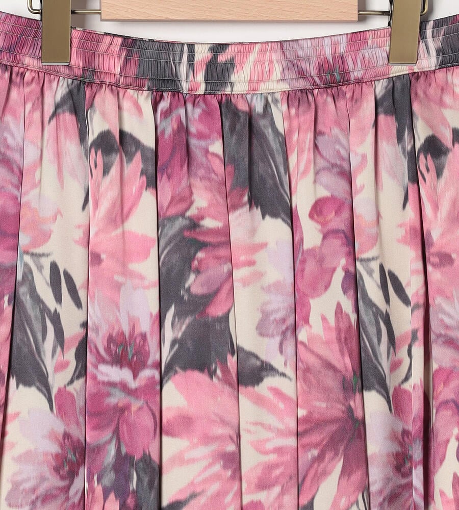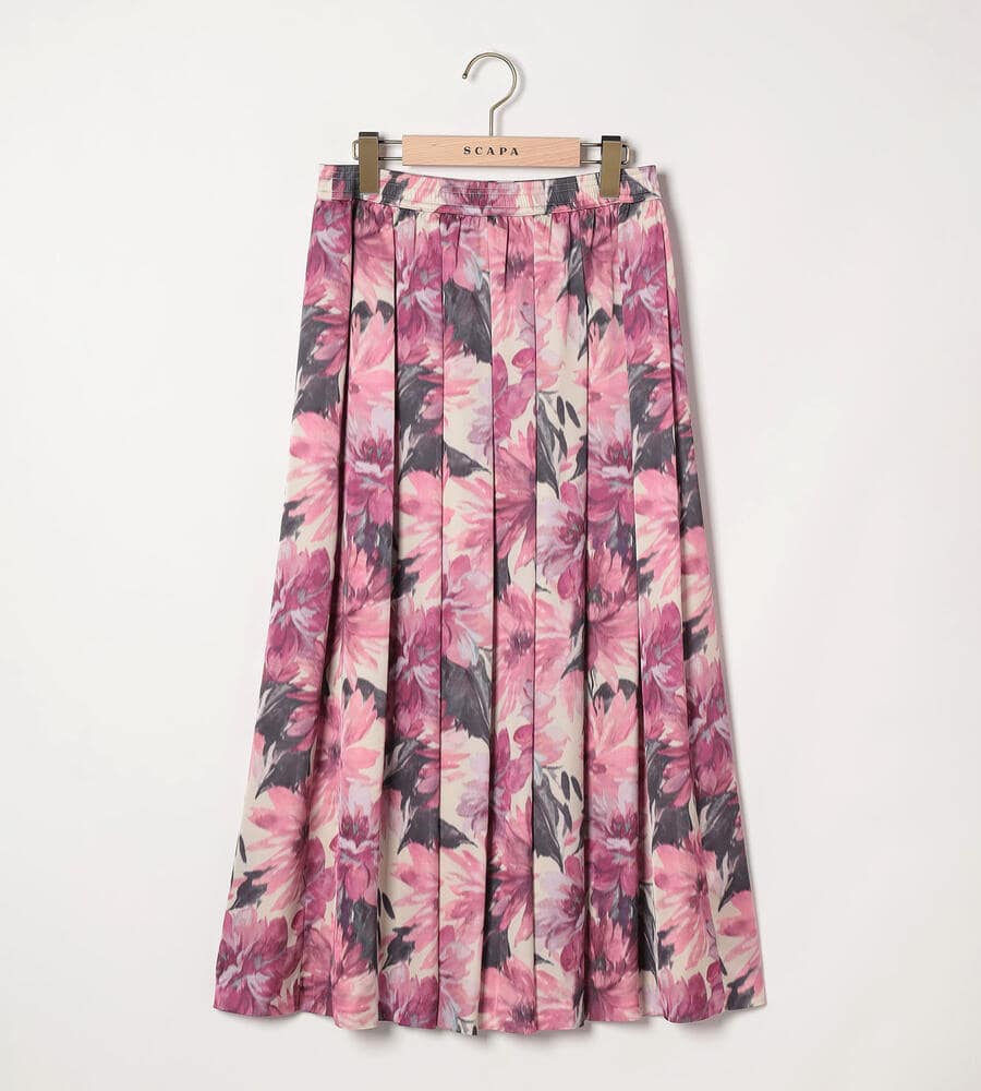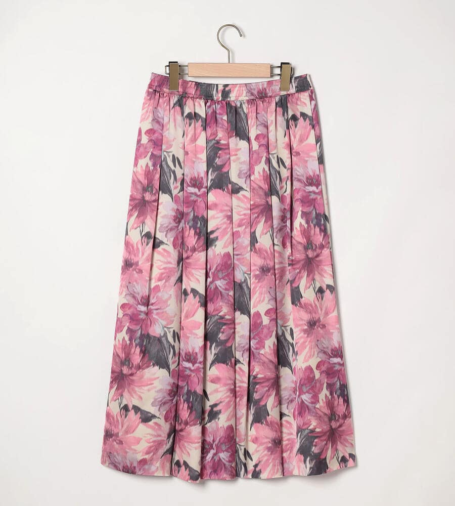 華やかなカラー使いが気分を高めてくれるフラワープリントスカート。幅広プリーツが上品かつクラシカルな雰囲気をプラス。ウエストがゴム仕様になった着心地の良さが嬉しいポイント。しなやかな素材が流れるように美しいシルエットを演出します。