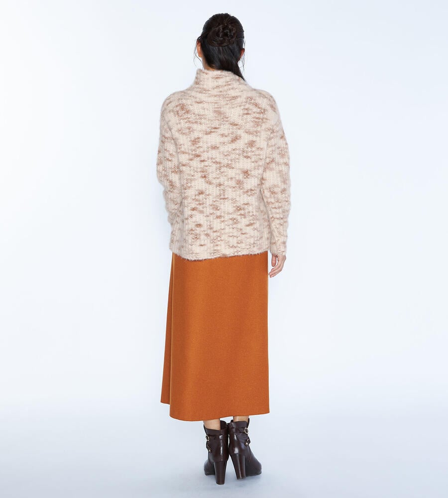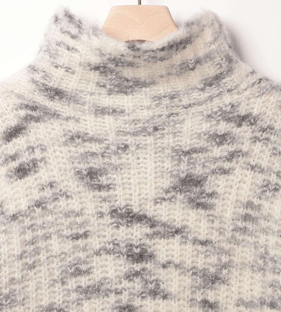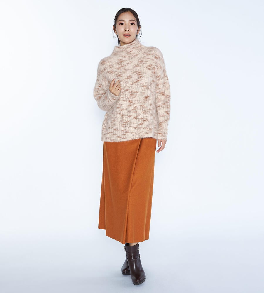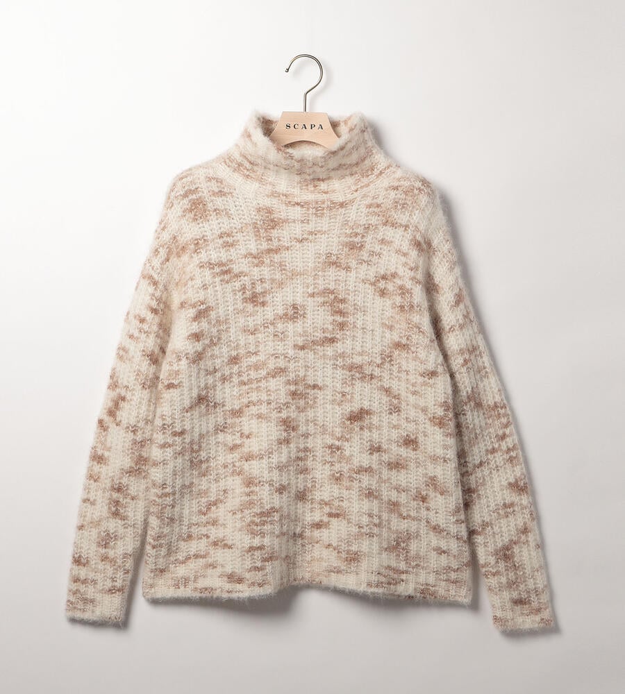 アルパカやウール、ナイロンなどを織り交ぜて、ふっくらとしたソフトな風合いに編み上げたニットトップス。メランジ調の柄使いで、着こなしをフェミニンかつ柔和な印象に映し出します。高さのあるスタンドカラーを採用。裾は絞らず広げることで、リラックス感のあるシルエットに仕上げているのも特徴です。合わせるボトムスを選ばず、主役級の冬コーデが楽しめます。