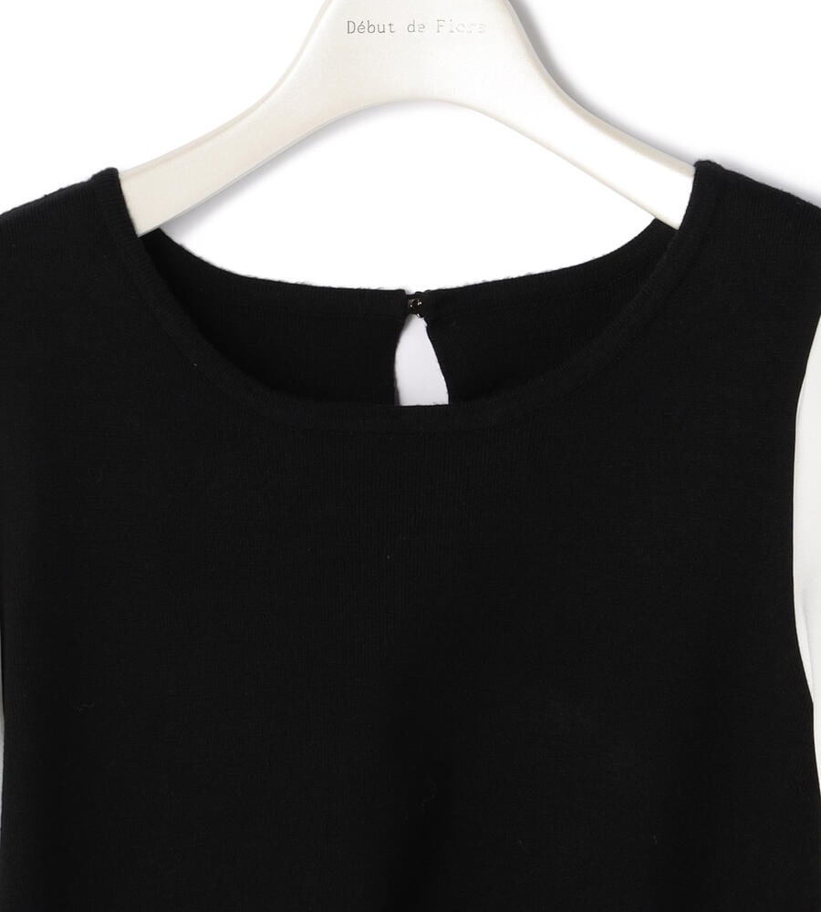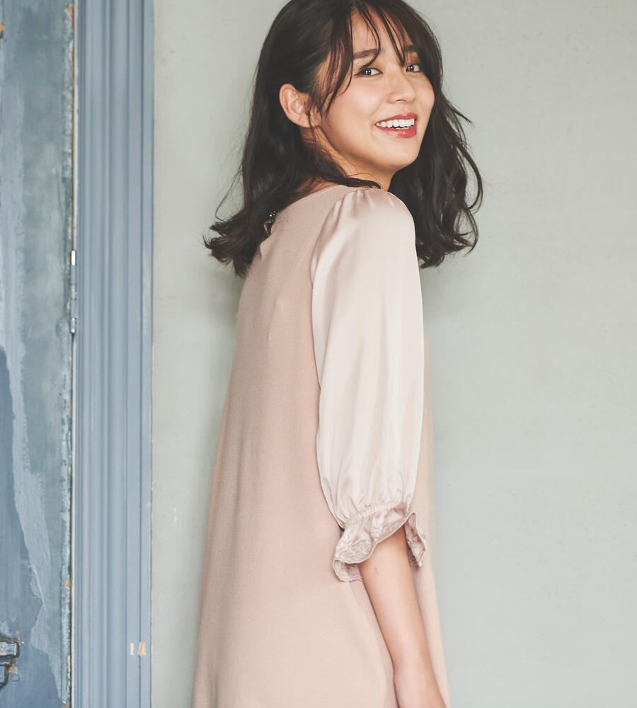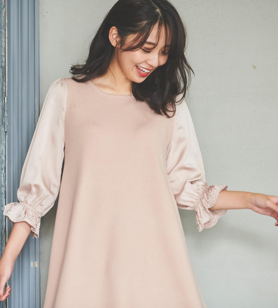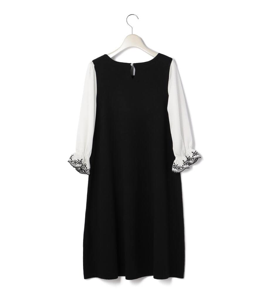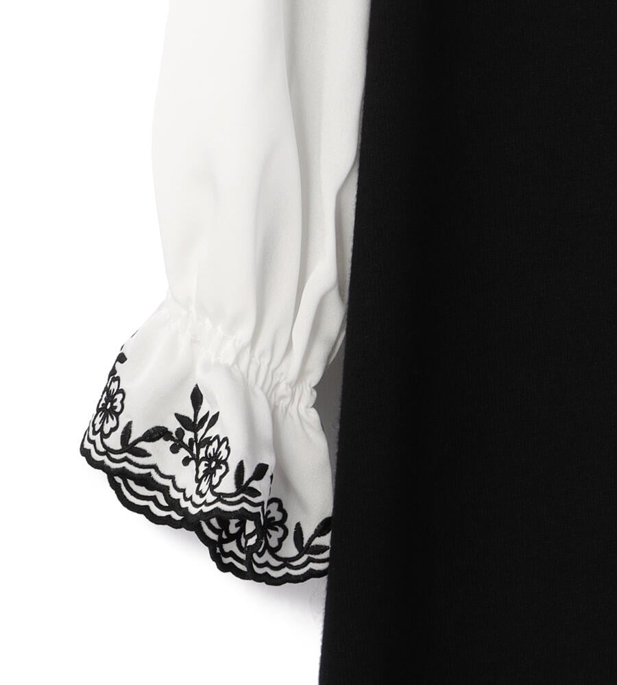 異素材使いの袖がポイントのニットワンピース。袖は上品な布帛を使用し、刺繍やフリルでフェミニンなアクセントを加えています。後ろ首にはビジュー&スリットをあしらい、バックスタイルも印象的にデザイン。合わせる小物でカジュアルにもキレイめにもスタイリングでき、様々なシーンに活躍します。