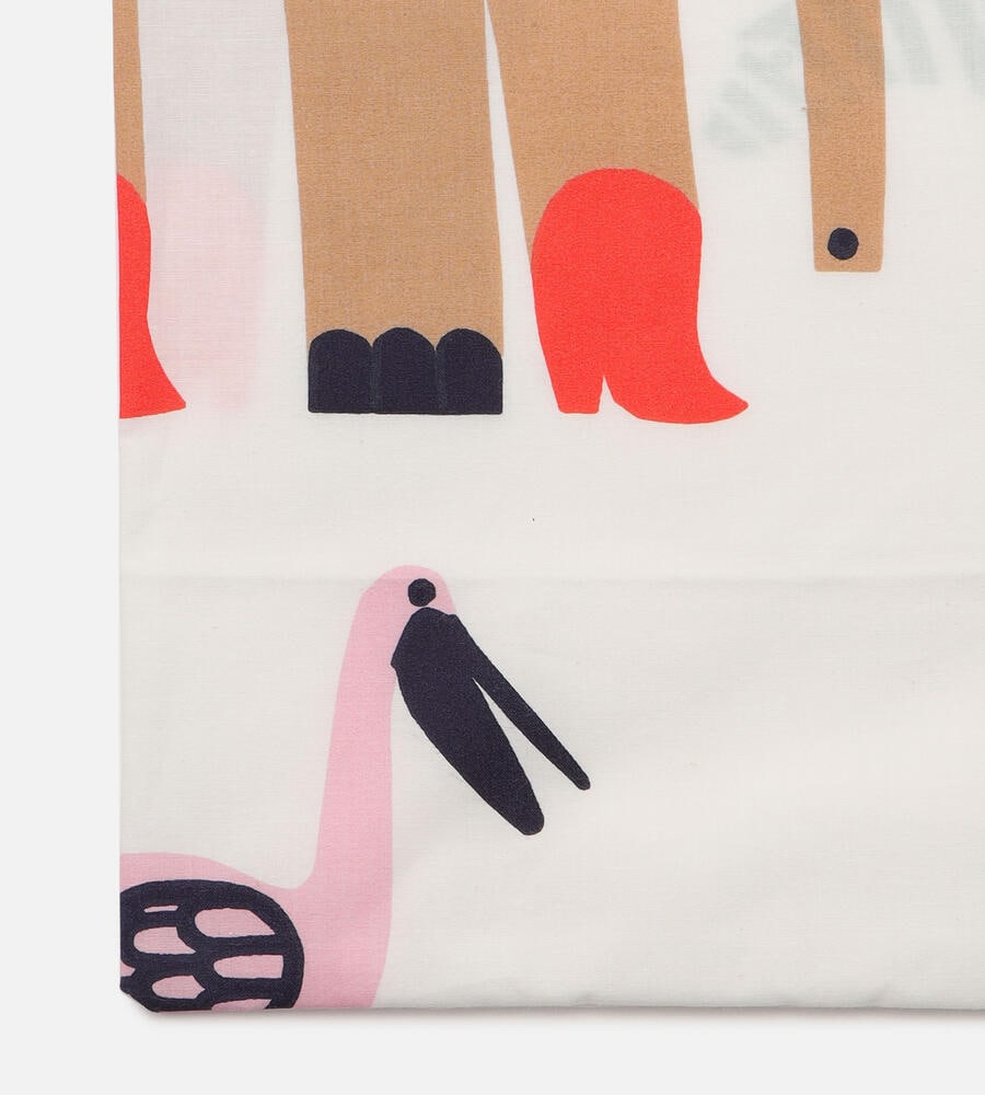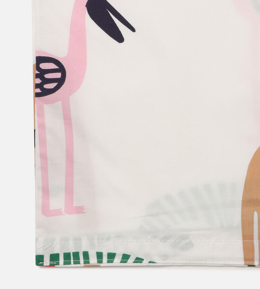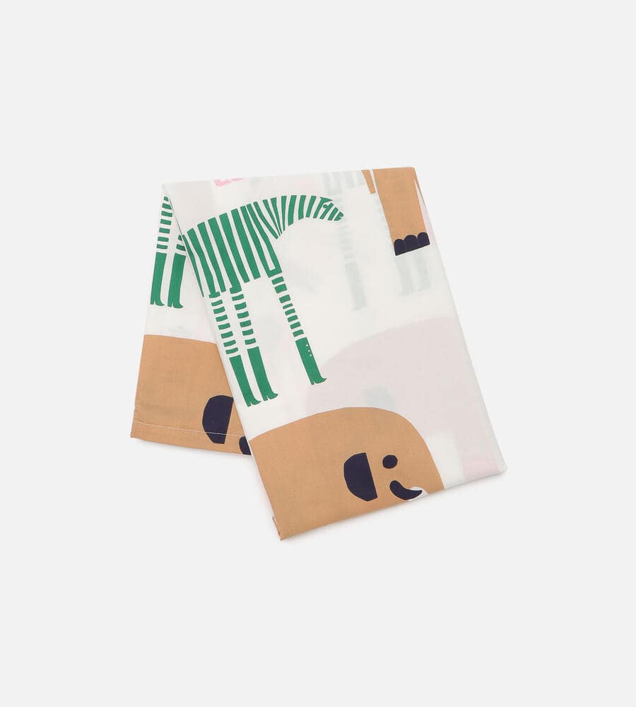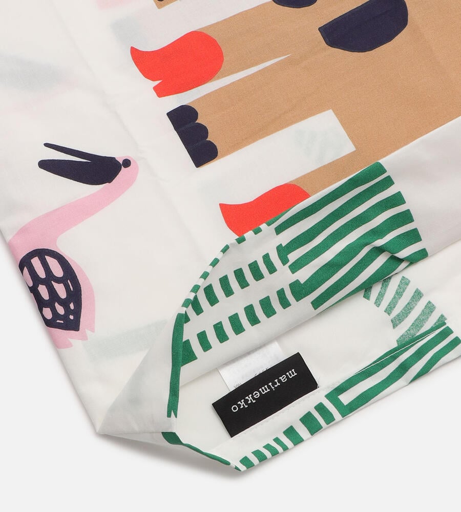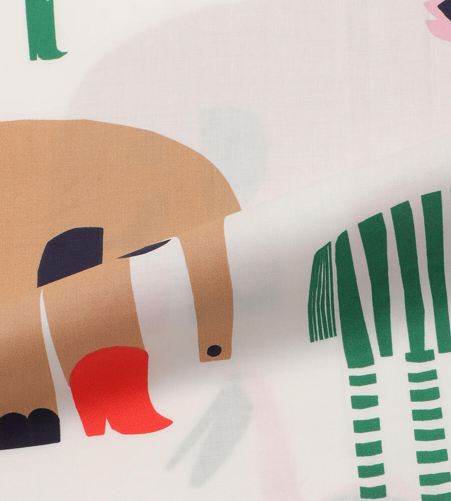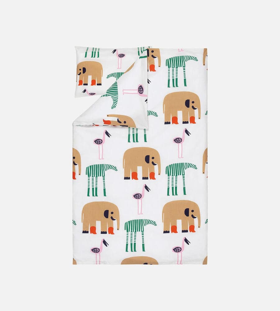 ゾウやフラミンゴが描かれたKarkumatkaパターンのKidsデュベカバーセット。脱出を意味するテキスタイル名で、動物たちがシューズを履いているようなユニークなデザイン。サラリとしたコットン素材は肌触りも快適です。
