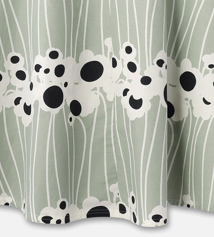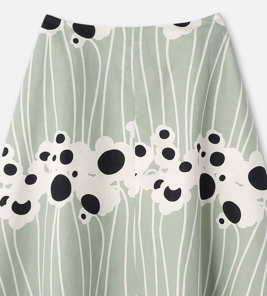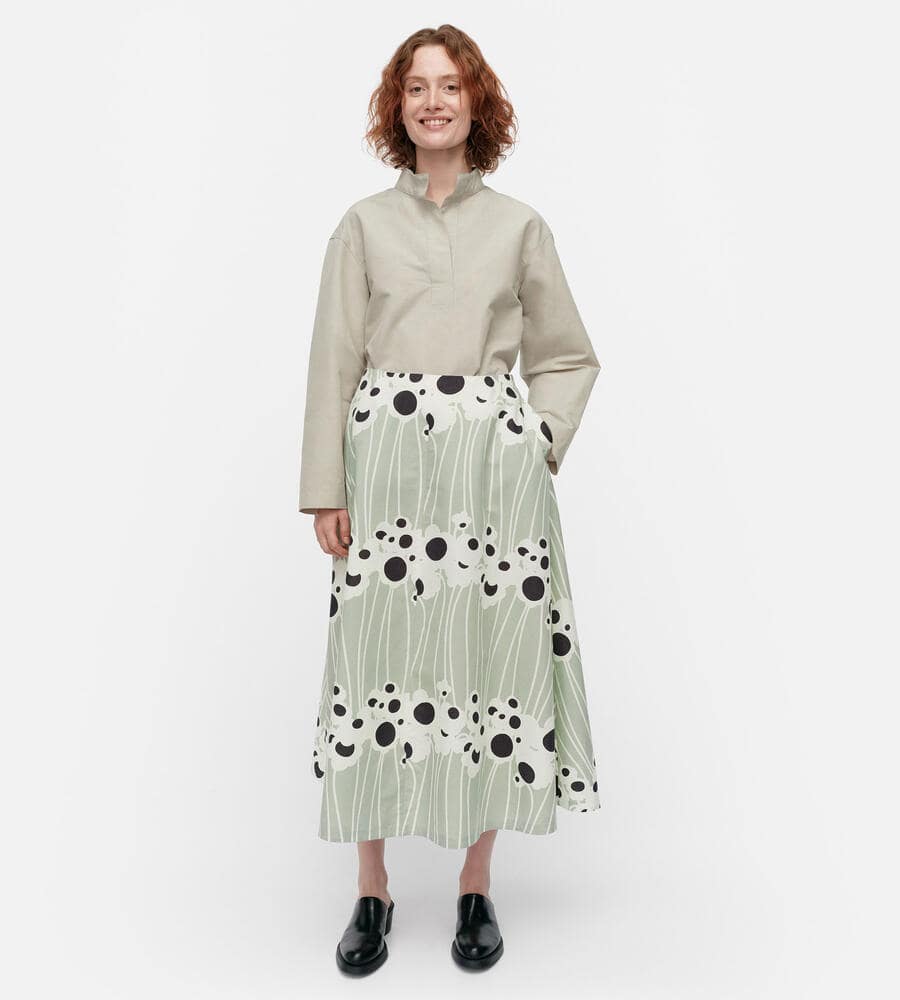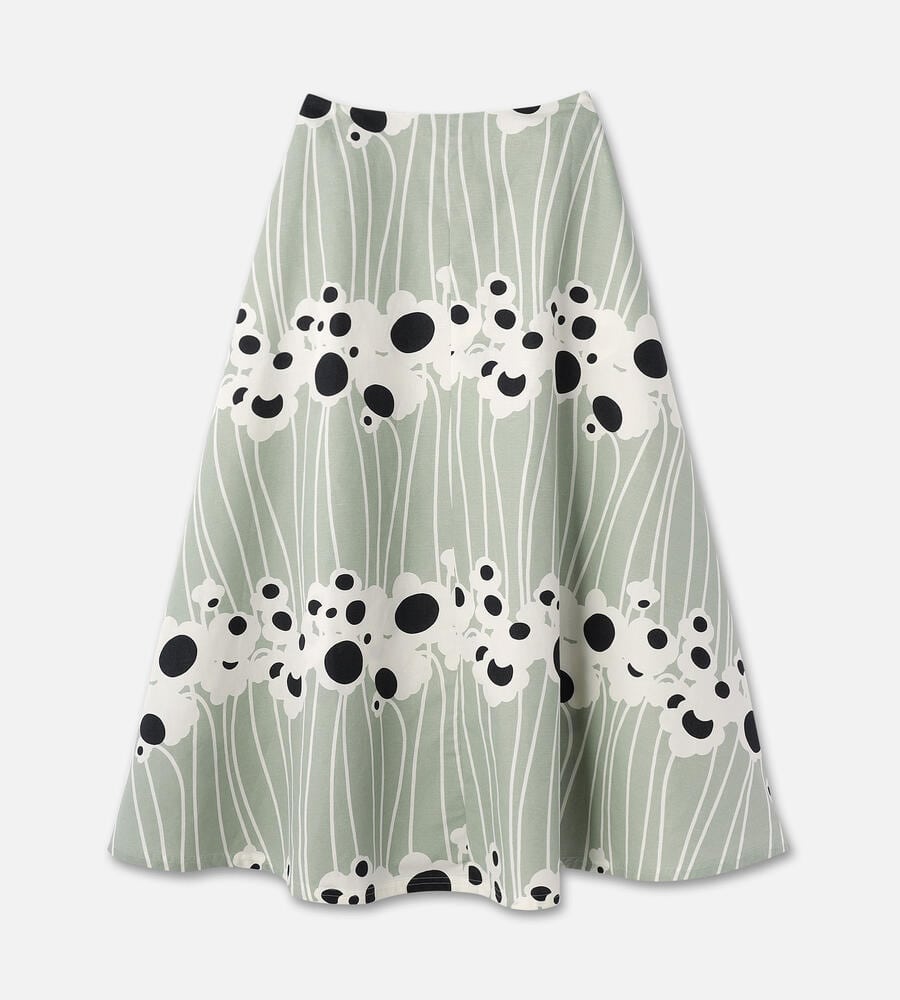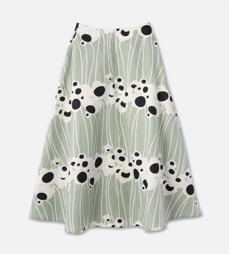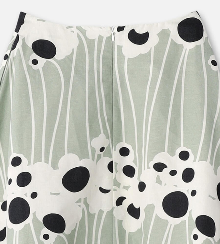 池に由来するLammet柄のミモレ丈スカートは、グラフィカルに描かれた花や水の流れがモダンな印象です。シルエットは裾に向かって優雅に広がるAライン。着脱はバックファスナー仕様、サイドには便利なポケットを配しています。シックな配色と涼しげなコットン×麻素材も魅力です。