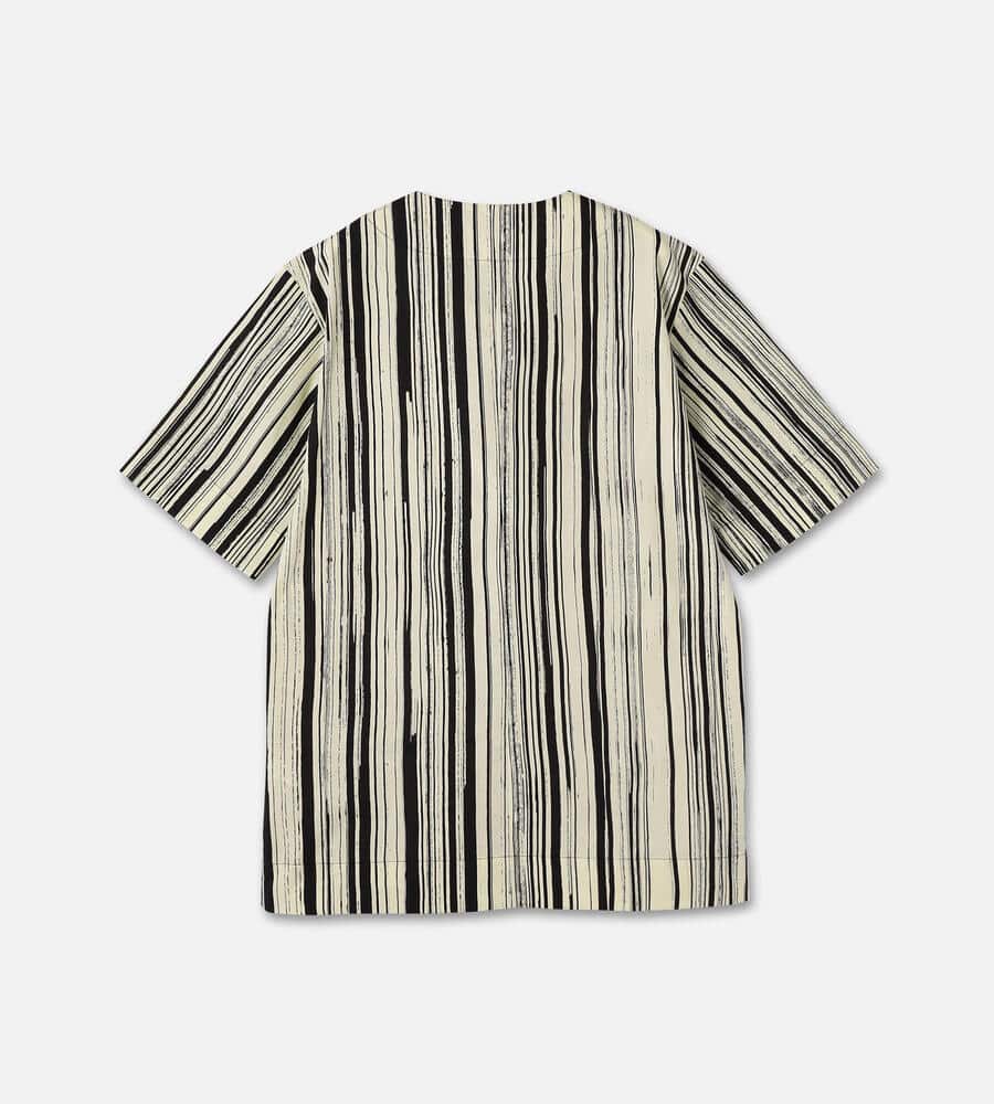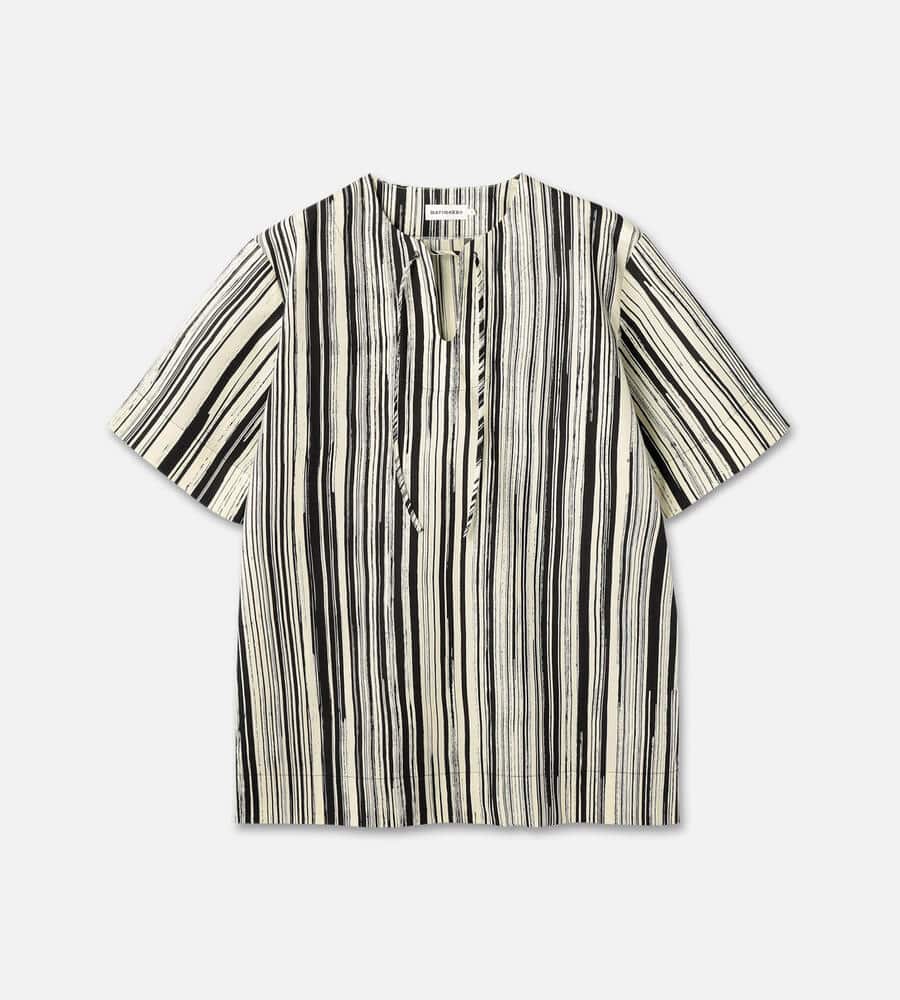 絵画のようなストライプ柄を配したSiluetti柄のプルオーバーブラウス。さらりとした風合いのコットン100%素材を使用。ストラップ付きのキーネックがデザインのポイントです。シルエットは全体的にゆとりをもたせ、ヒップが隠れる着丈に設定。お洒落を楽しみながら、さりげなく体型カバーも叶う一着です。