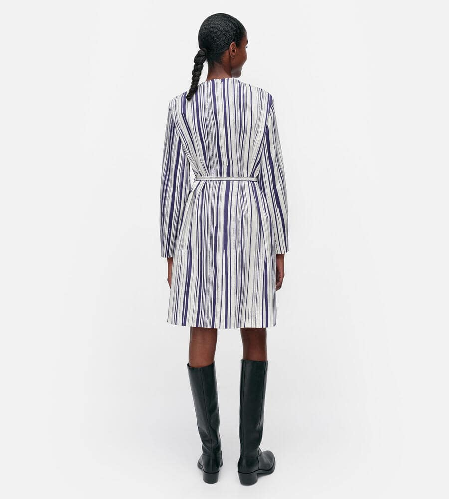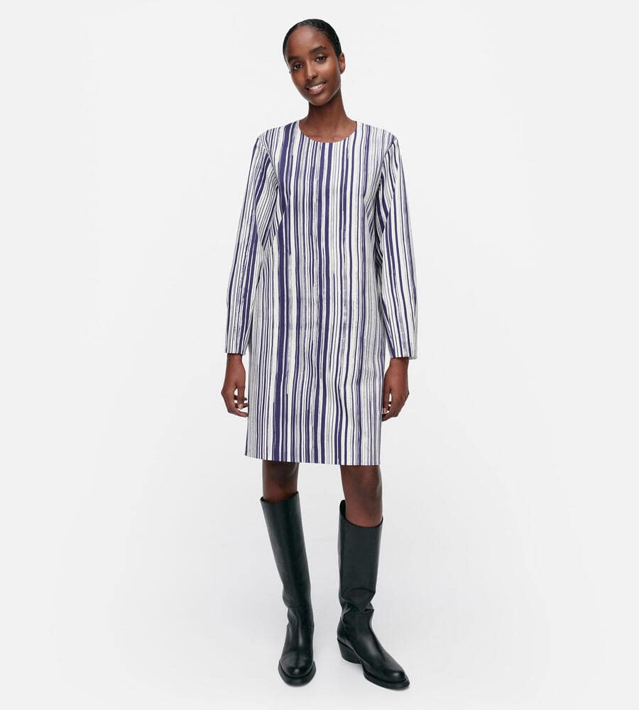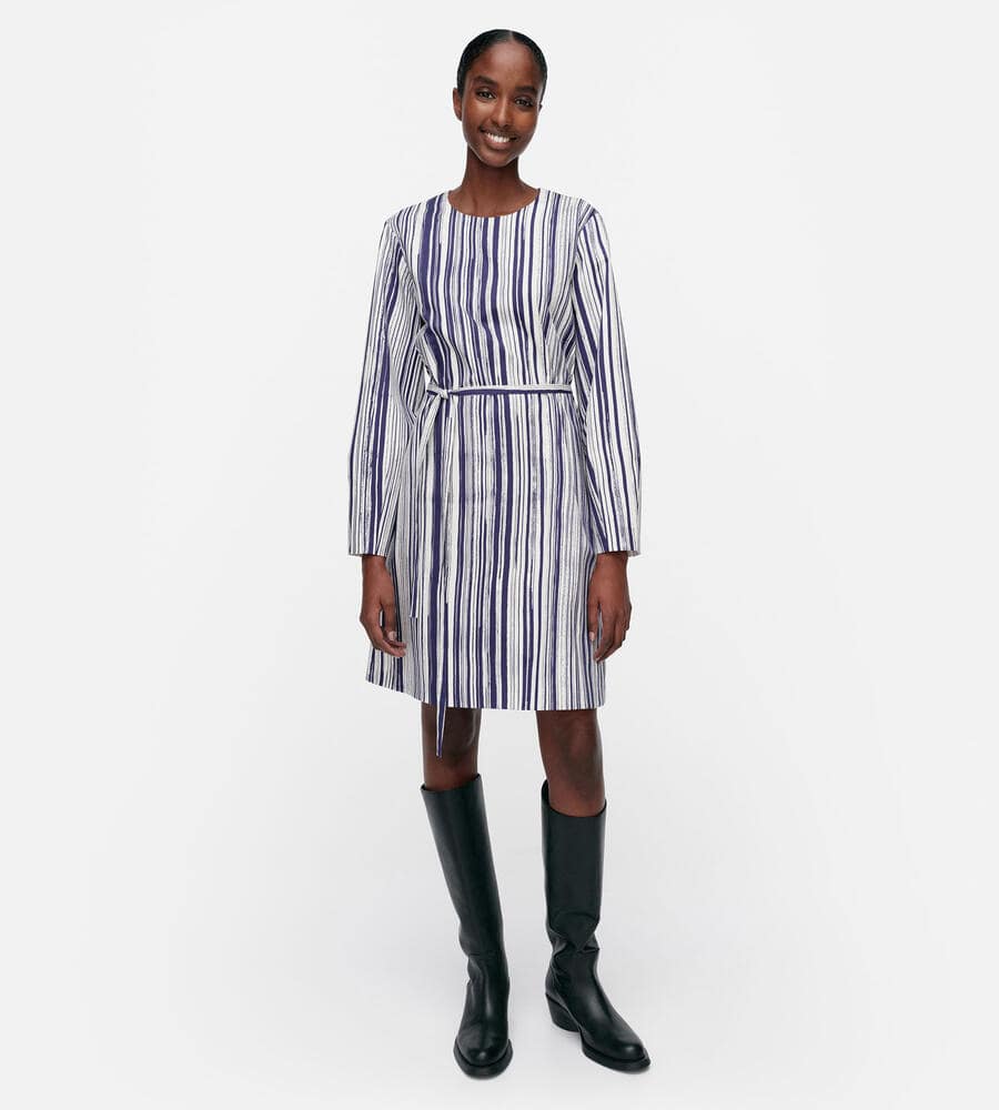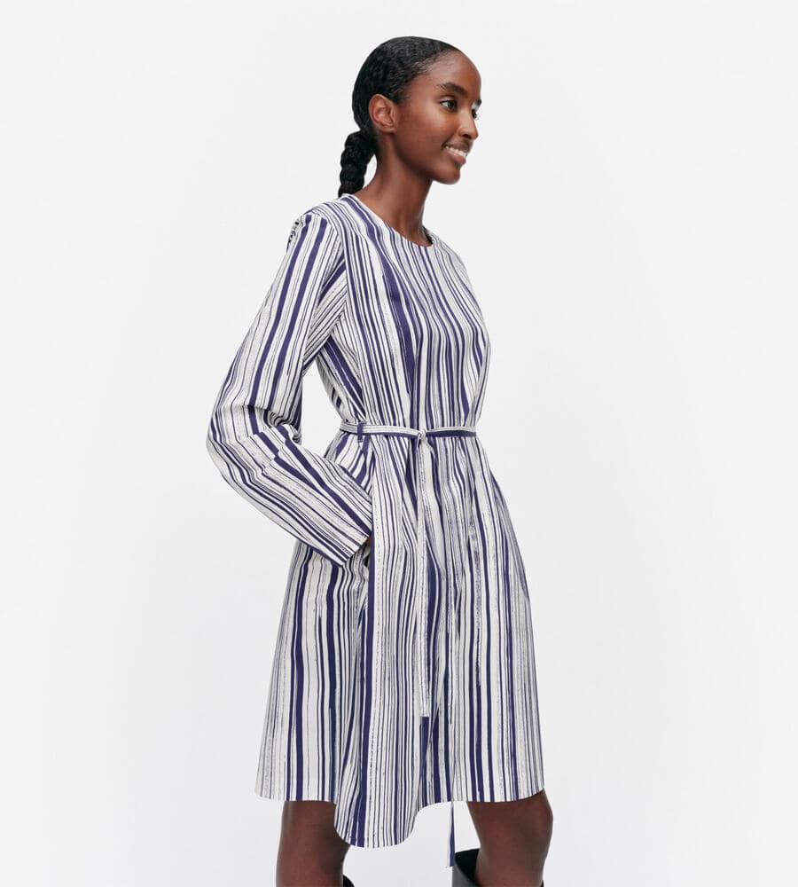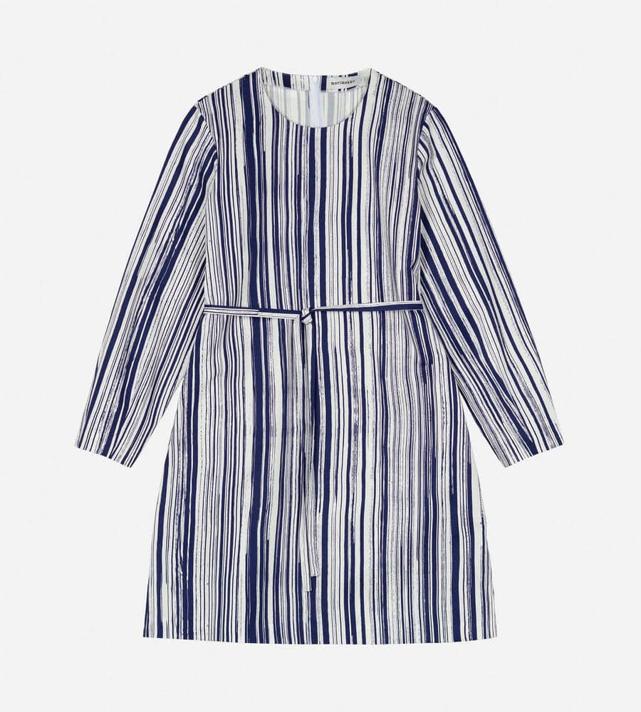 水平線上で空と海の色が溶け合う様子を表現したSiluetti柄の長袖ワンピース。長いストロークラインが美しい、ストライプ柄のグラフィカルなデザインが魅力。同布の細めのウエストベルトがメリハリのあるシルエット。便利なポケット付き。一枚でスタイリッシュなコーディネートが完成するアイテムです。
