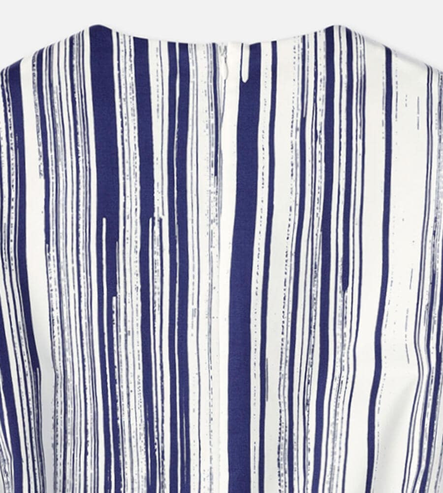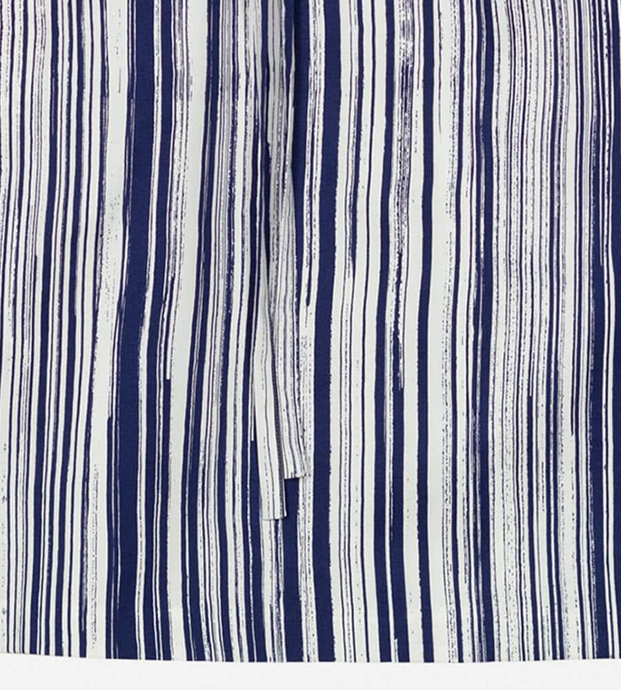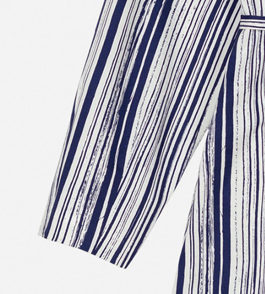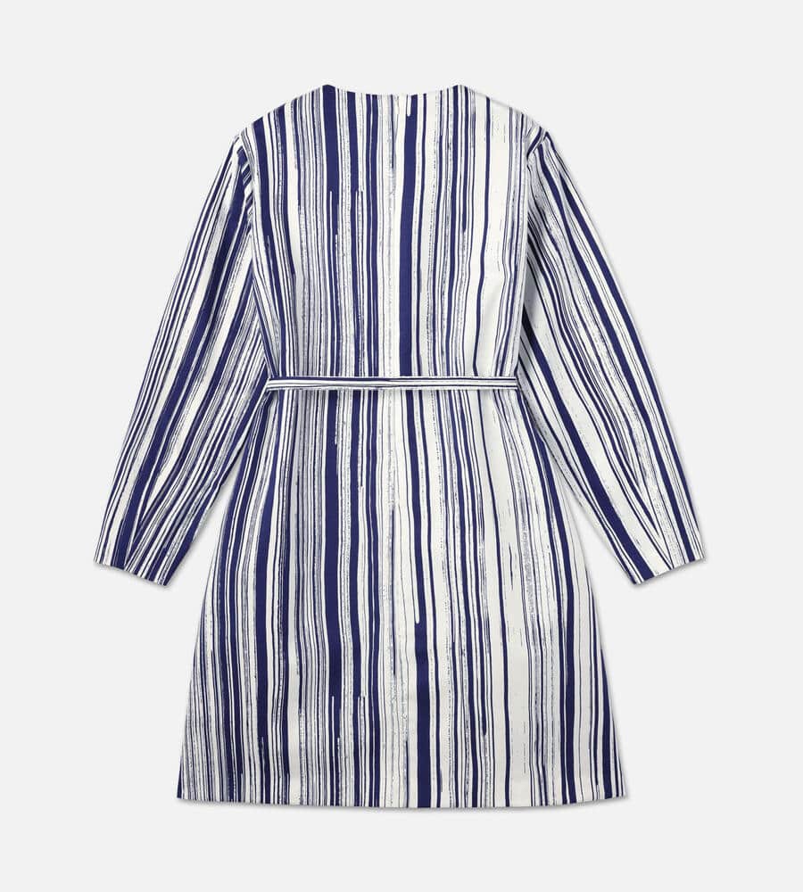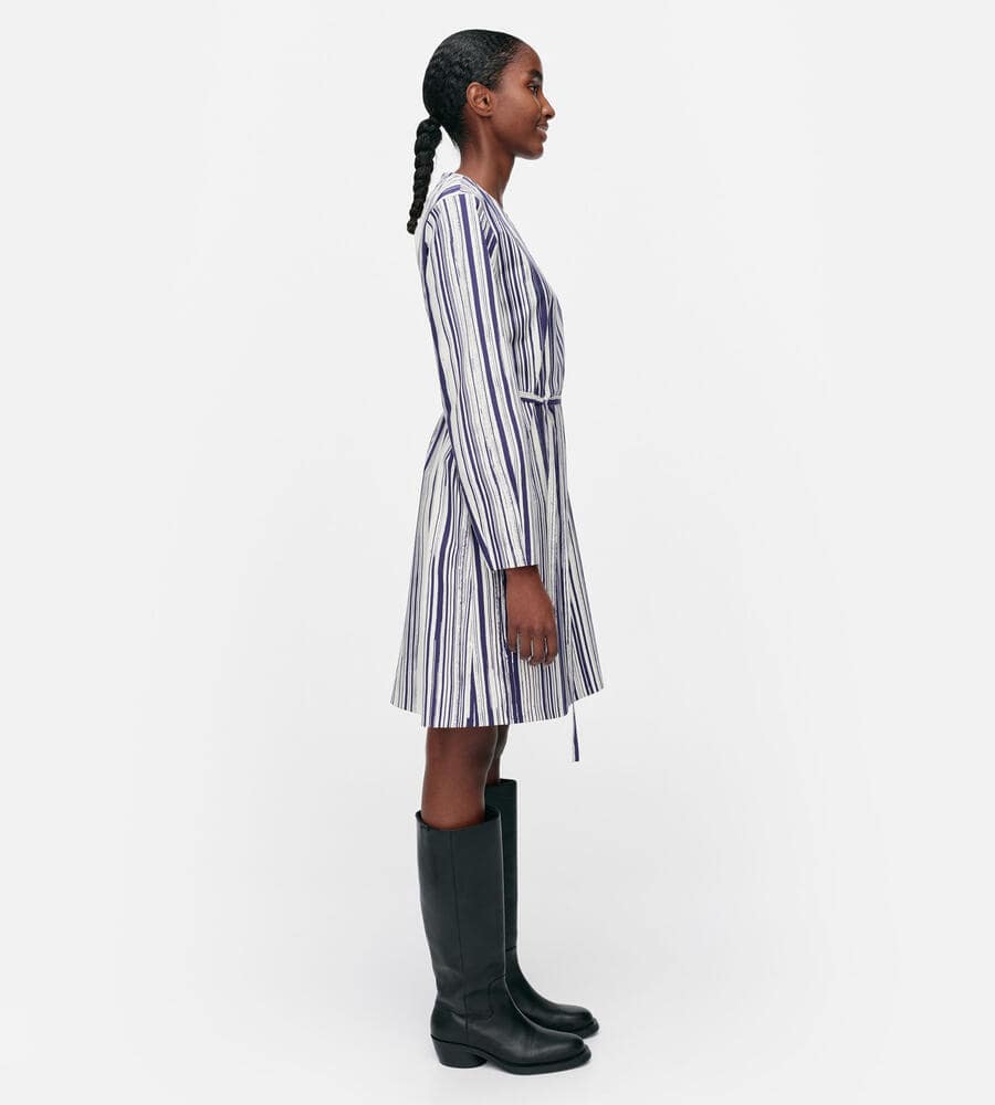 水平線上で空と海の色が溶け合う様子を表現したSiluetti柄の長袖ワンピース。長いストロークラインが美しい、ストライプ柄のグラフィカルなデザインが魅力。同布の細めのウエストベルトがメリハリのあるシルエット。便利なポケット付き。一枚でスタイリッシュなコーディネートが完成するアイテムです。