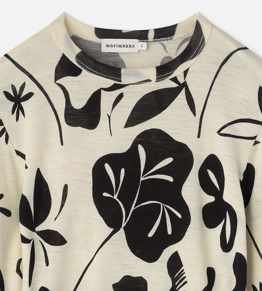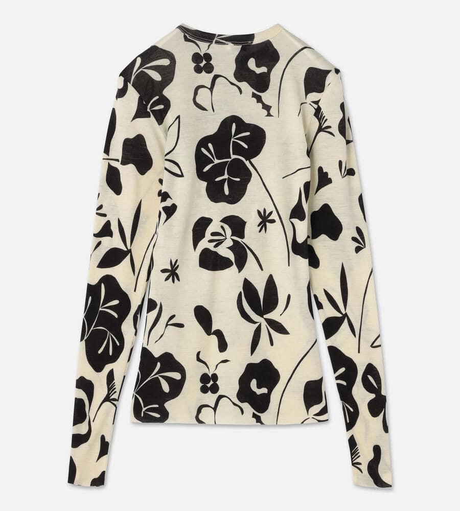 夜想曲と名付けられたボタニカルパターンを用いたカットソー。月明りに照らされたような夜の草原を描いた柄使いは大胆ながらもどこか心安らぐ印象です。ソフトで薄手のウールを用いたニットは、肌当たりの良さも満点。フィット感もあり、すっきりと着こなせるアイテムです。ジャケットのインナーなどにも活躍します。