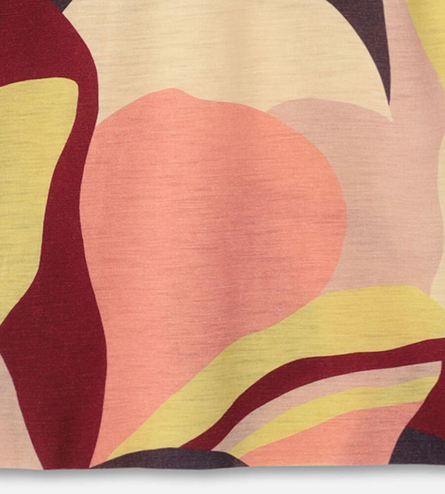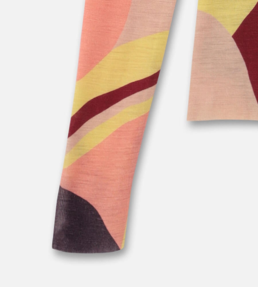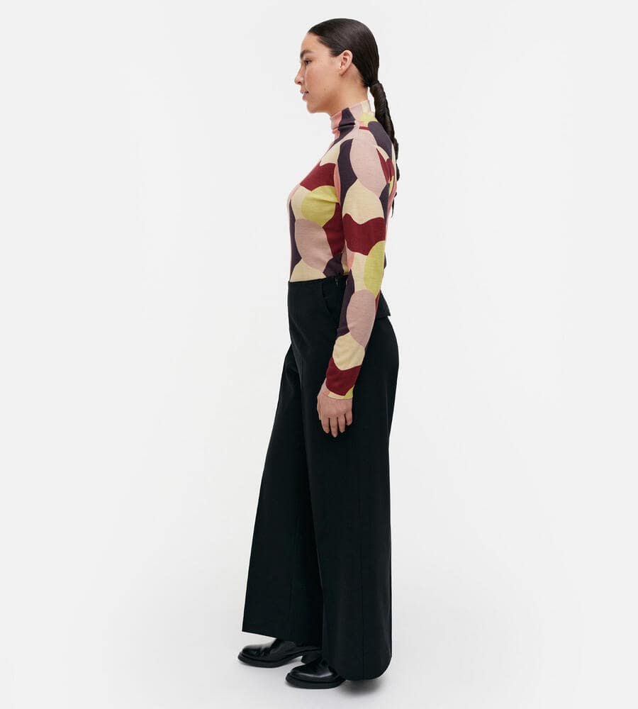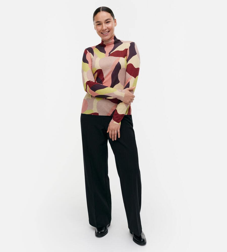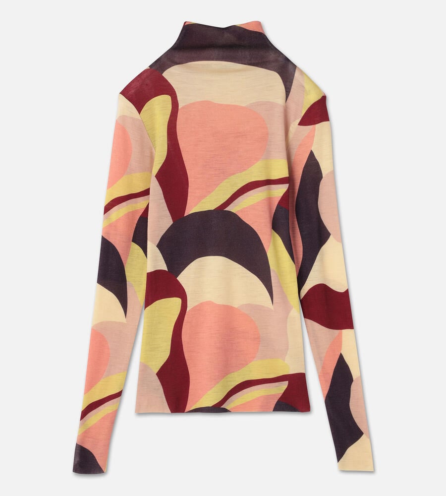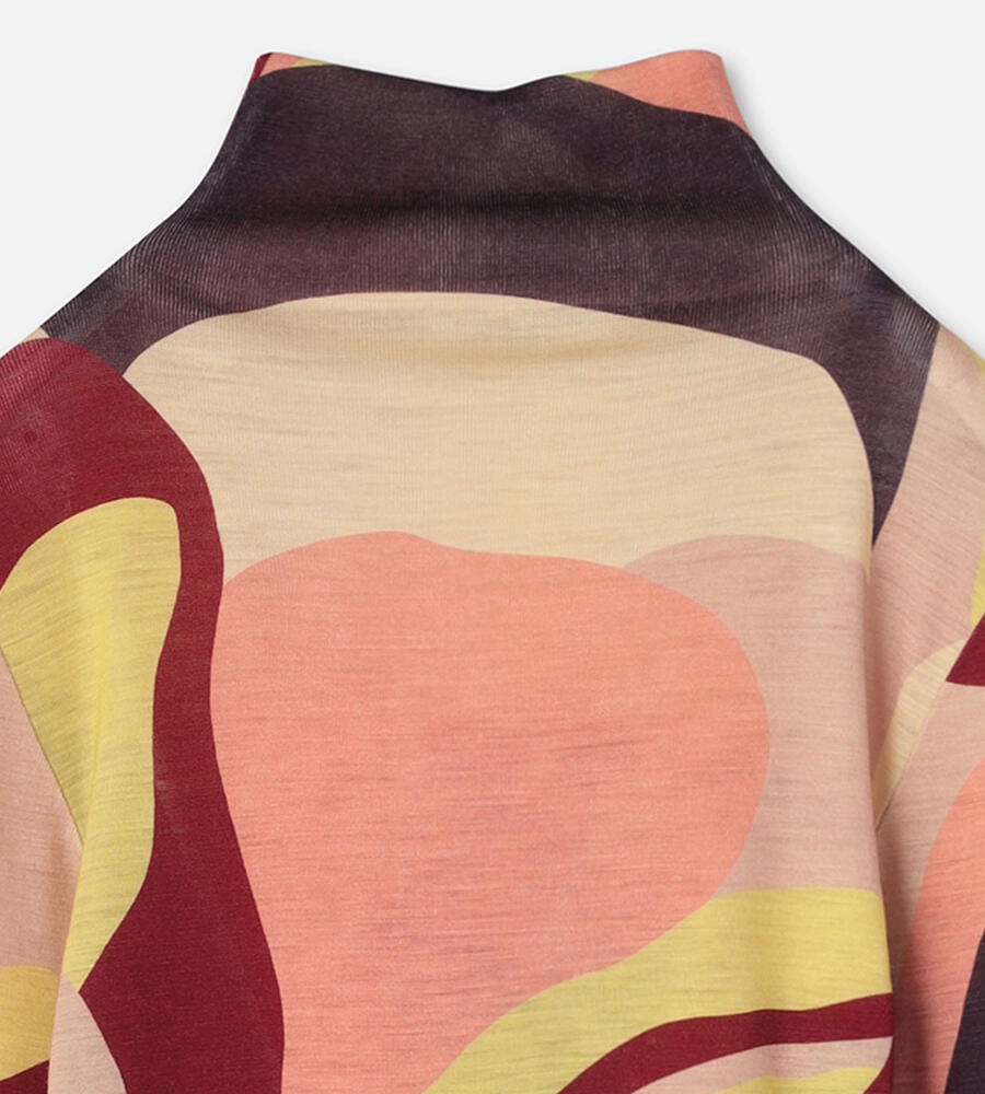 カメリアの花を抽象的なアプローチで表現したパターンのハイネックトップス。薄手で軽やかなニット素材は、フィット感の良さも満点です。ネックラインは切り替えず、身頃と同一のパターンにすることで、すっきりとしたモードな印象に仕上げています。ジャケットのインナーなどにも活躍するアイテムです。