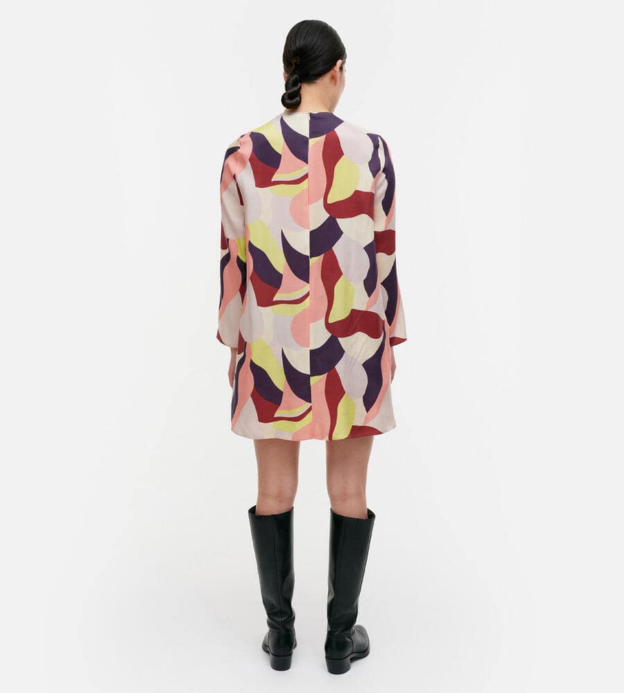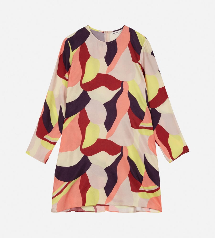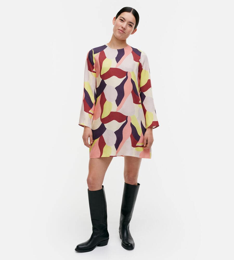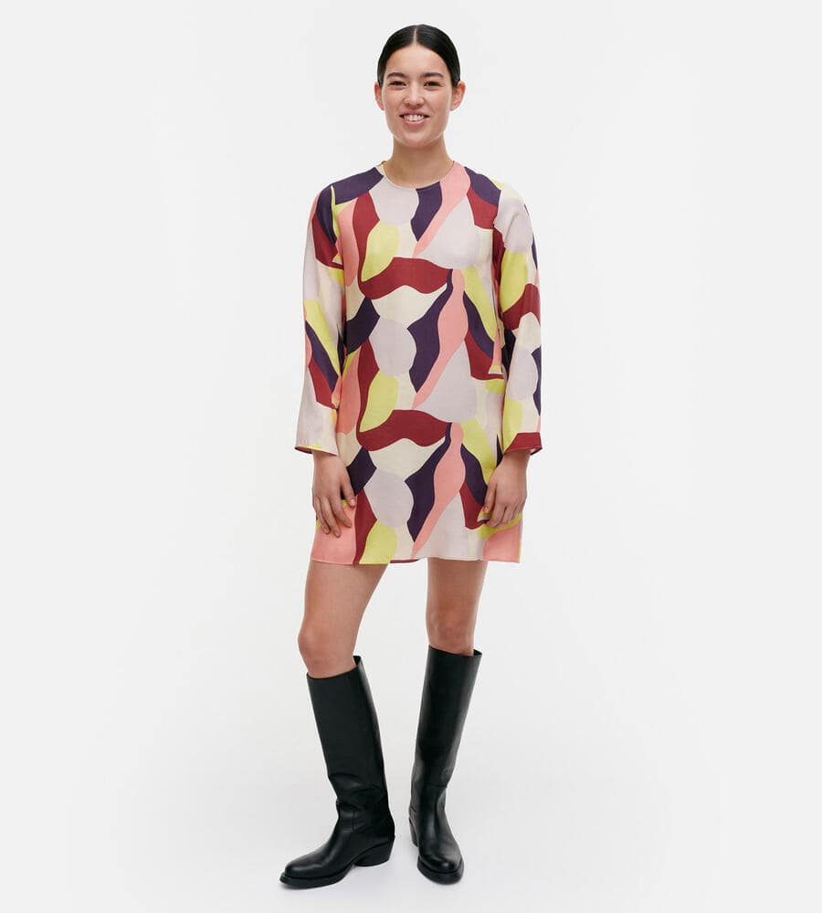 グラフィカルでカラフルなKamelia柄の長袖ワンピース。スタイリッシュなテキスタイル柄が印象的なデザイン。すっきりとしたラウンドネック。裾に向かって広がるAラインのシルエットがフェミニンなポイント。便利なサイドシームポケット付き。一枚で華やかなお出かけコーディネートが完成するアイテムです。