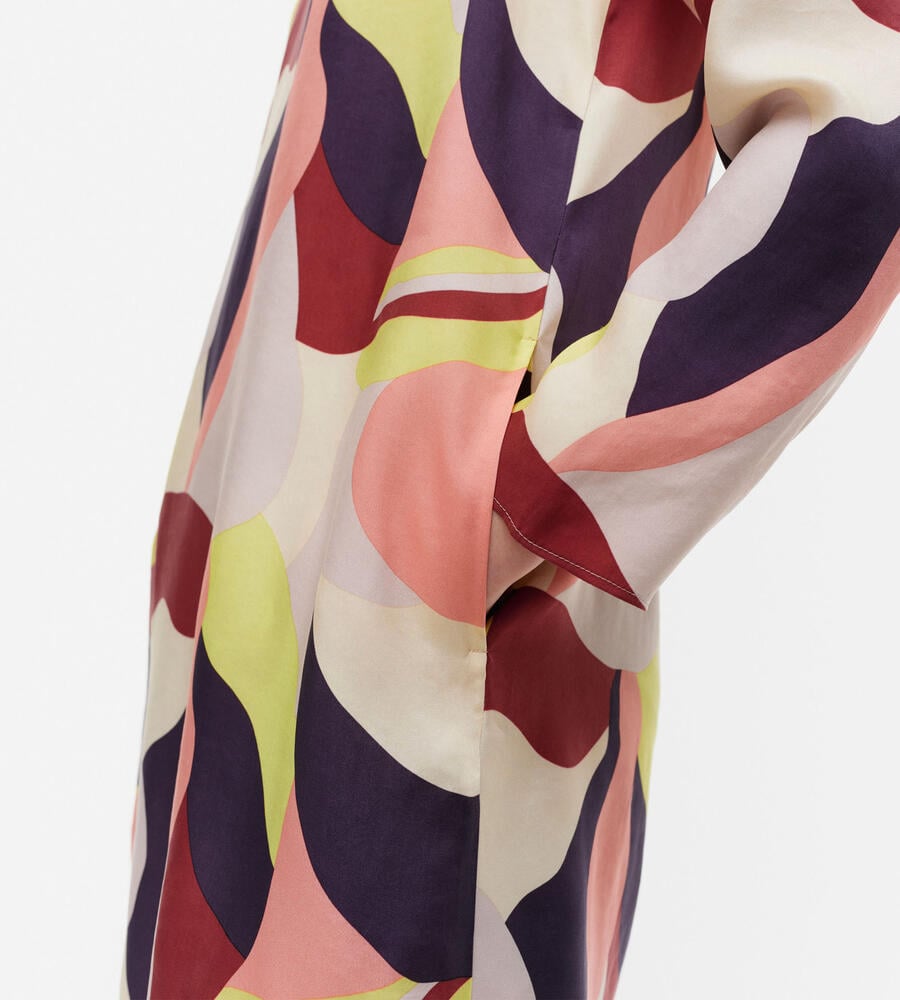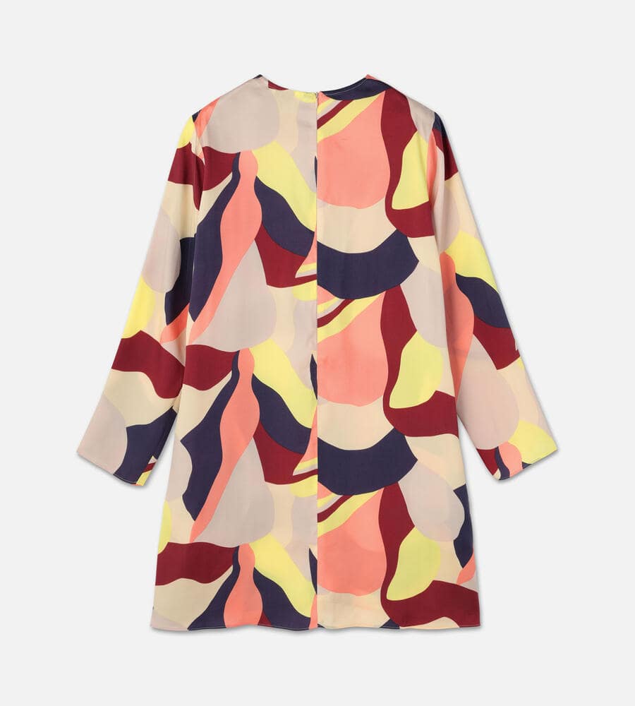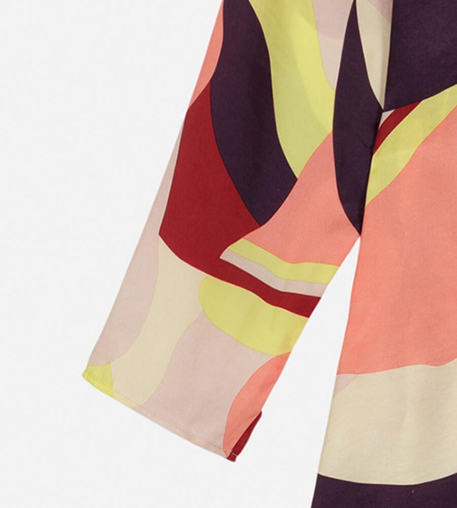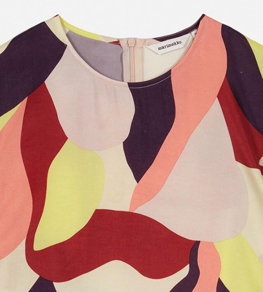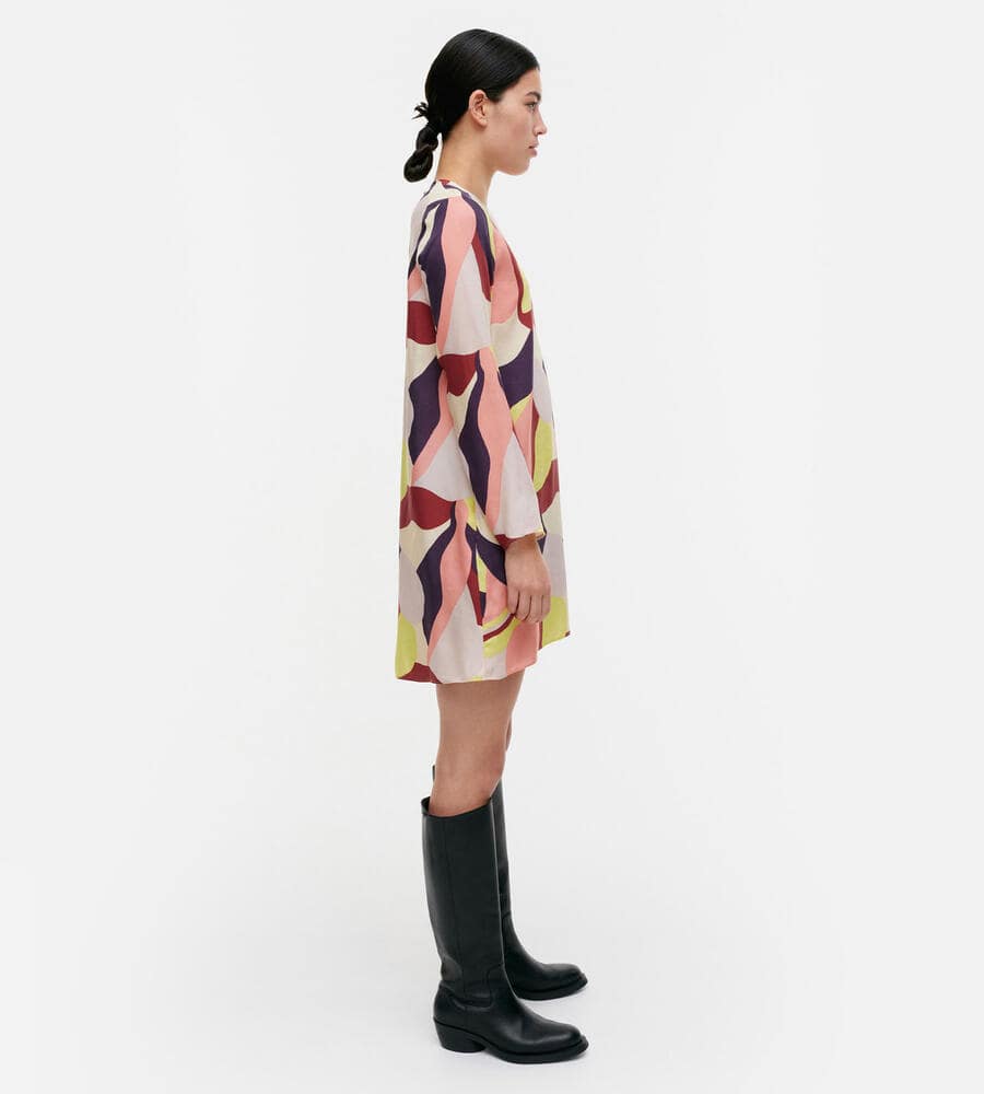 グラフィカルでカラフルなKamelia柄の長袖ワンピース。スタイリッシュなテキスタイル柄が印象的なデザイン。すっきりとしたラウンドネック。裾に向かって広がるAラインのシルエットがフェミニンなポイント。便利なサイドシームポケット付き。一枚で華やかなお出かけコーディネートが完成するアイテムです。