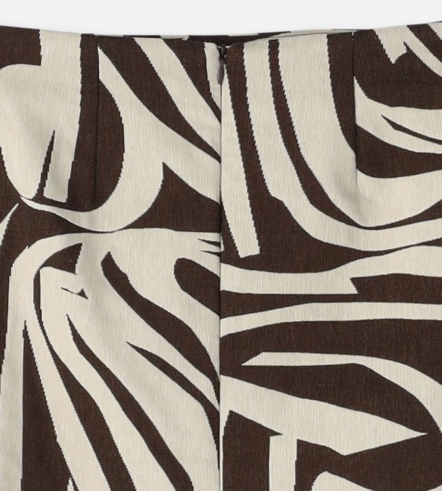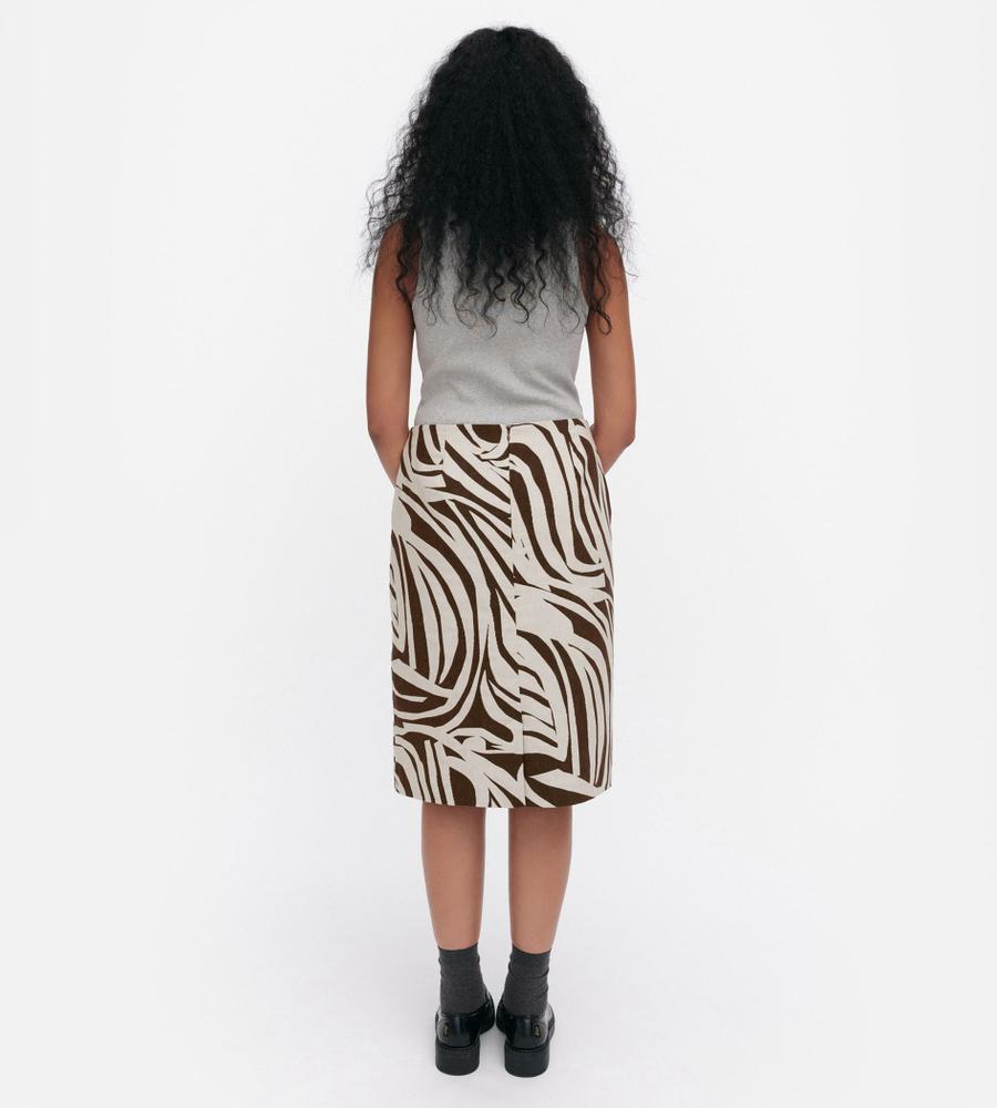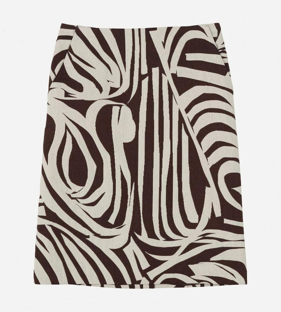 スパイシーでいてどこか優雅な総柄スカート。さりげなく広がるセミタイトなフォルムは、着痩せ効果も抜群です。トップスインして着こなせば、メリハリのあるスタイリングを楽しめそう。