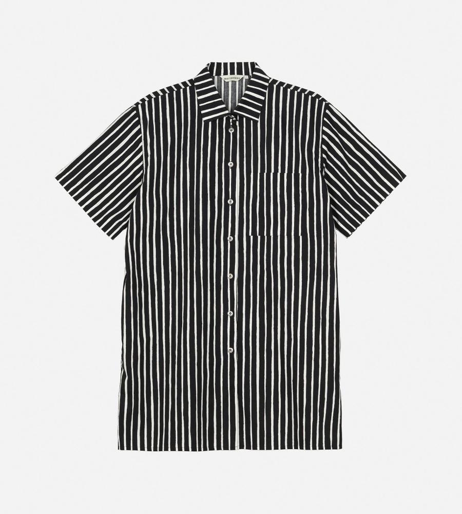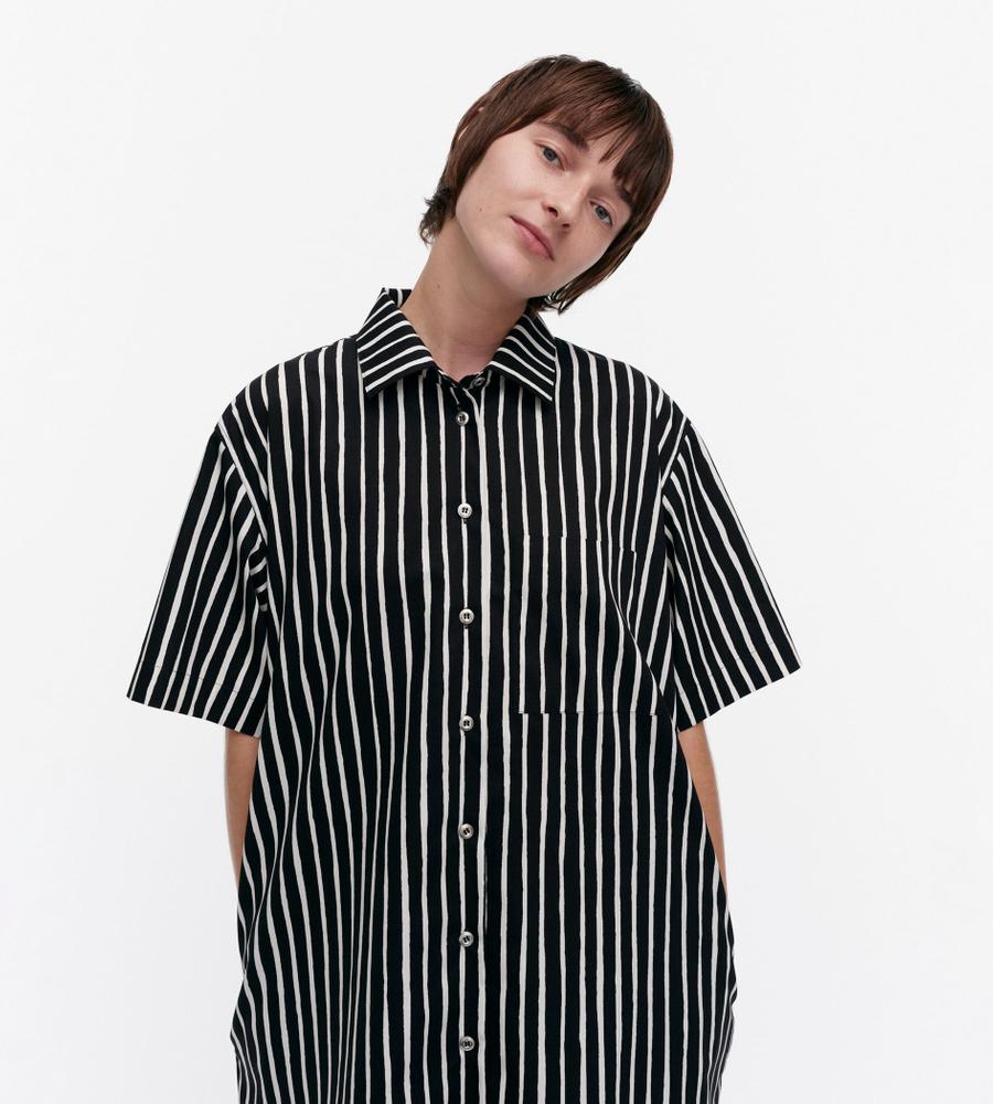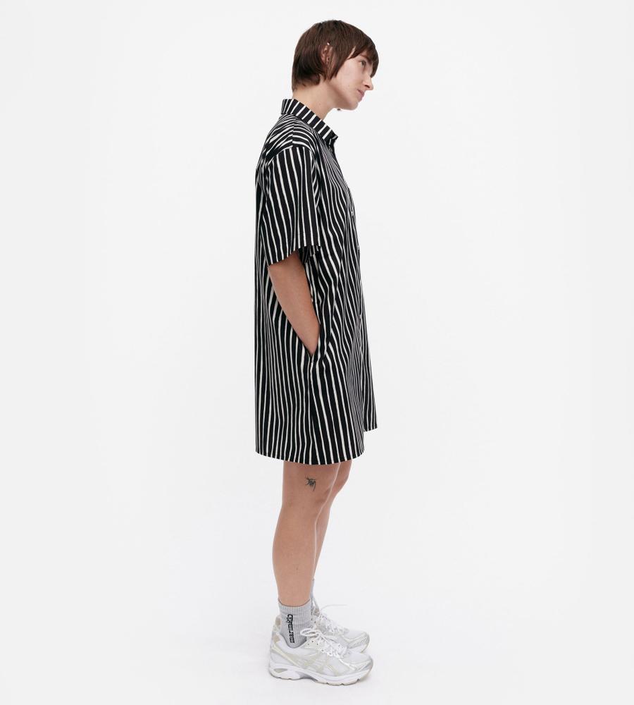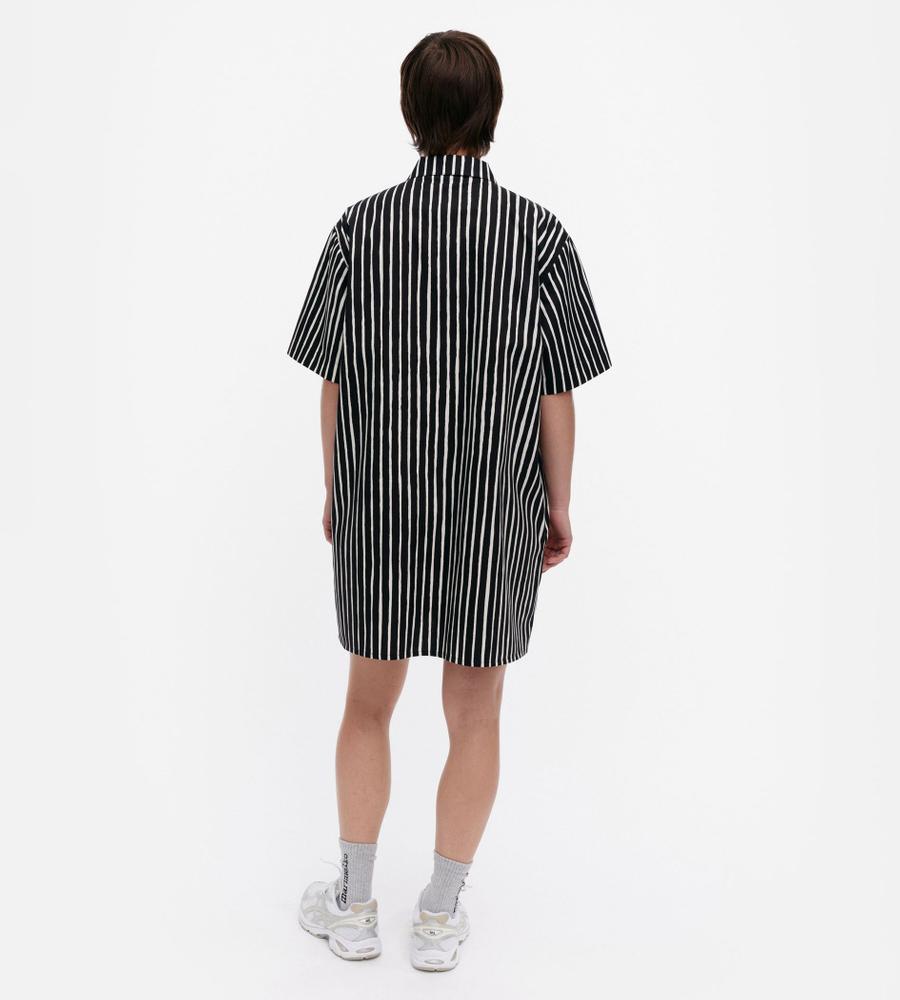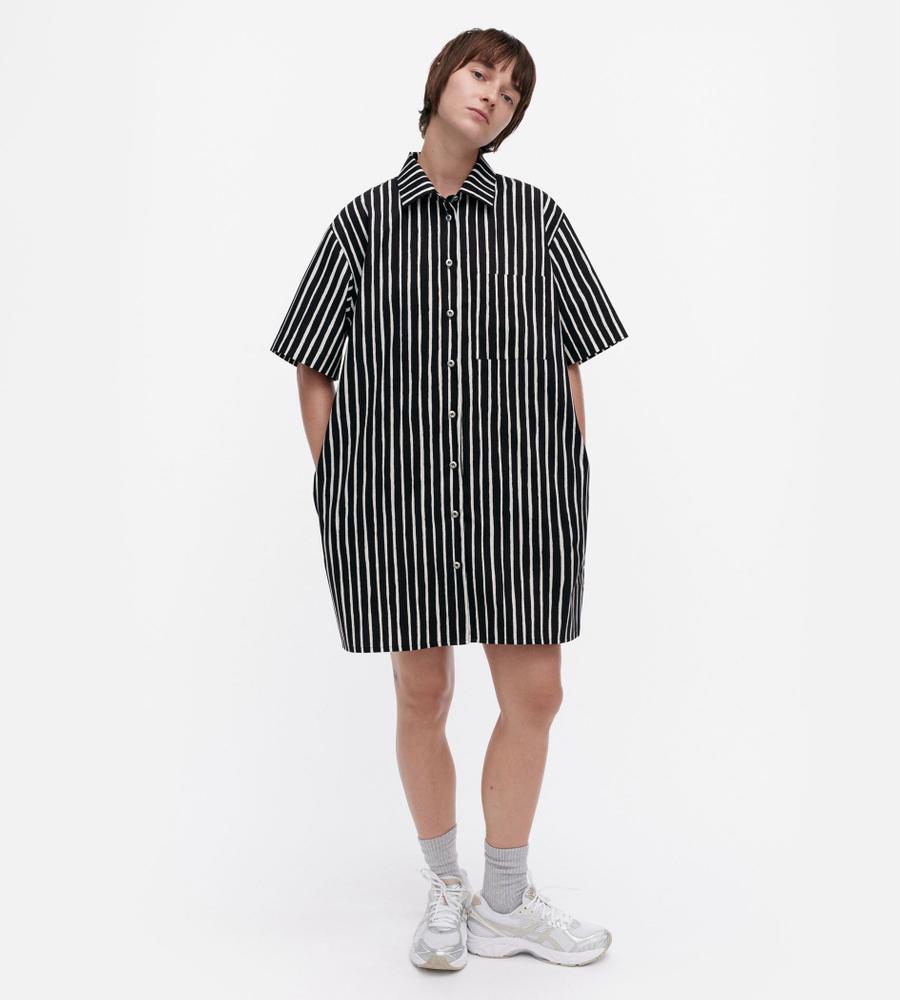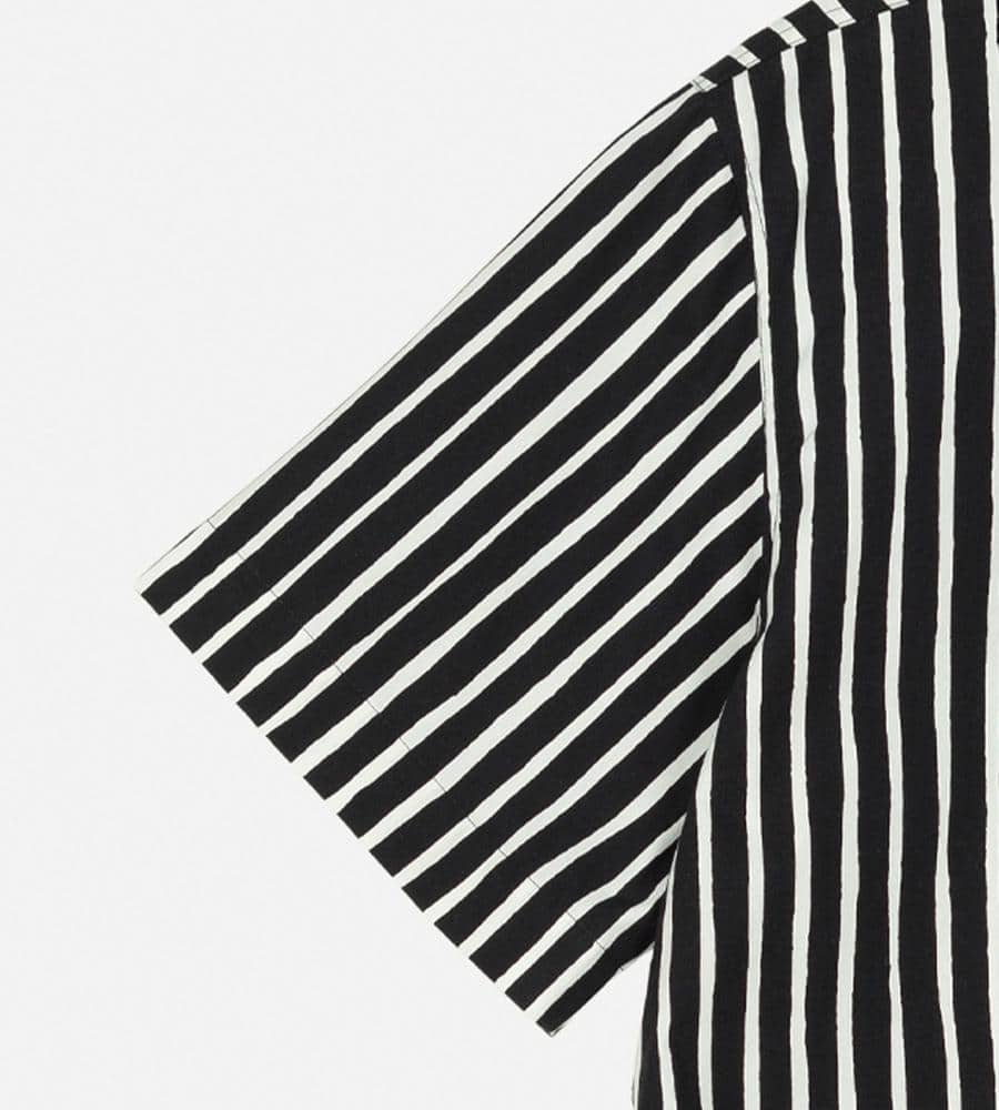 モダンな印象で着こなせるブラック×ホワイトのJokapoikaワンピース。ランダムストライプのPiccolo柄、コットン100%素材を採用しています。サイドにはポケットを配置。リラックスムード漂うボックスシルエットは1枚でさらりと着こなすのがおすすめです。