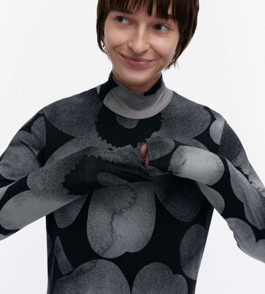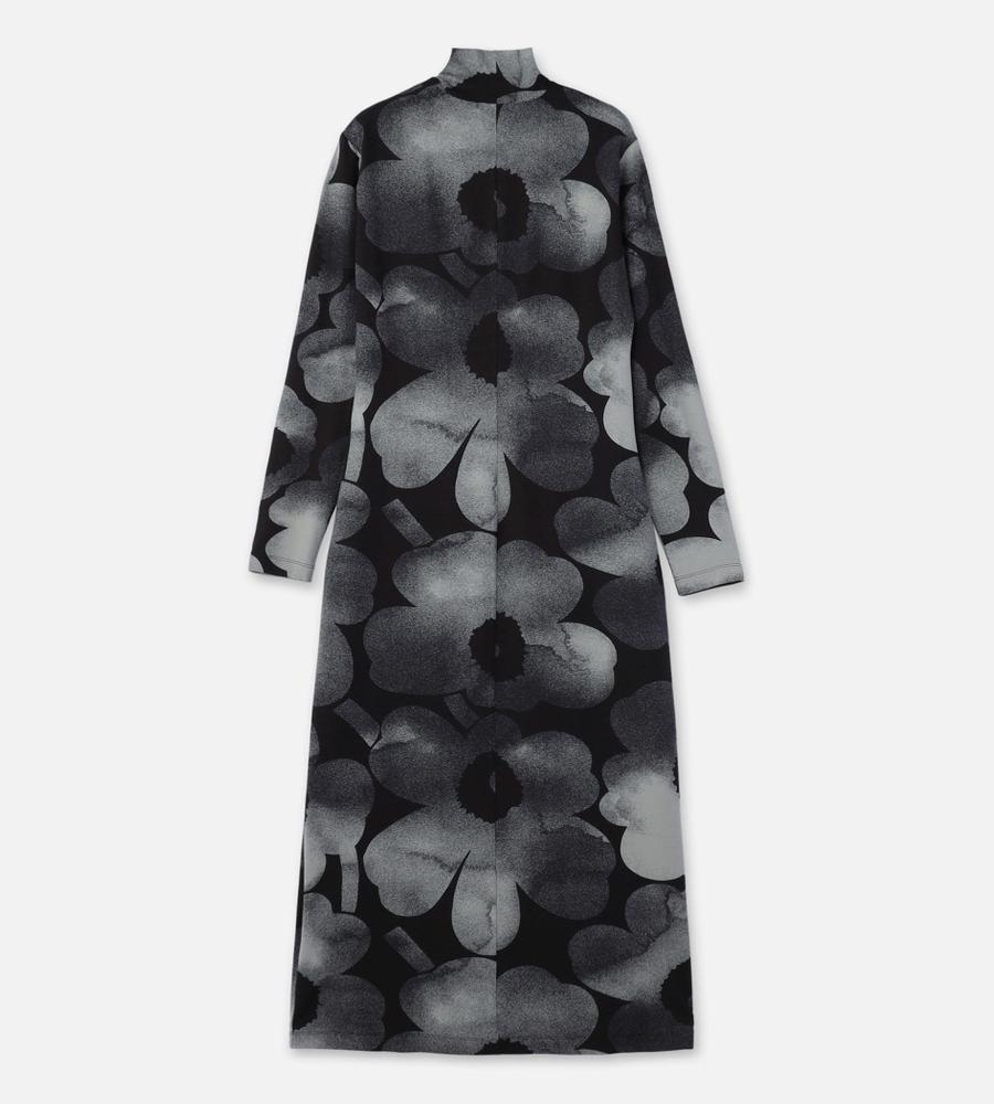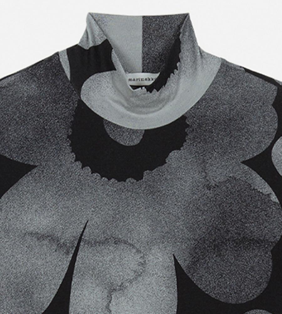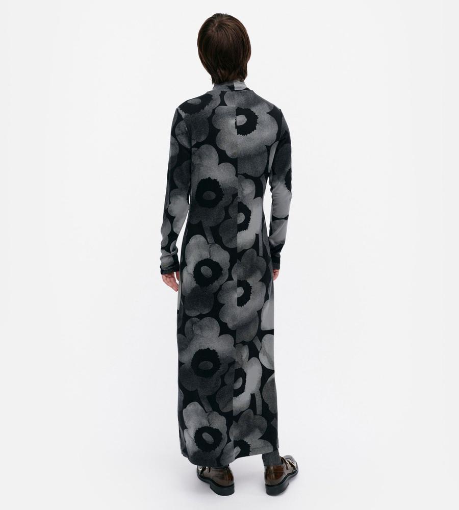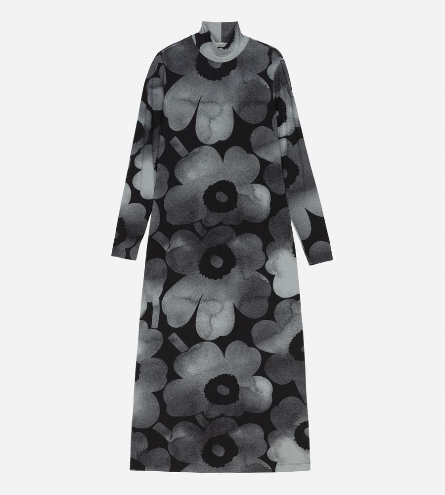 シックなUnikko柄が視線を集めるワンピース。ボディラインに寄り添うシルエットやマキシ丈で、大人っぽくエレガントな装いが可能に。なめらかなレーヨン素材にストレッチを加えて、着心地良く仕上げています。
