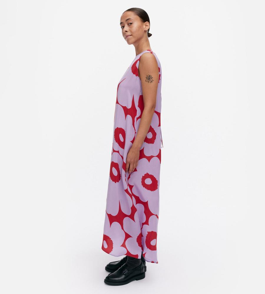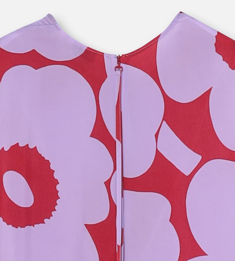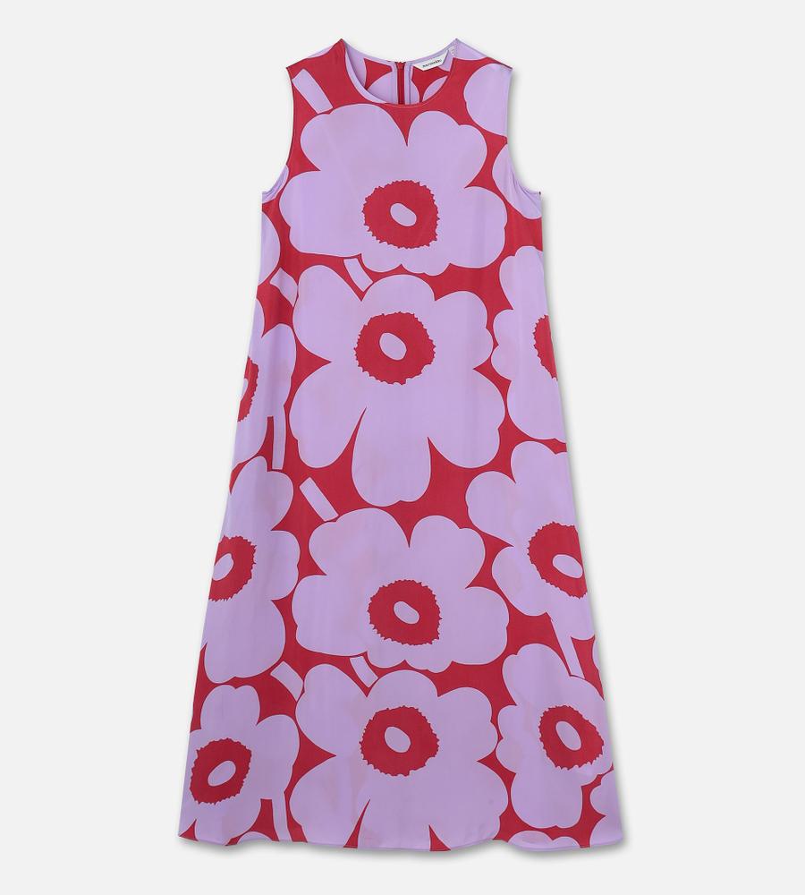 大胆かつ鮮やかな色使いで視線を誘うUnikko柄のワンピース。滑らかな落ち感のあるキュプラ素材で、綺麗なドレープを描き出す1点です。肩まわりはすっきりとしており、ジャケットなどを羽織るスタイリングにも活躍。背面のジップに添えた長いストラップもモダンなアクセントになっています。