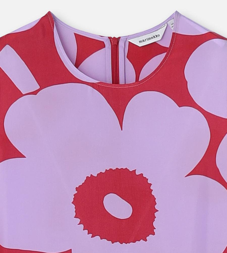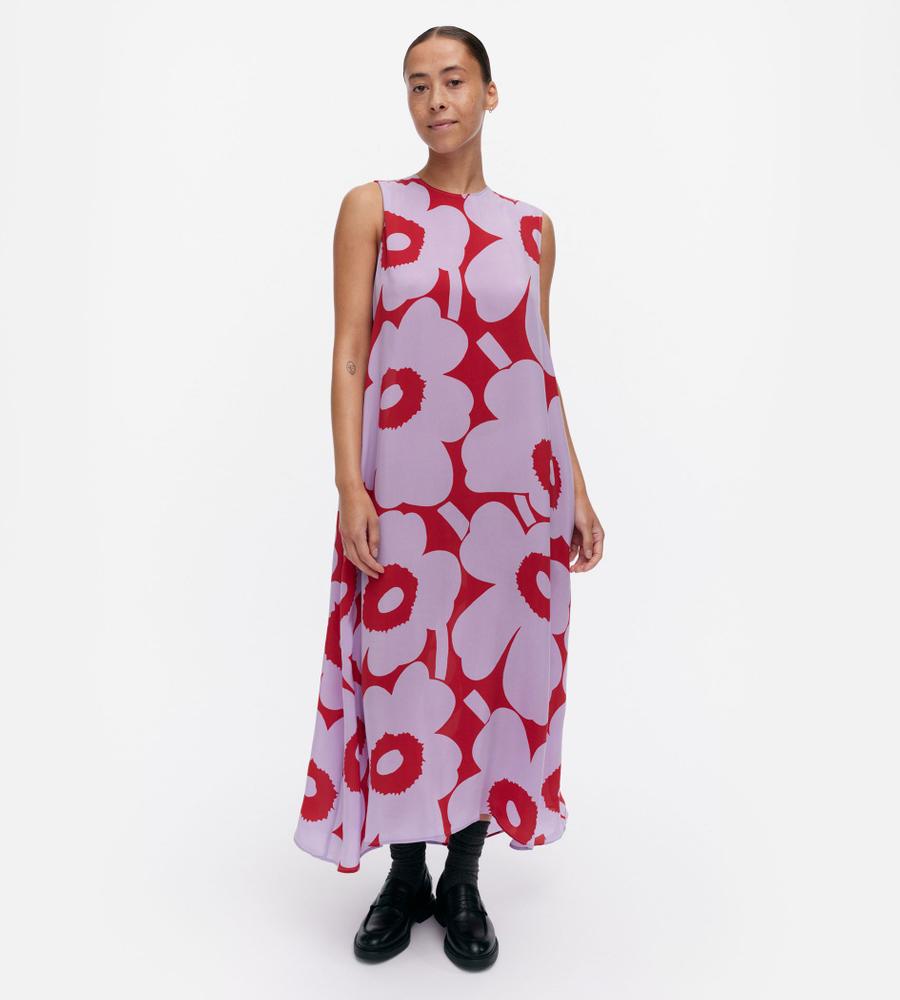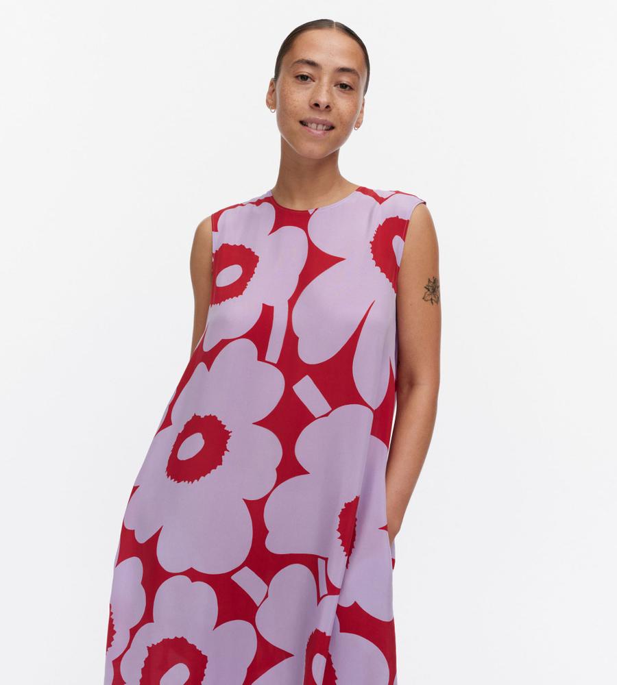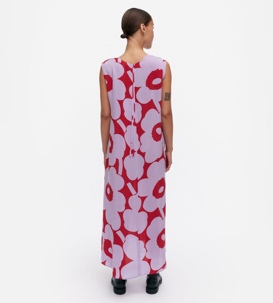 大胆かつ鮮やかな色使いで視線を誘うUnikko柄のワンピース。滑らかな落ち感のあるキュプラ素材で、綺麗なドレープを描き出す1点です。肩まわりはすっきりとしており、ジャケットなどを羽織るスタイリングにも活躍。背面のジップに添えた長いストラップもモダンなアクセントになっています。