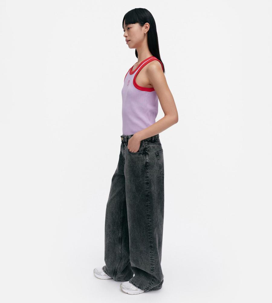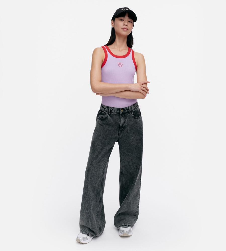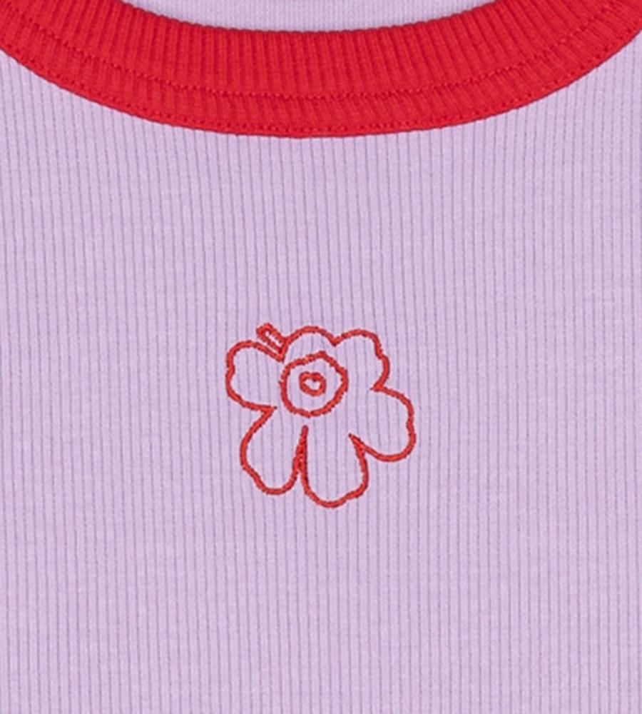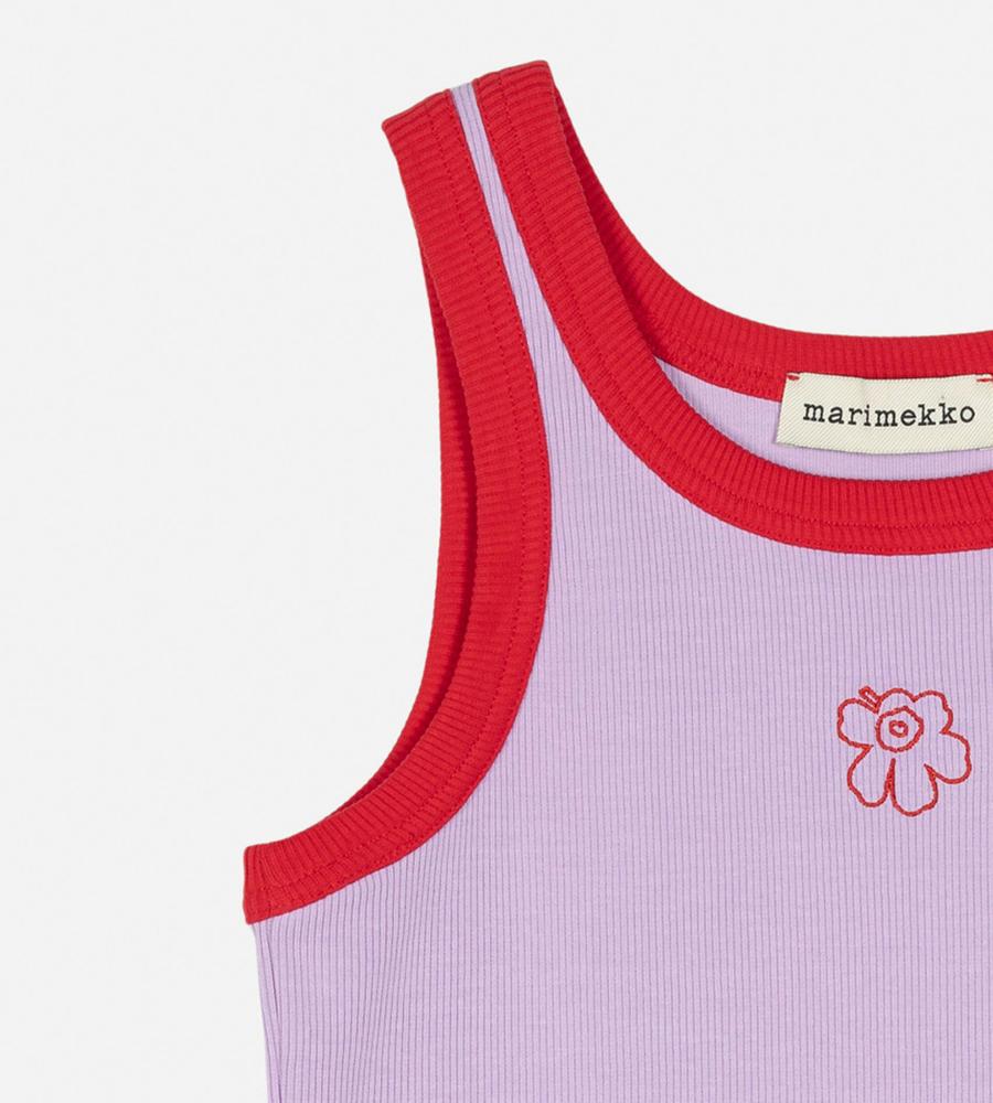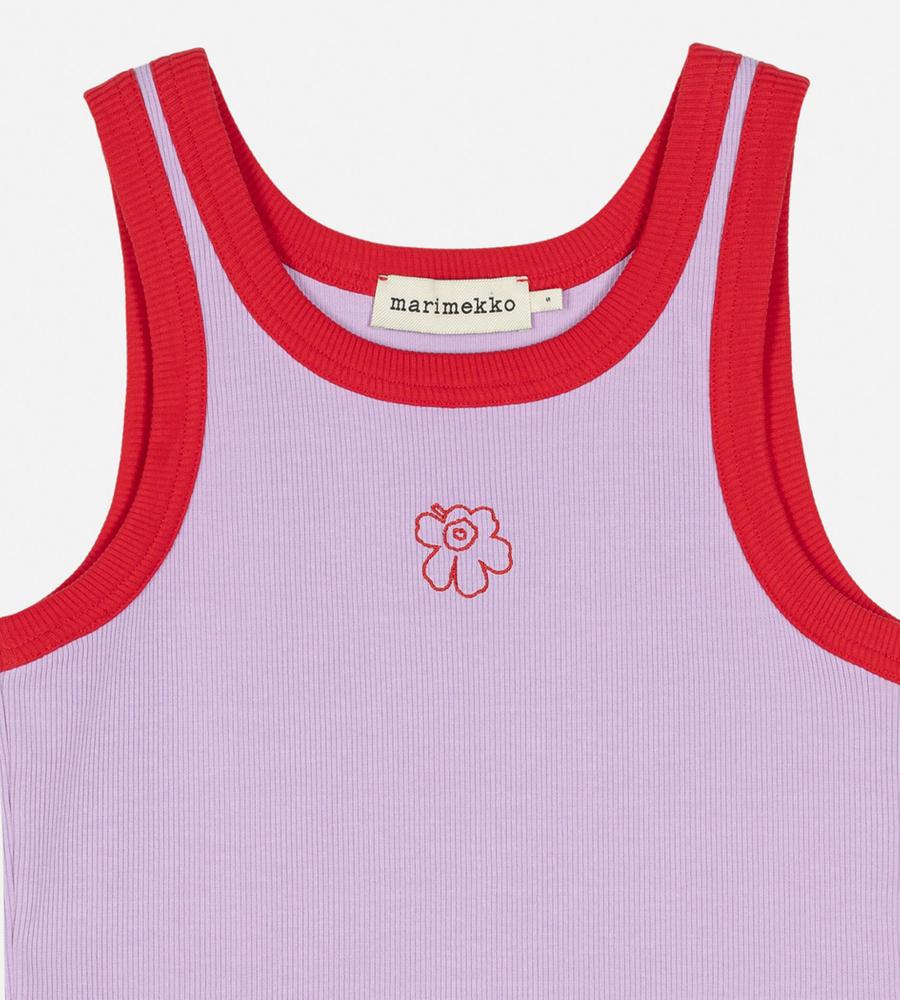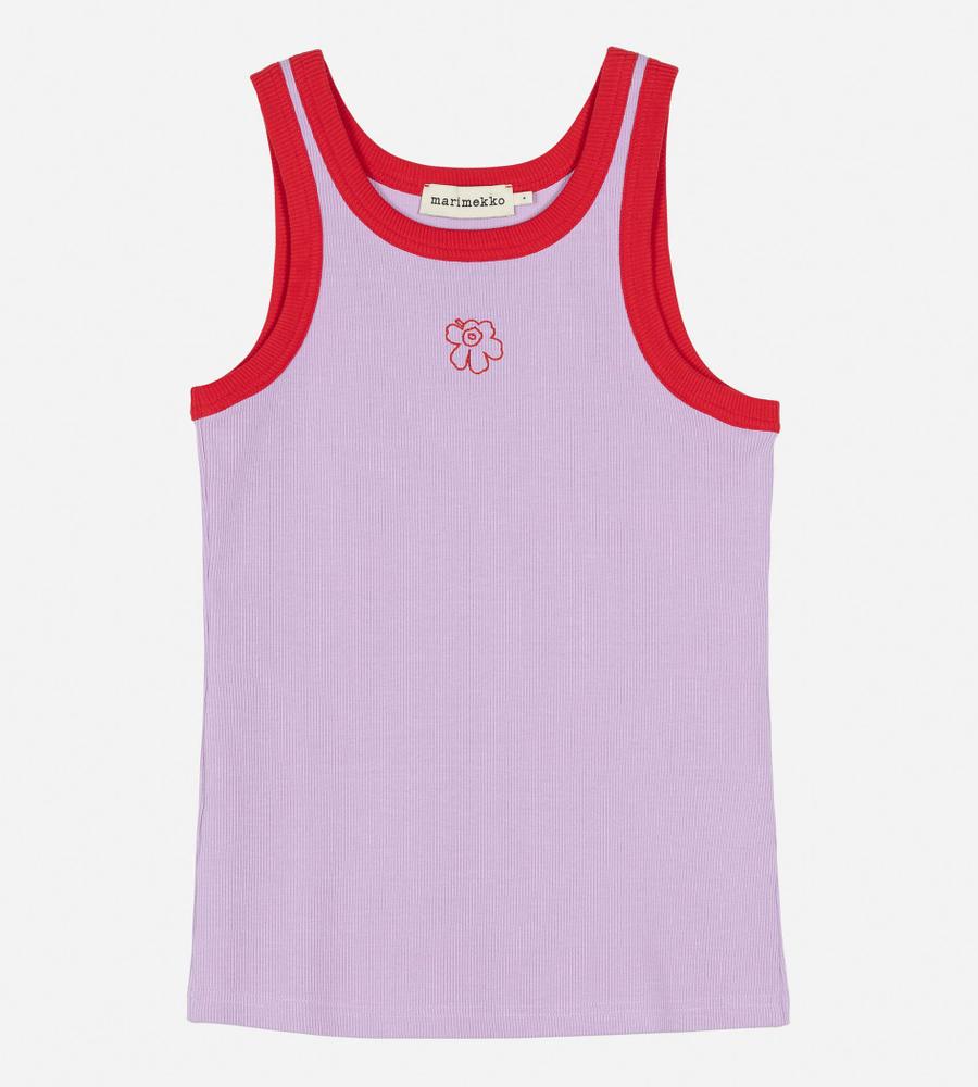 ライラック×レッドのカラーコンビで仕上げたSurreaタンクトップ。コットンとポリウレタンのブレンド素材を採用しており、胸もとにはウニッコ柄を添えてワンポイントに。ボディにフィットするスキニータイプは、インナーとしても活躍します。