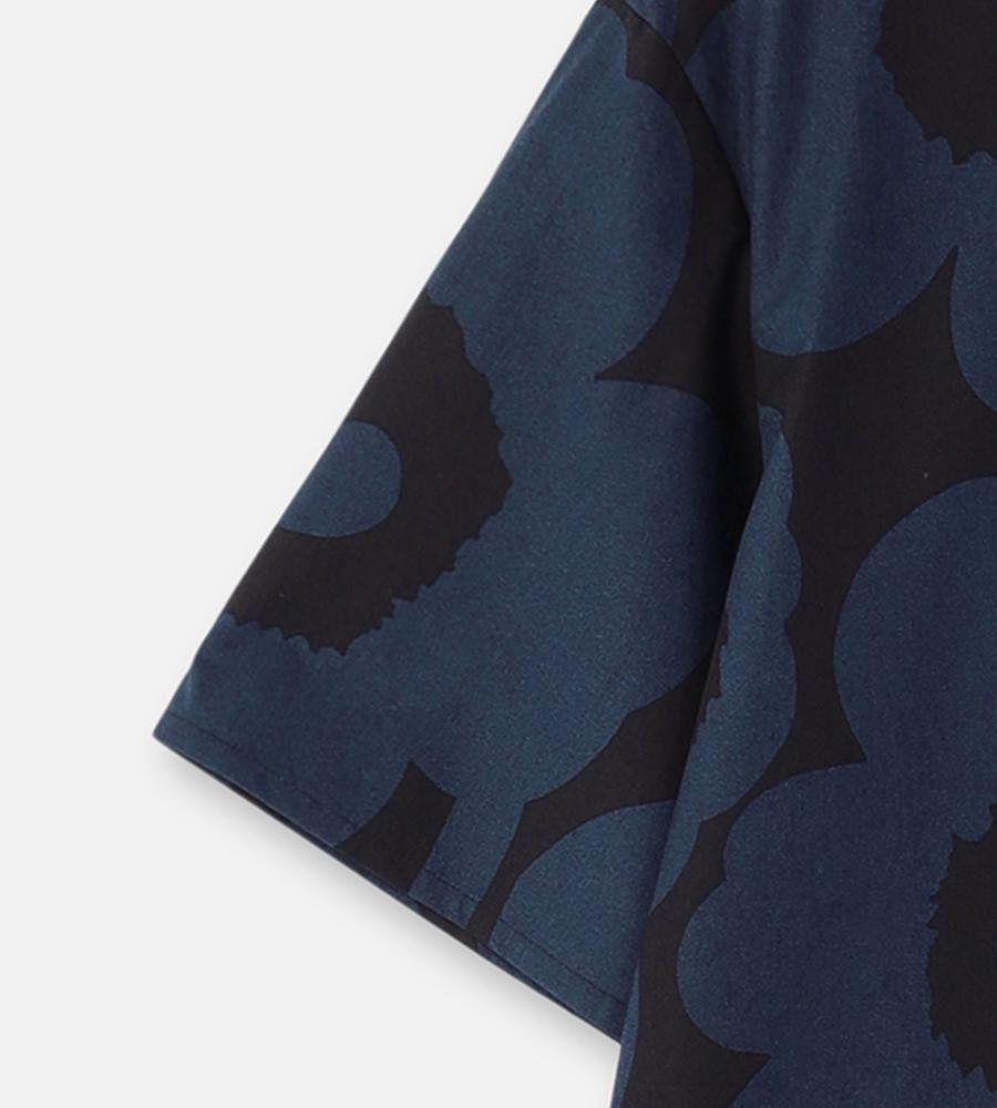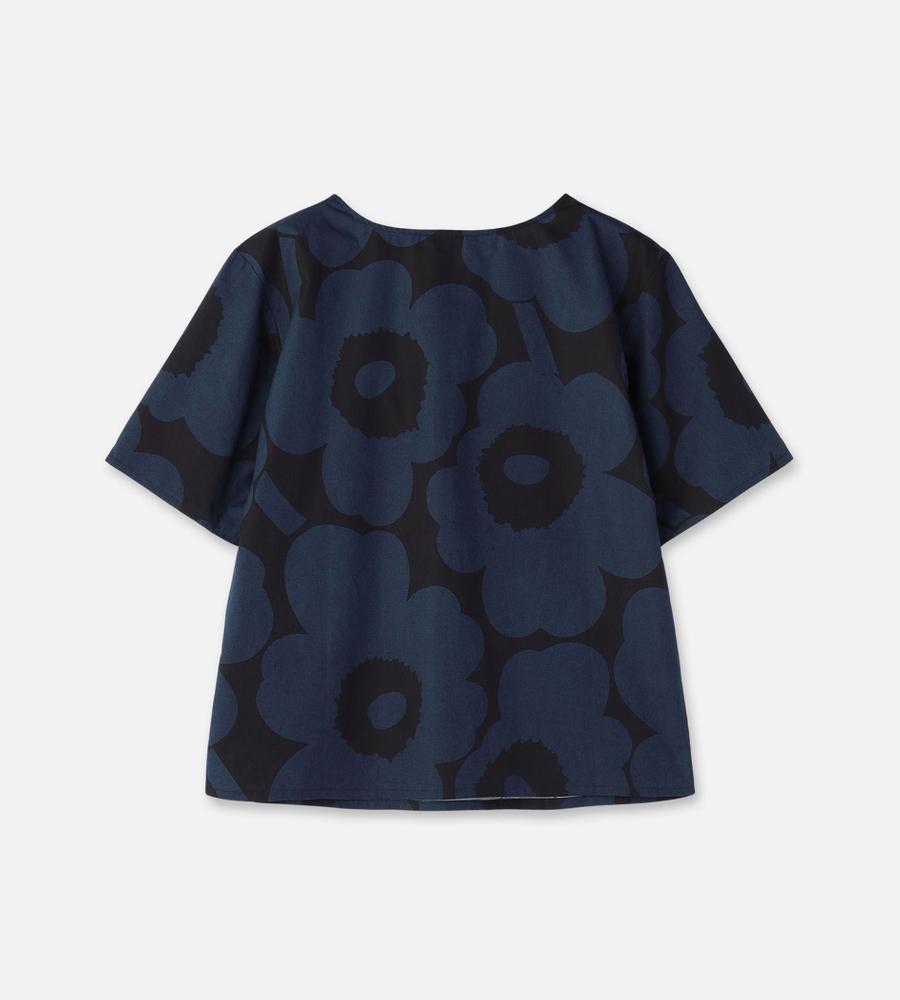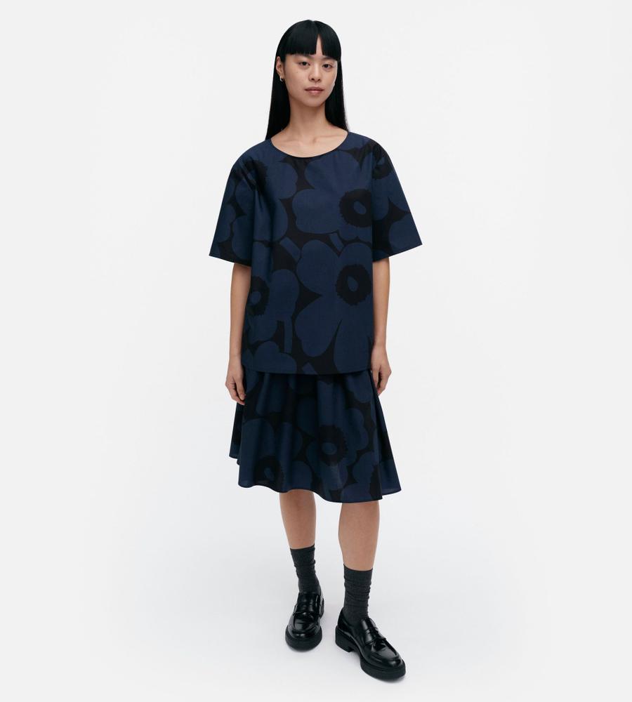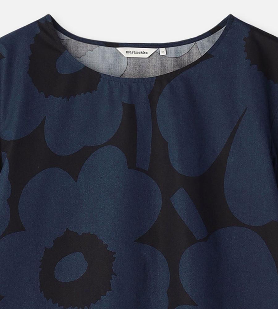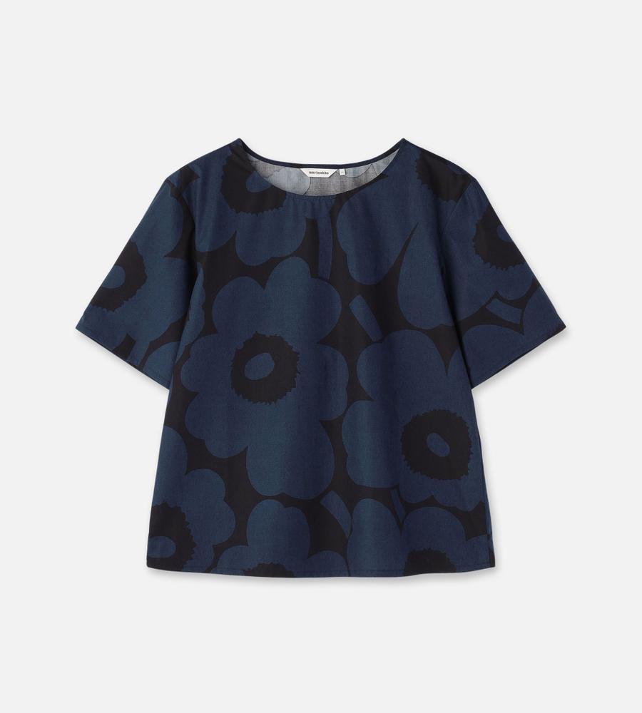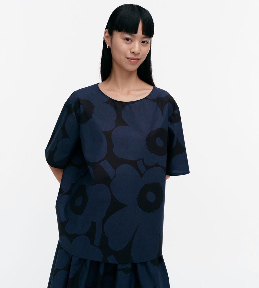 さらりと着こなせるUnikko柄のコットンブラウス。ややフレアになったシルエットは、リラックス感があって着痩せもするのがうれしい。やや広めの衿ぐりで、パンツを合わせても女性らしく着こなせます。