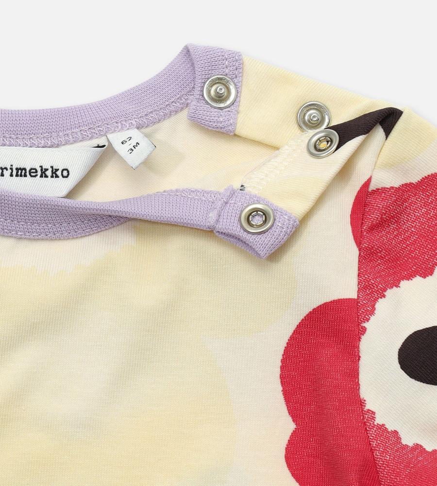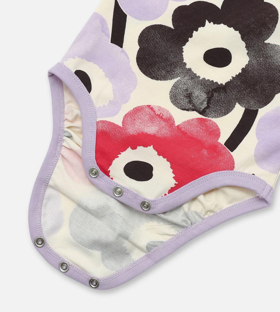 愛らしくて上品なUnikko柄のロンパース。素肌にやさしいコットン素材にストレッチを加えて、着心地良さも抜群です。華やぎのあるデザインは、プレゼントにも最適です。
