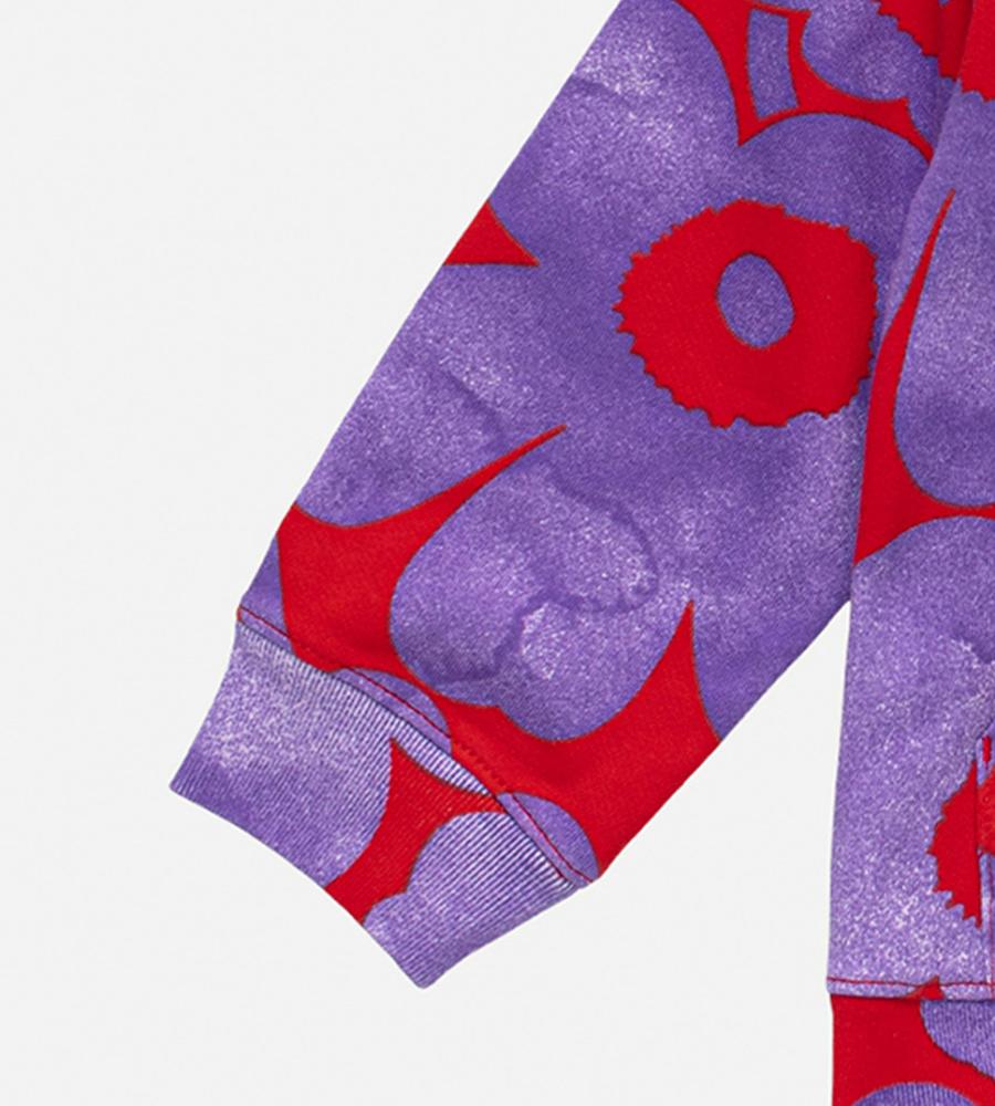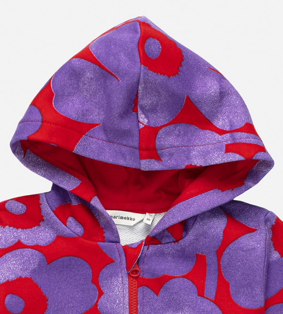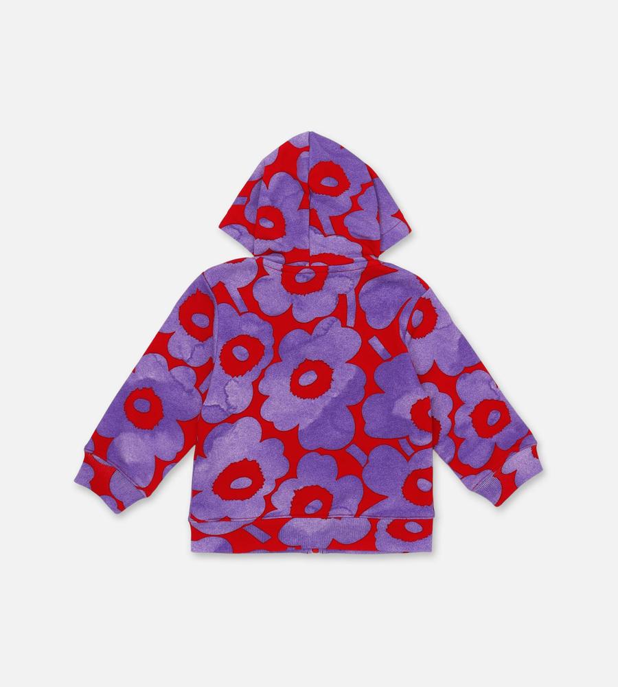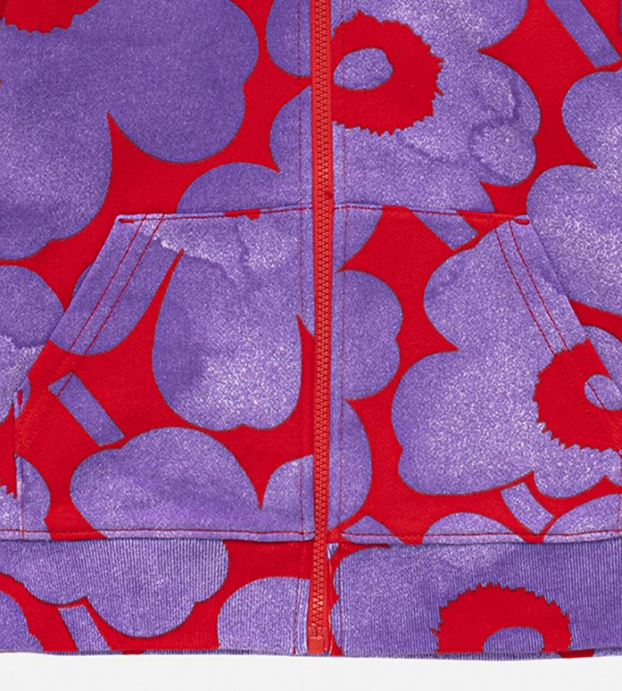 色鮮やかなUnikko柄が表情まで明るく見せてくれそうなキッズ用パーカ。カンガルーポケットつきなので、軽やかなアウターとしても便利に活躍します。