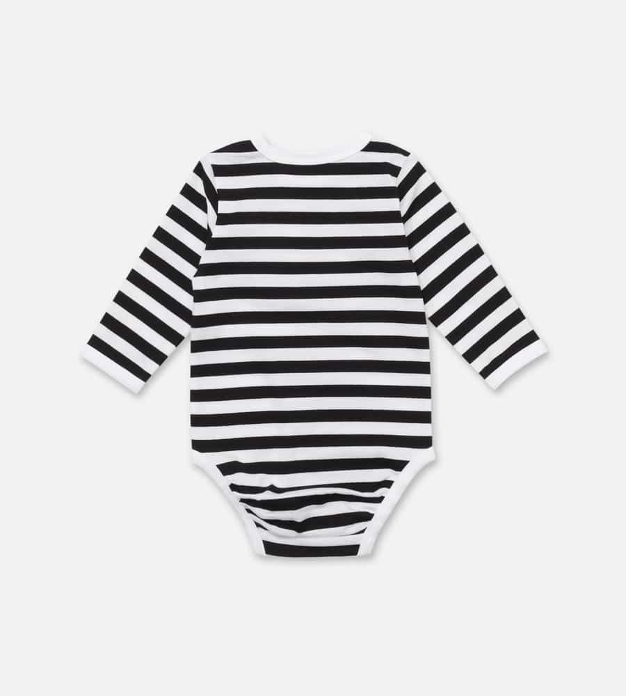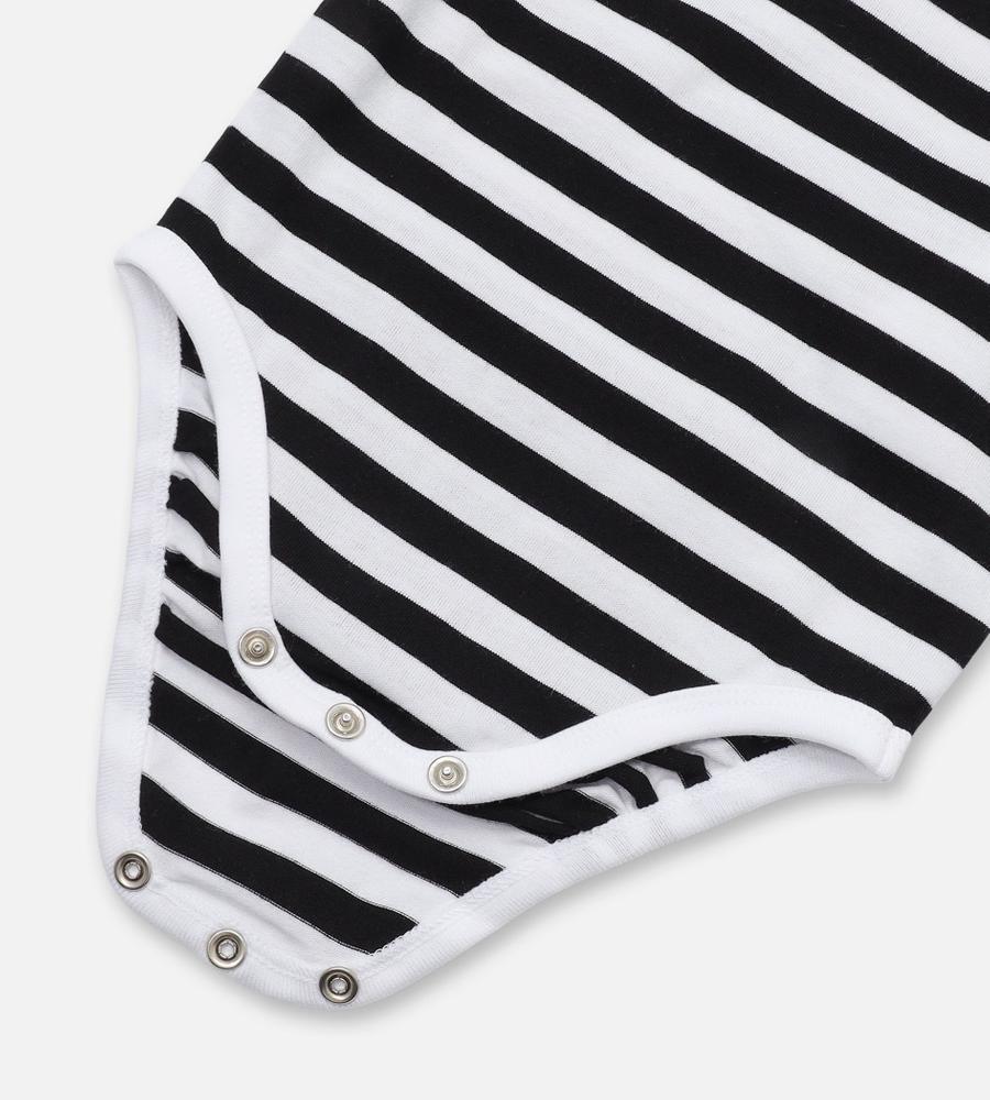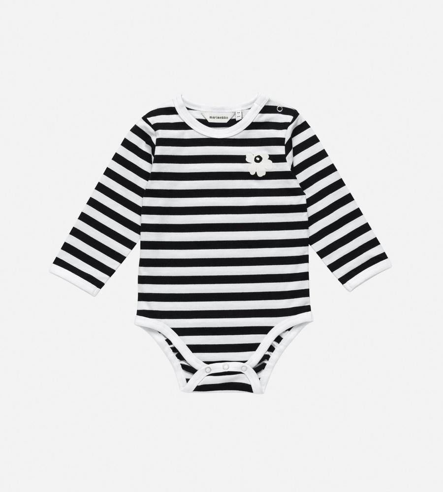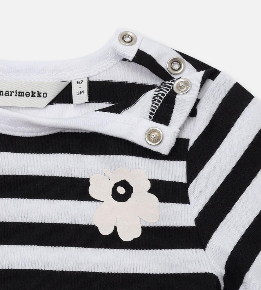 ボーダーにUnikko柄のワンポイントを加えたロンパース。ほど良くカジュアルなデザインは、デイリーユースにもおすすめです。コットン100%素材で、着心地良さにもこだわった一枚。