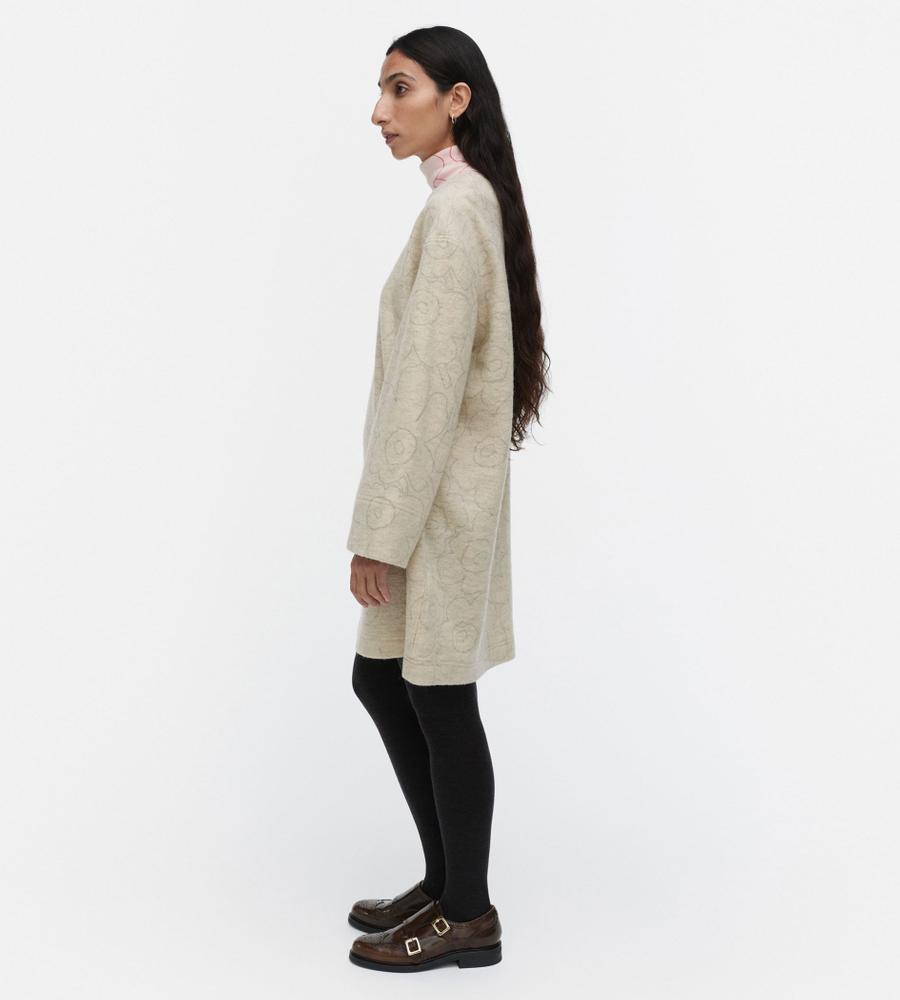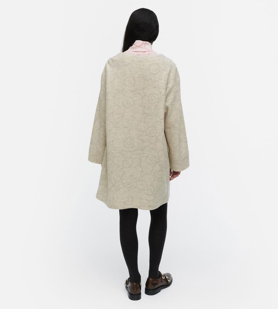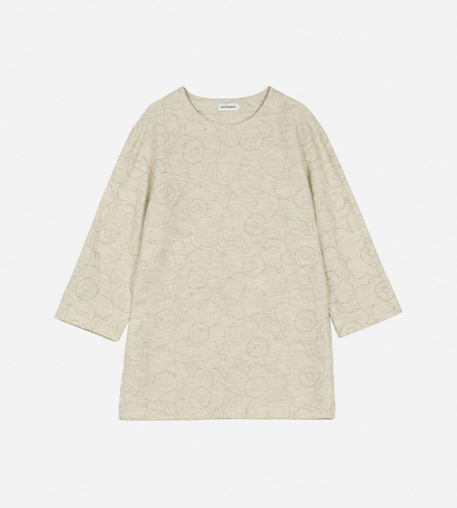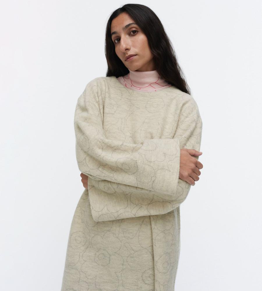 リラックスフォルムのミニワンピースです。身頃や袖にたっぷりと生地を使い、着丈で軽快さをプラスしました。繊細さを感じる「Unikko」柄で、日常に取り入れやすいのが魅力。インに襟付きのシャツや、スタンドネックのブラウス、タートルネックのニットなどを重ねて、オリジナルのレイヤードを楽しむことができます。