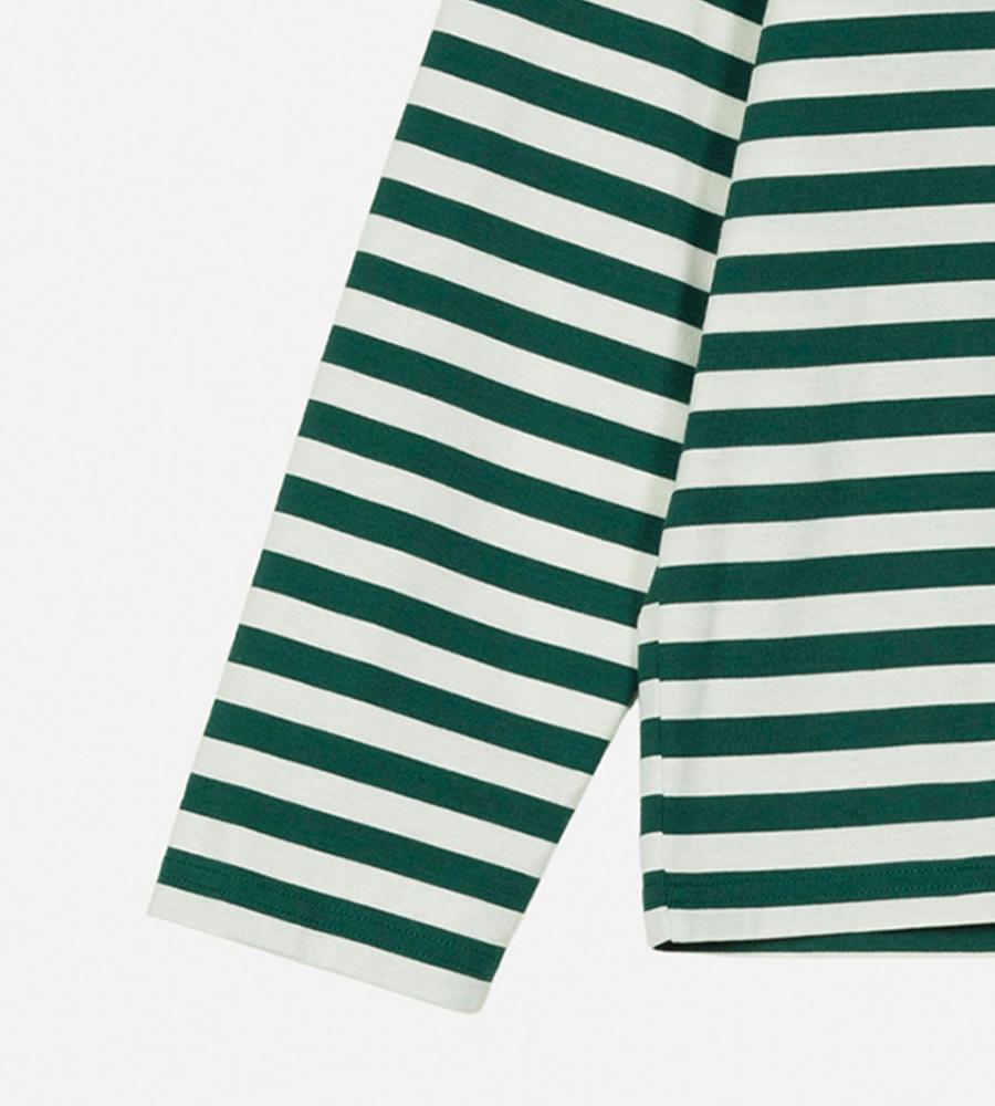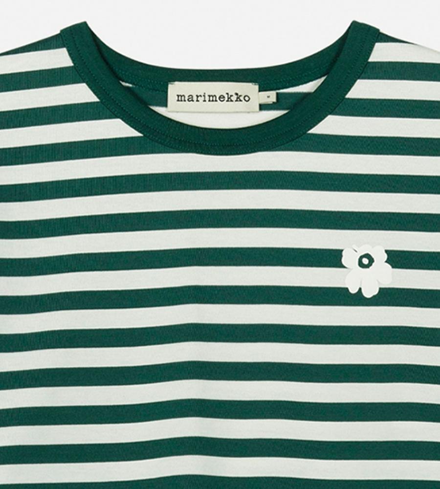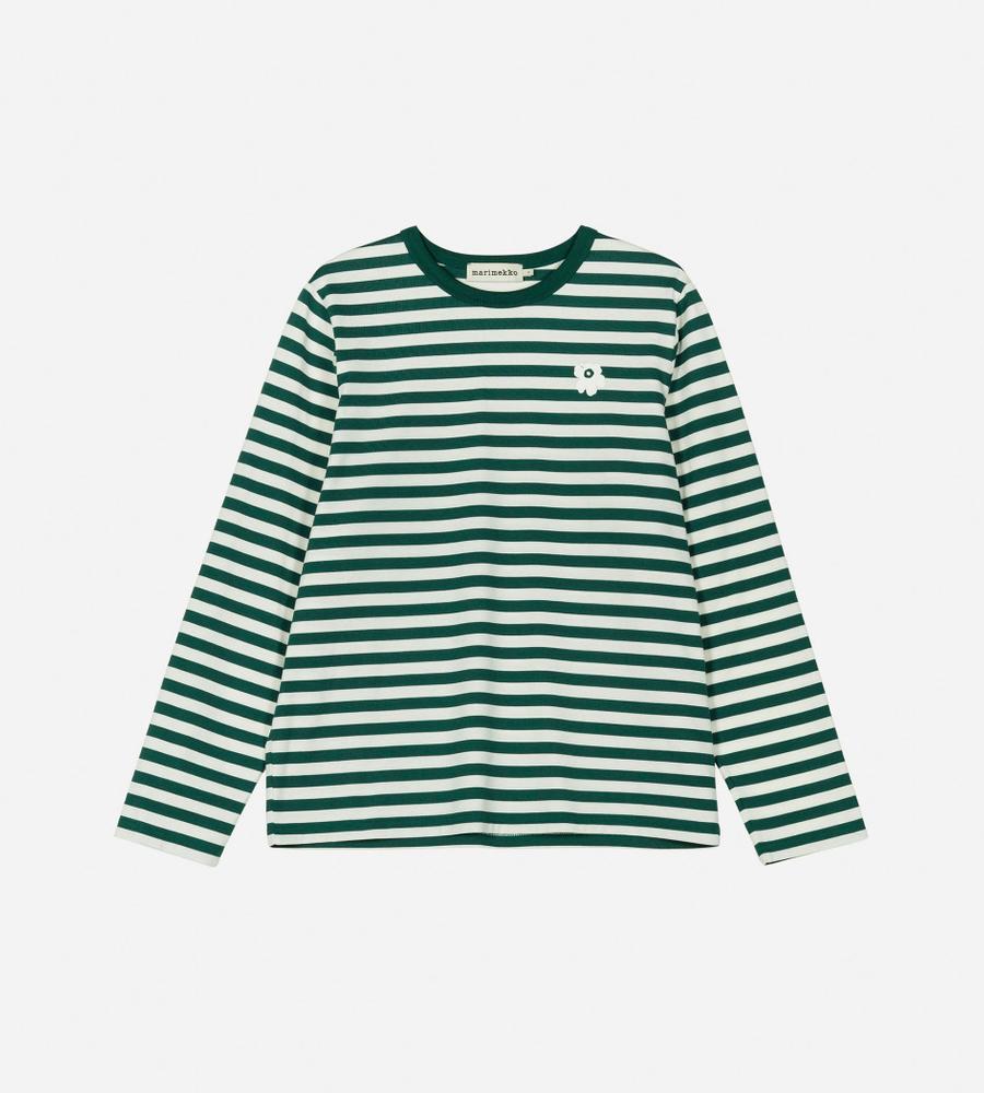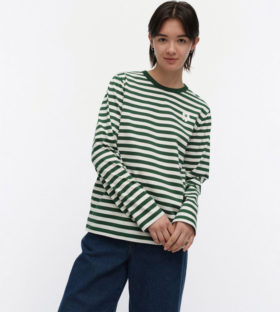 深みのあるグリーンベースのボーダー柄が着こなしの華やかなアクセントになるOネック長袖カットソー。均一なラインで平等性を表現しているMarimekkoのボーダー柄。左胸のUnikko柄の小さなフラワーモチーフがスタイリッシュなワンポイント。ユニセックスなサイズ感もモダンなポイントです。
