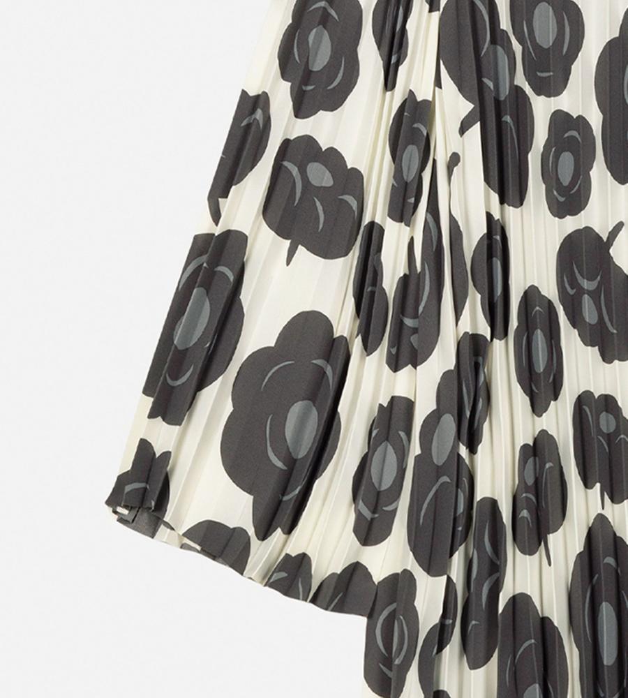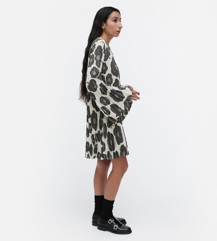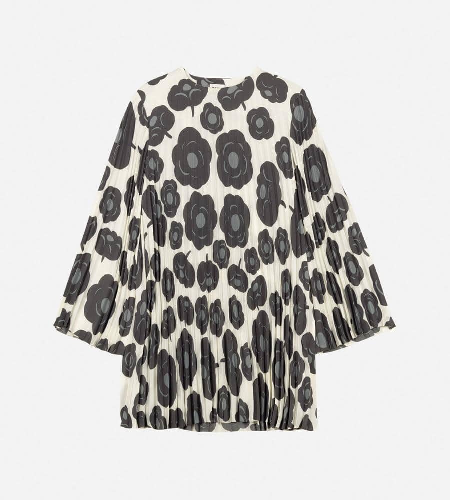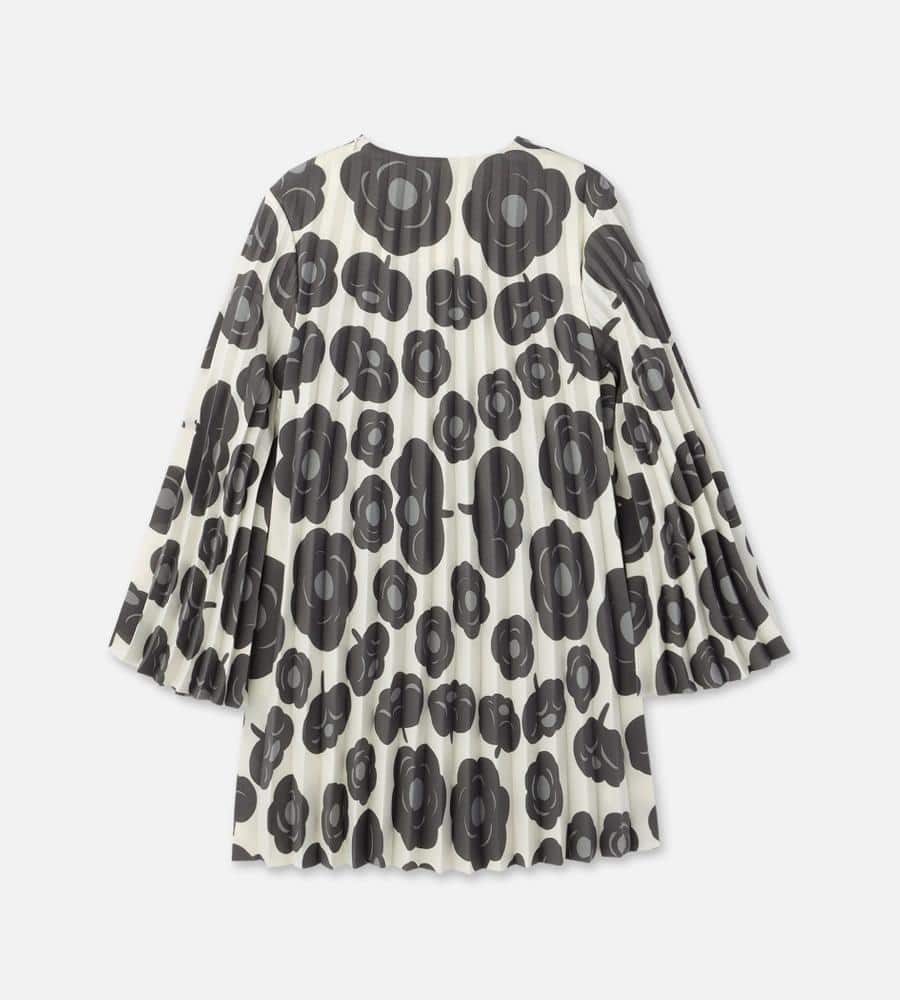 オフホワイト×ダークグレーでシックな雰囲気にまとめたTummaプリーツワンピース。優美に広がるロングトランペットスリーブが特徴的なデザイン。ボディラインを拾わずにゆったりと着こなせるため、コンフォートなムードを纏えます。