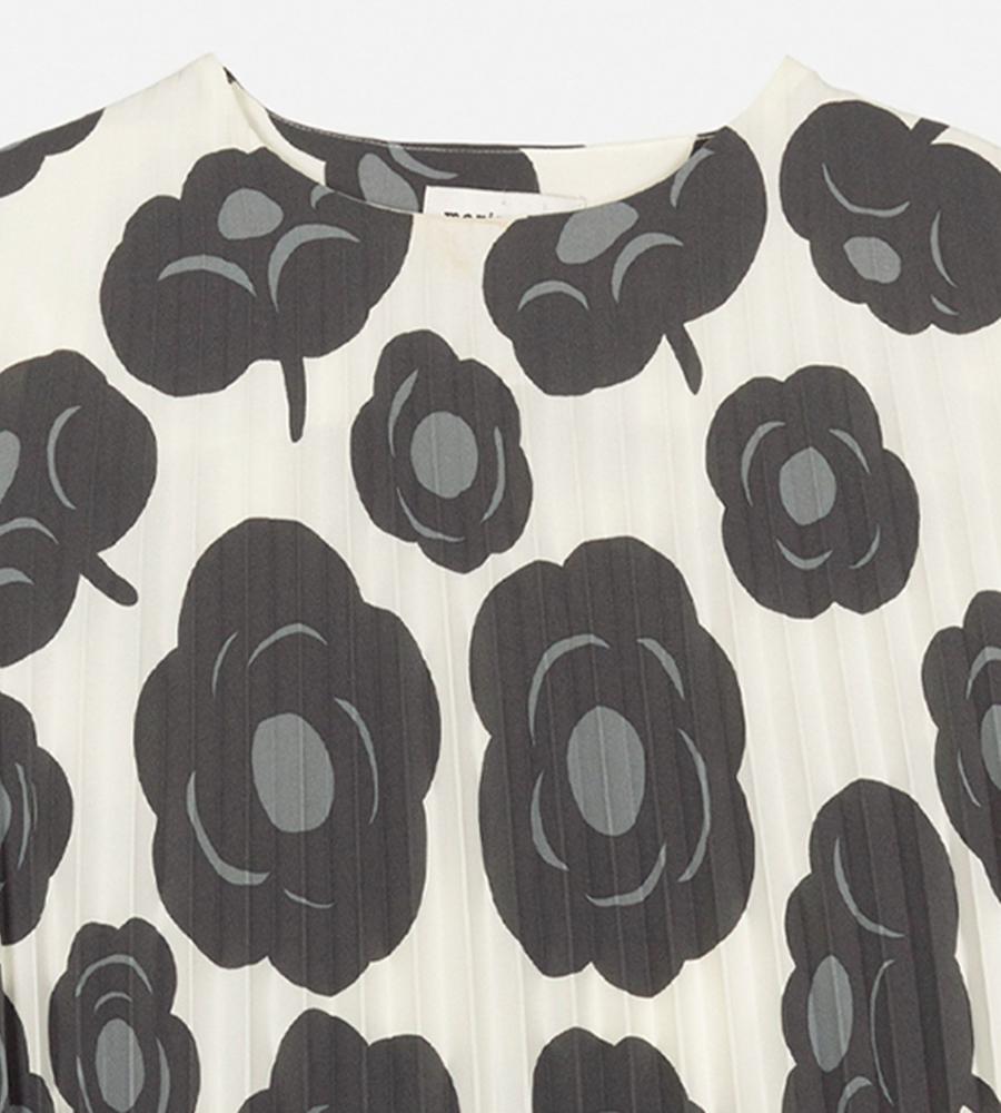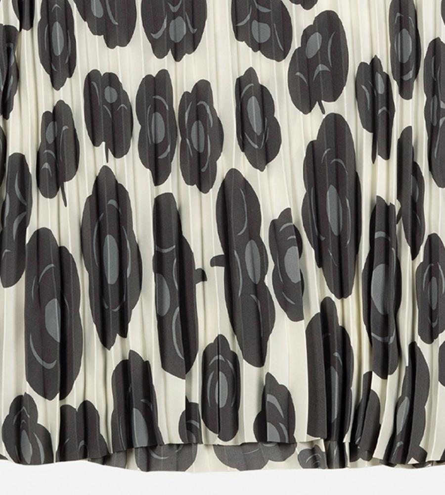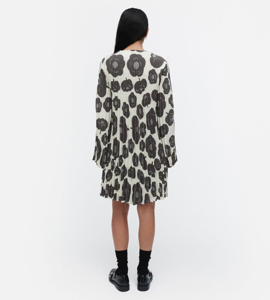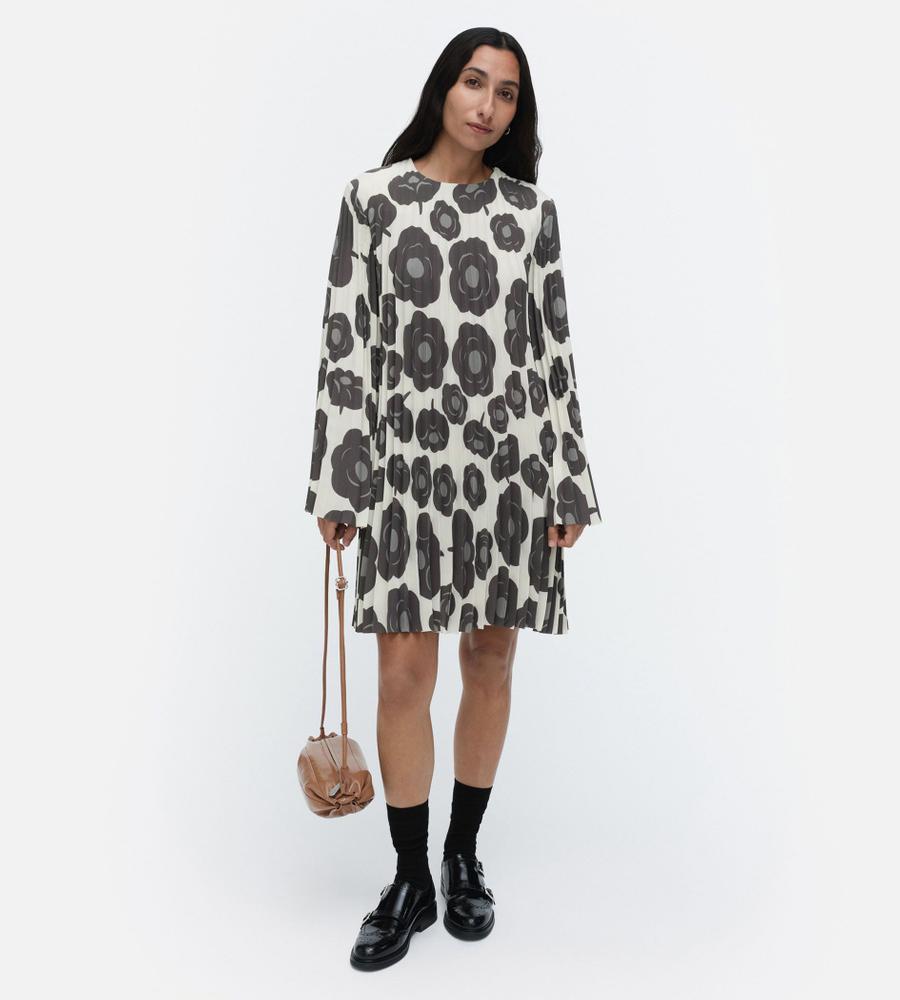 オフホワイト×ダークグレーでシックな雰囲気にまとめたTummaプリーツワンピース。優美に広がるロングトランペットスリーブが特徴的なデザイン。ボディラインを拾わずにゆったりと着こなせるため、コンフォートなムードを纏えます。
