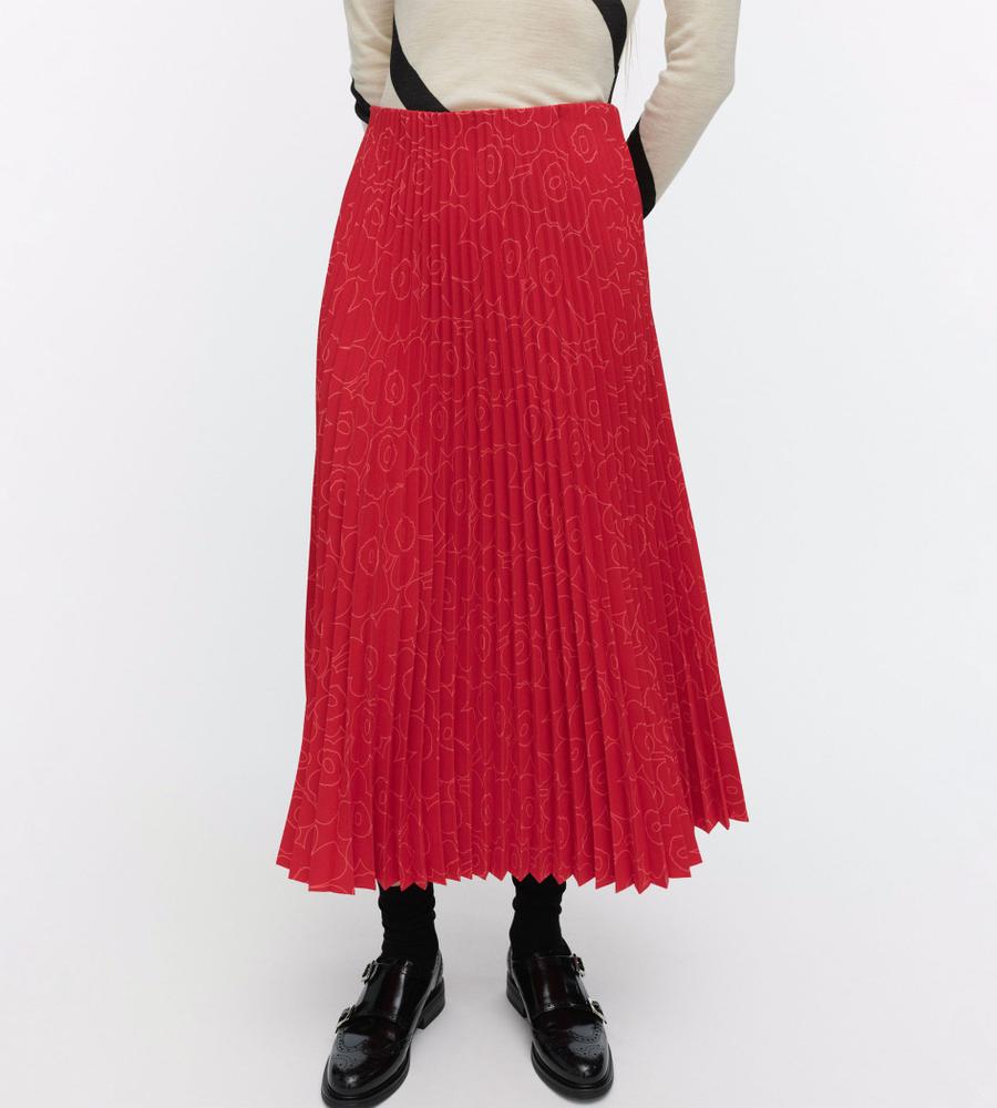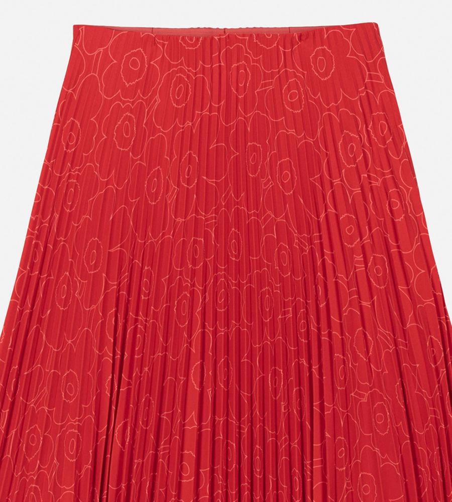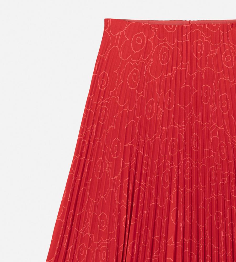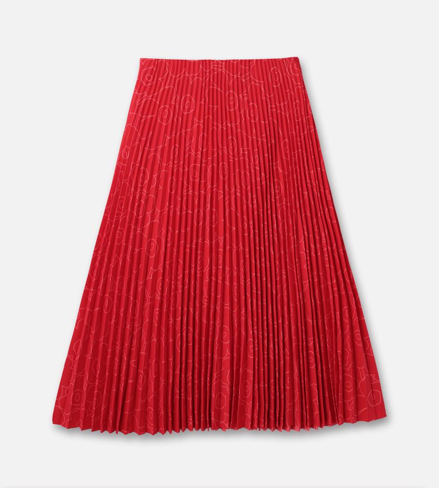 ポリエステル素材の軽やかなアコーディオンプリーツスカート。秋冬はブーツとのコーディネートも楽しめるロング丈です。プリーツはトップから施されていて、広がりすぎない美しいシルエットをキープ。内側がゴムウエストのため、快適な穿き心地です。さりげない「Unikko」柄で取り入れやすい一着となっています。
