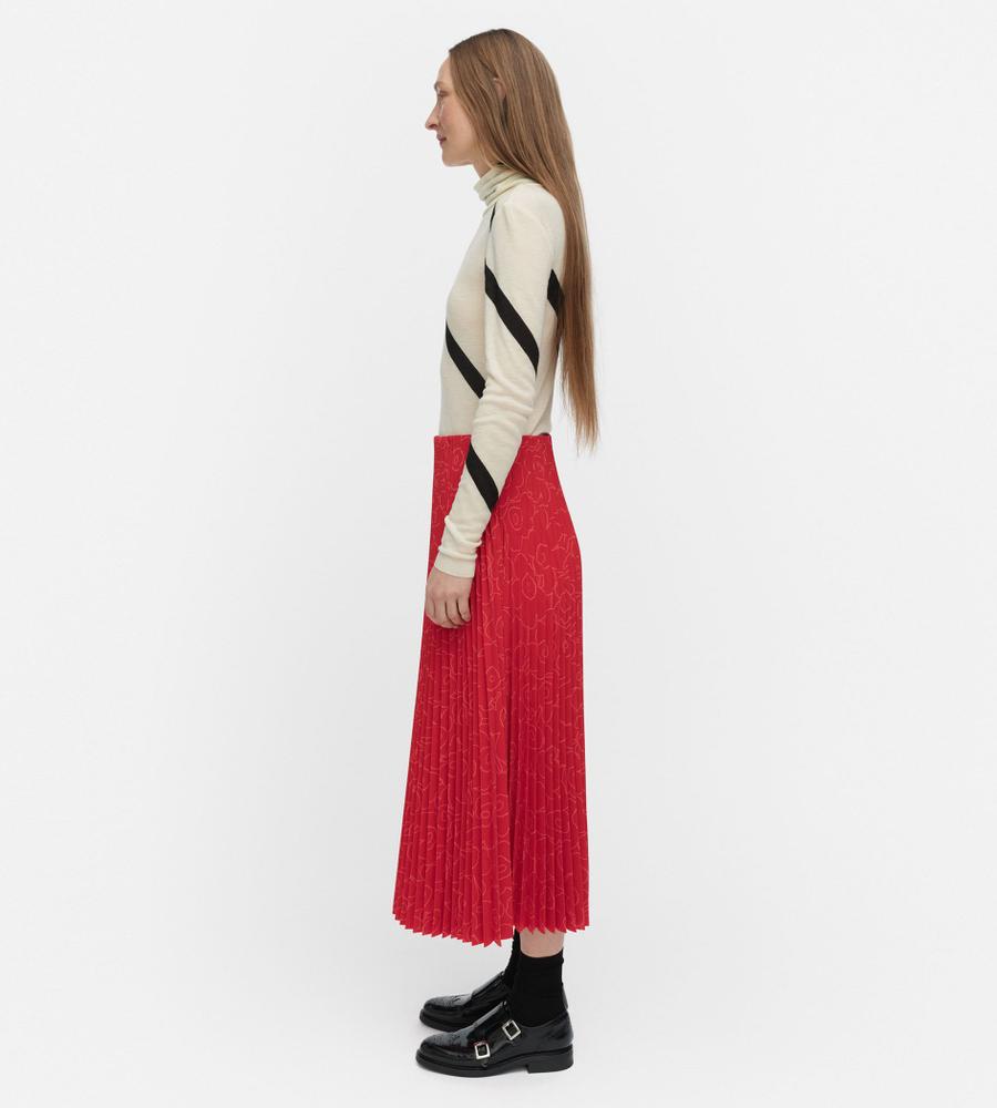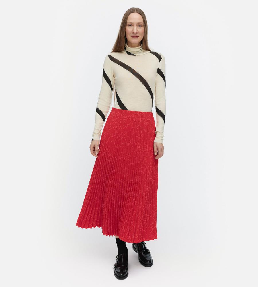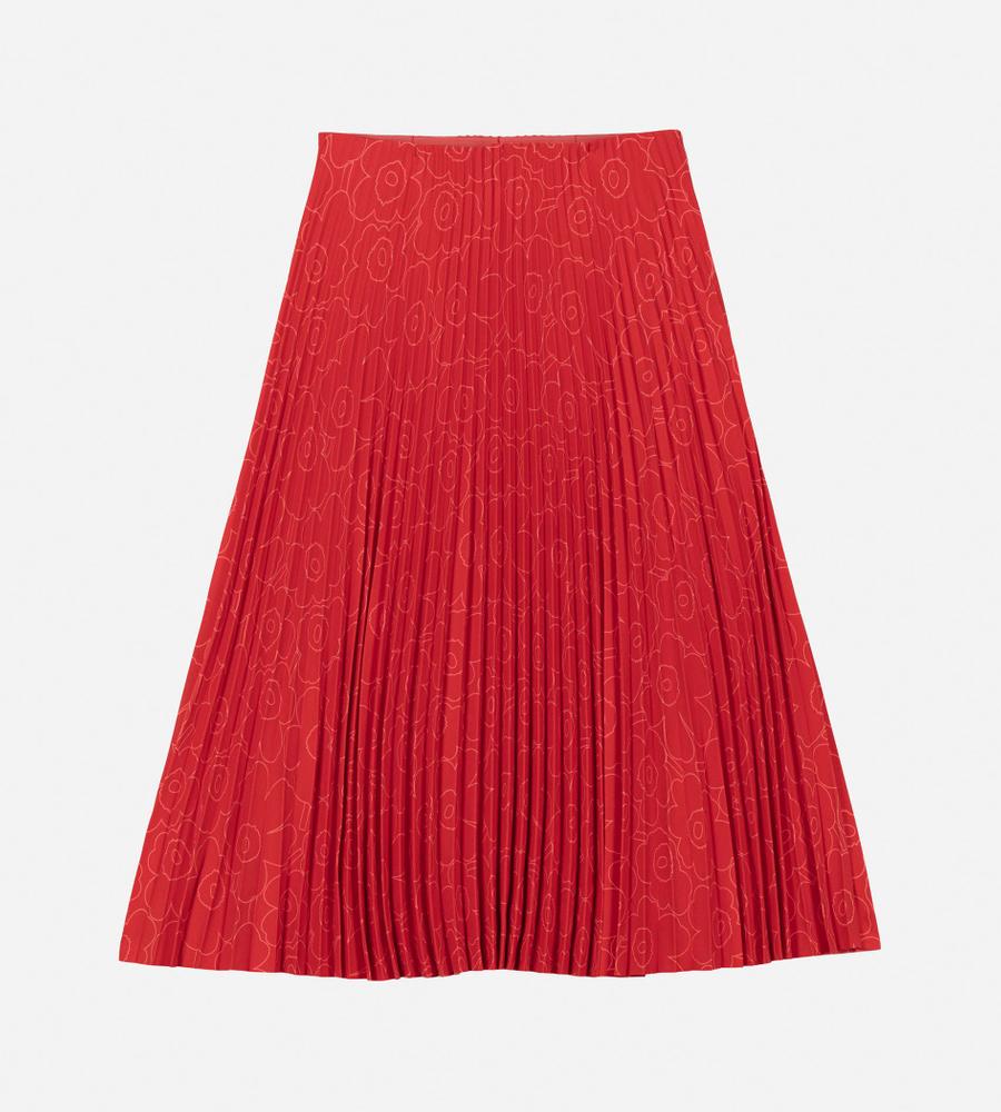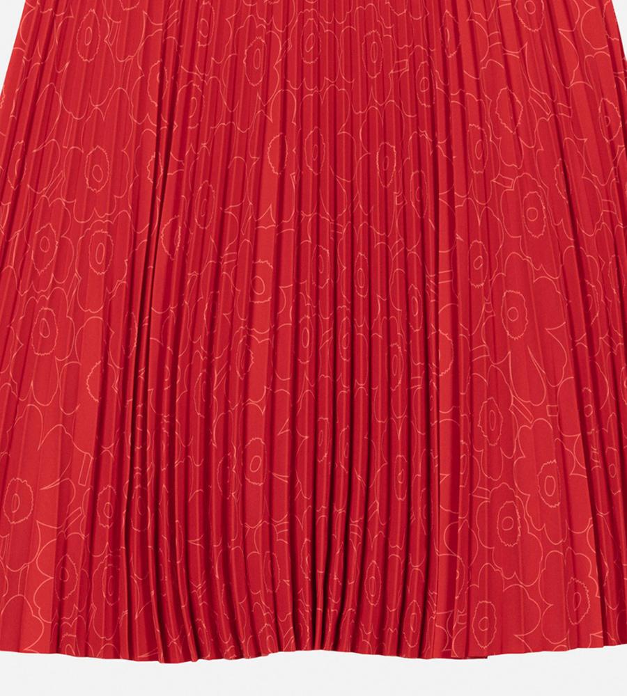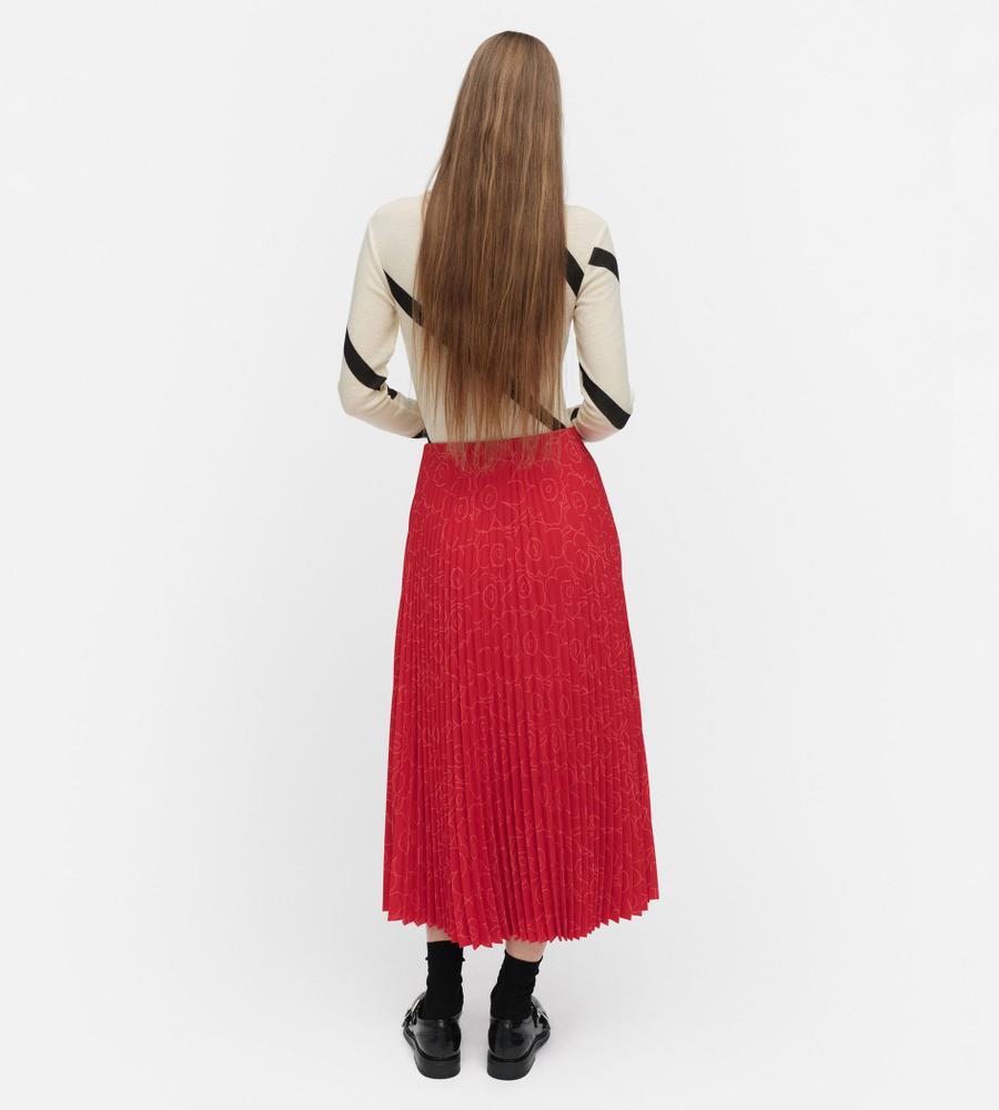 ポリエステル素材の軽やかなアコーディオンプリーツスカート。秋冬はブーツとのコーディネートも楽しめるロング丈です。プリーツはトップから施されていて、広がりすぎない美しいシルエットをキープ。内側がゴムウエストのため、快適な穿き心地です。さりげない「Unikko」柄で取り入れやすい一着となっています。