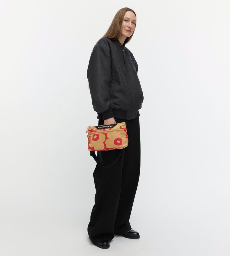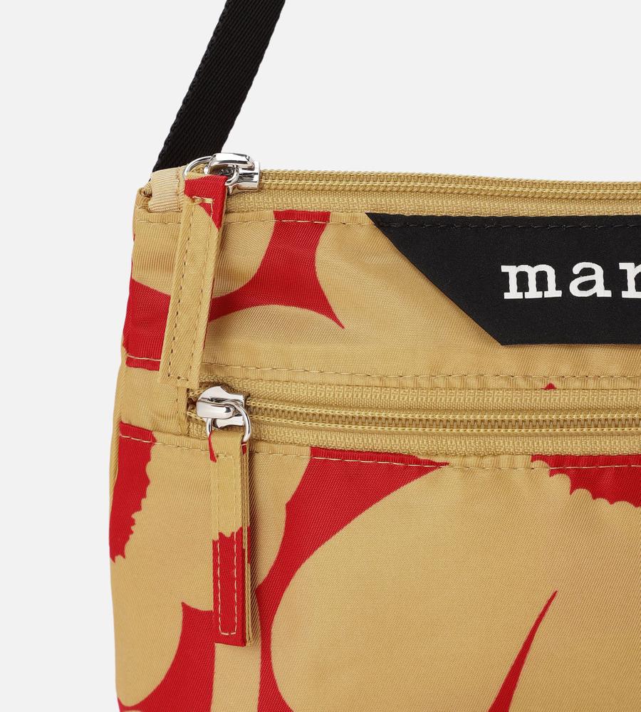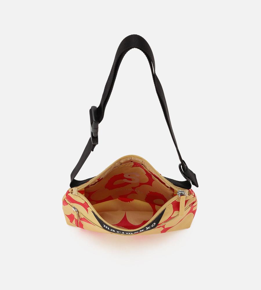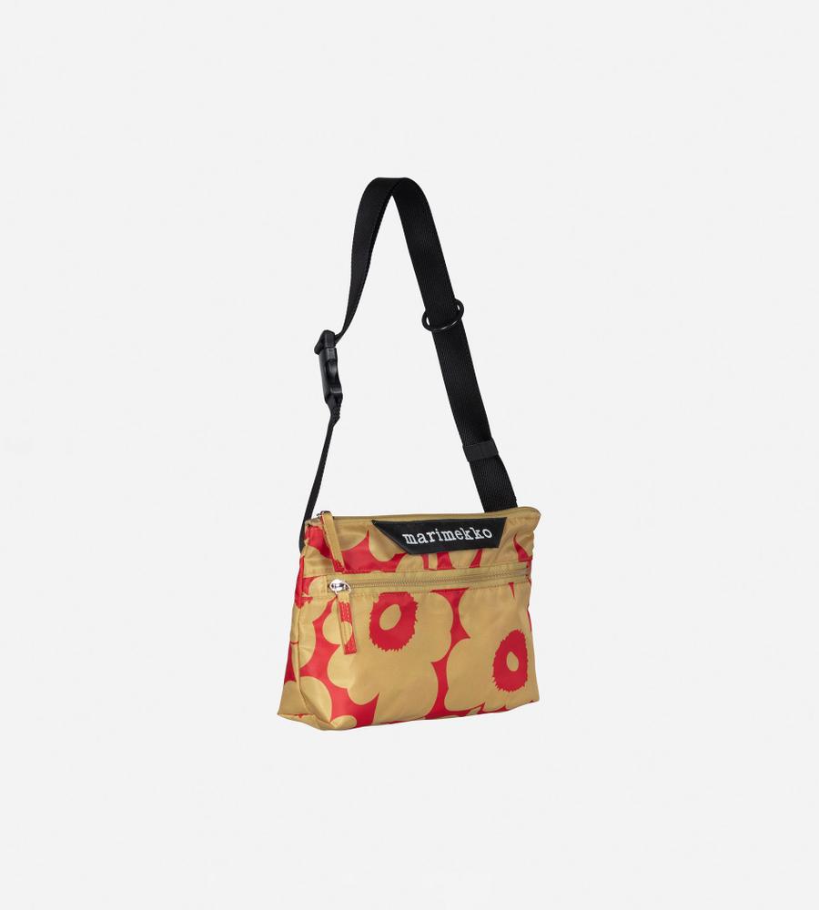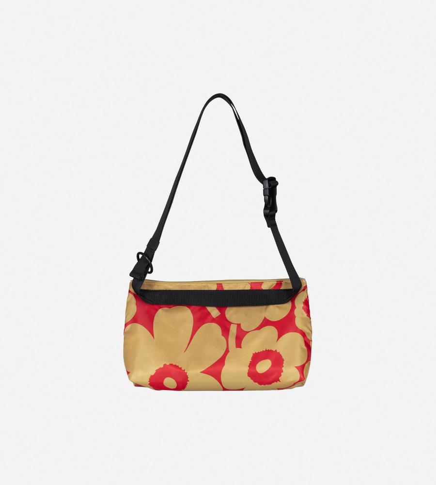 コーディネートにポップなアクセントを添える、鮮やかな配色のUnikko柄が目を引くショルダーバッグ。フロントに添えたロゴレタード入りのテープが、スポーティなアクセントになっています。ショルダーとして斜め掛けできるほか、背面のハンドルで手提げとして持つことも可能。マチがある長方形デザインで、スマートに収納できるのも魅力です。