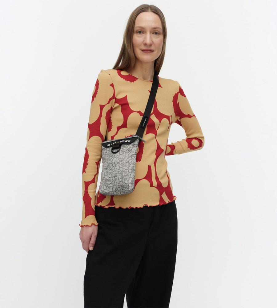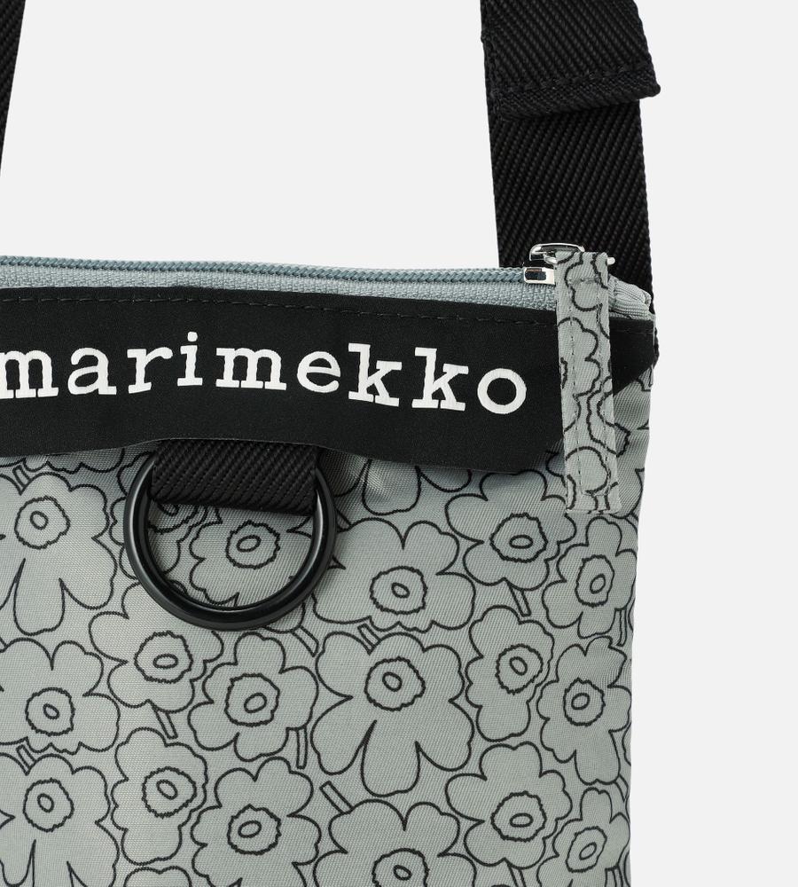 緻密なUnikko柄を敷き詰めた、繊細なグラフィックを用いたショルダーバッグ。スマートフォンやミニウォレットなど、肌身離さず身に着けておきたいものがスマートに収まるサイズです。斜め掛けした時のフィット感の良さも満点で、アクティブに動きたいシーンにも最適。ストラップは長さの調節も可能です。