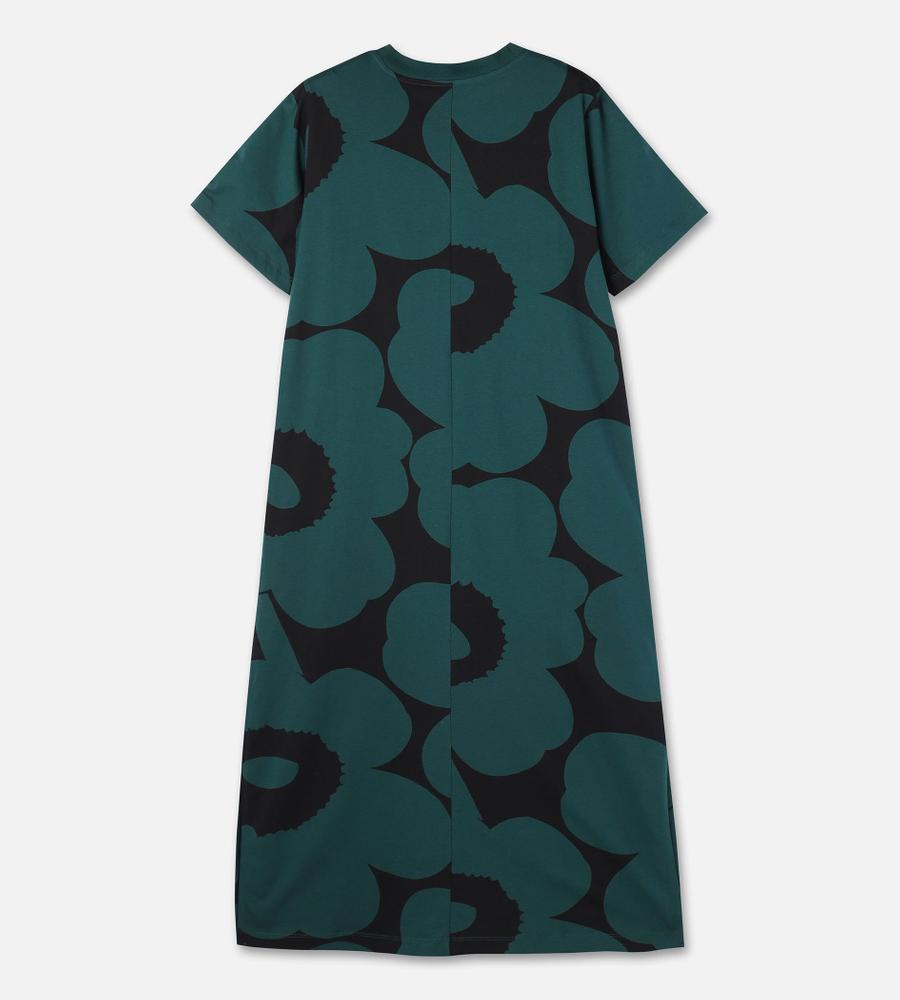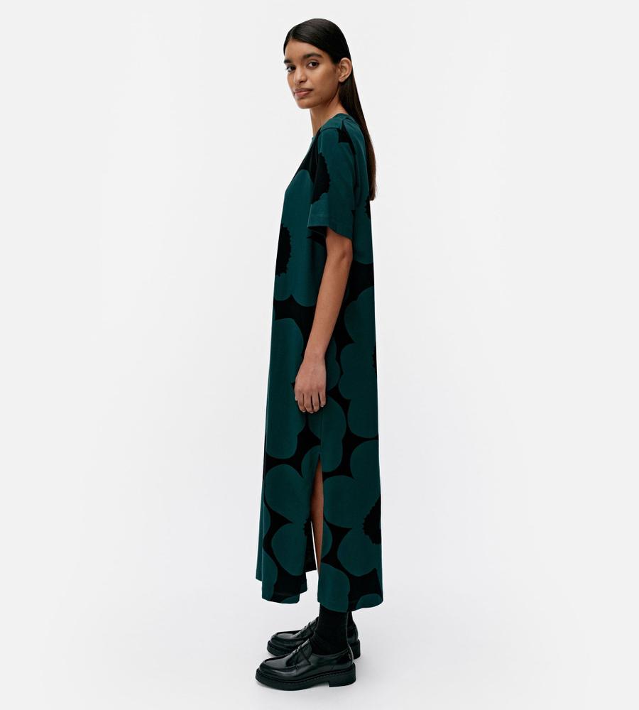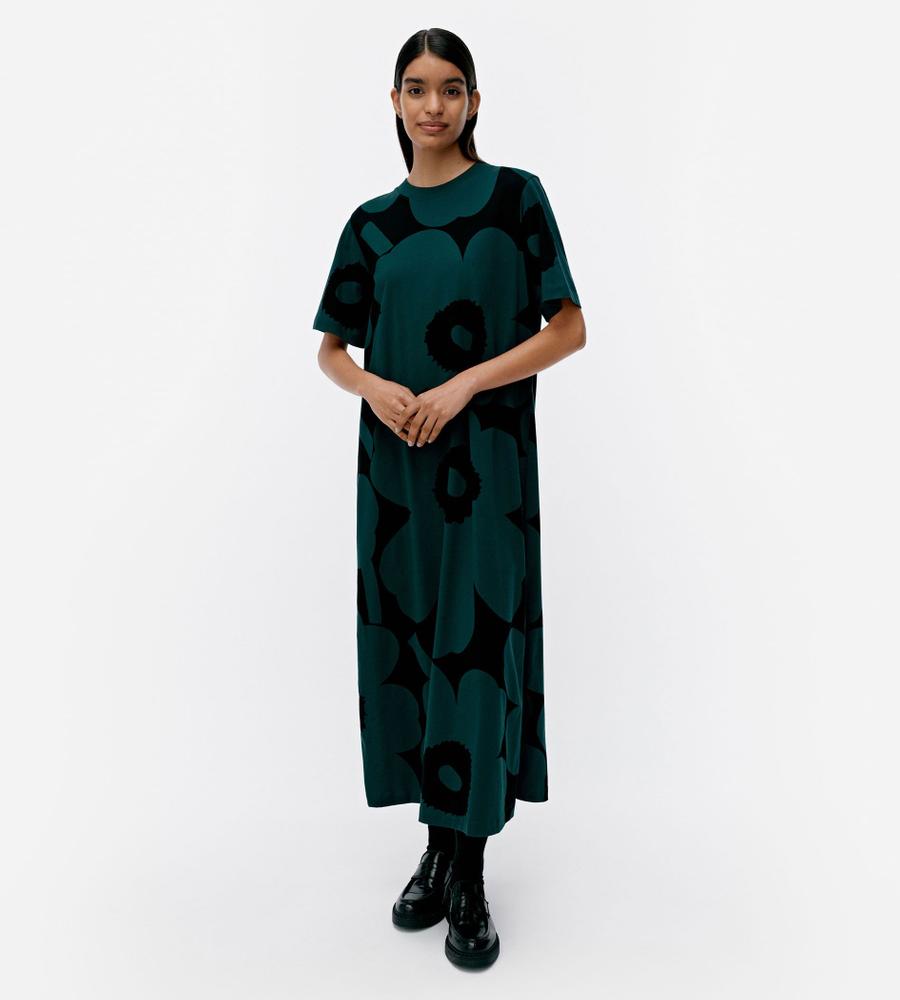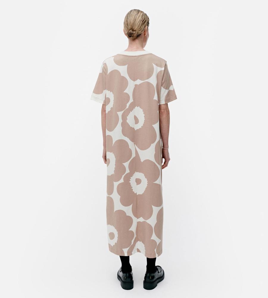 Marimekkoを代表するUnikko柄の半袖ロング丈ワンピース。大きく全面に配したフラワーモチーフが目を惹く華やかなデザインの一枚。サイドスリットとゆったりとしたフィット感のストンと落ちるシルエットがモダンなデザインポイント。一枚でスタイリッシュなお出かけコーディネートが完成するアイテムです。