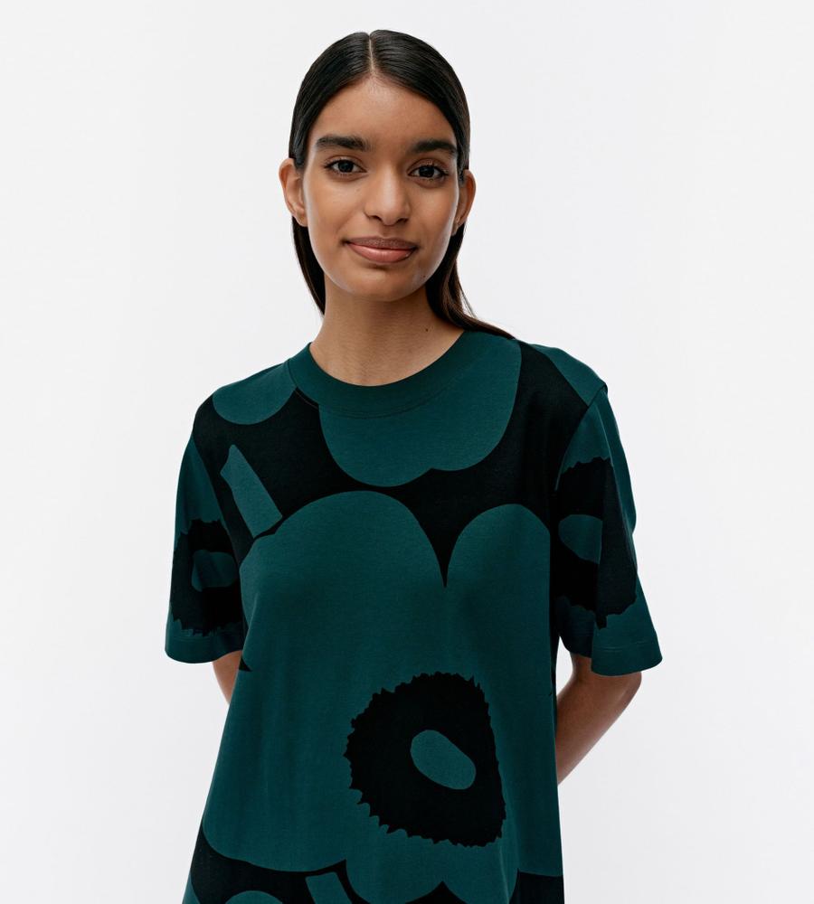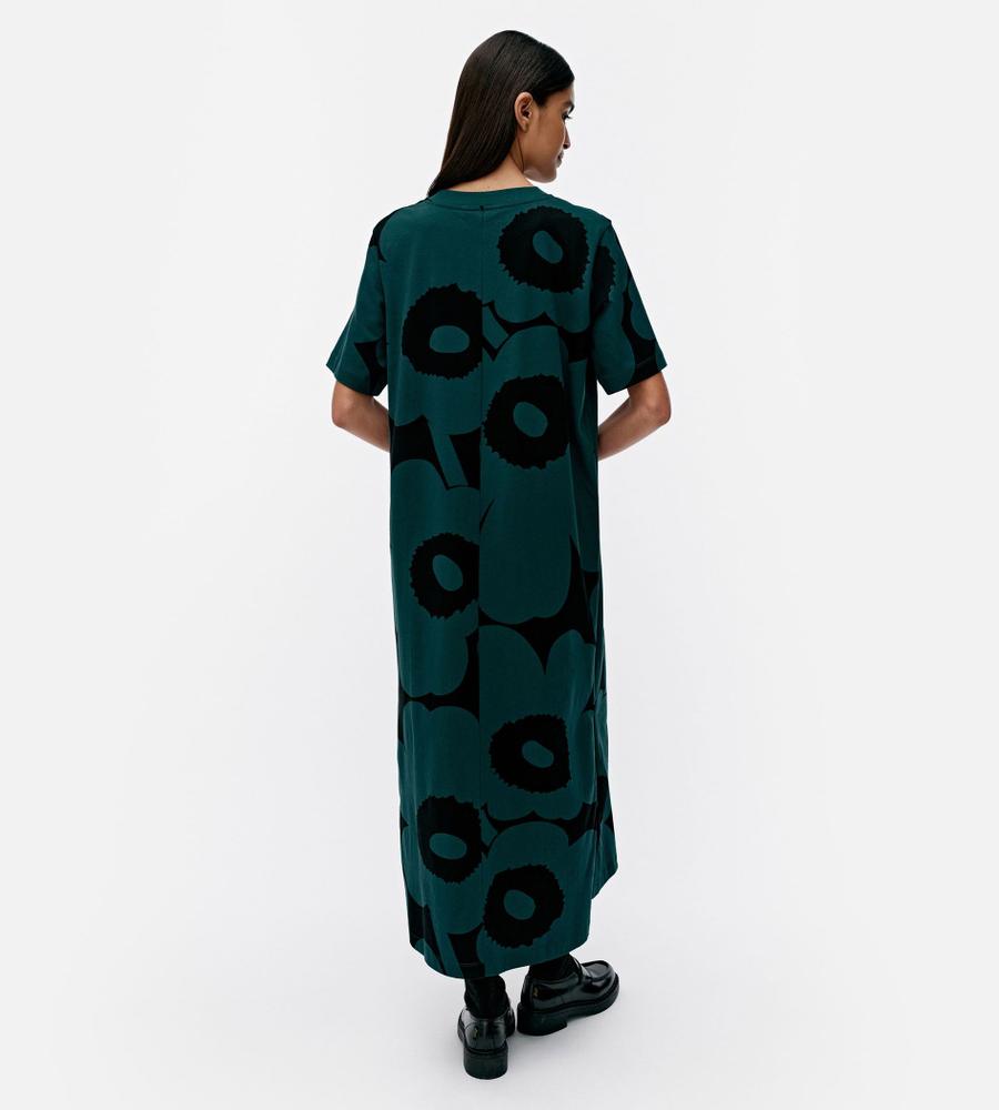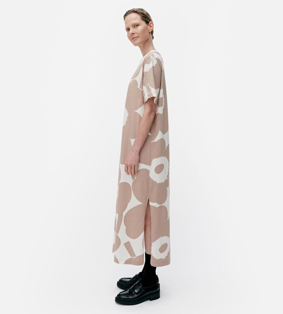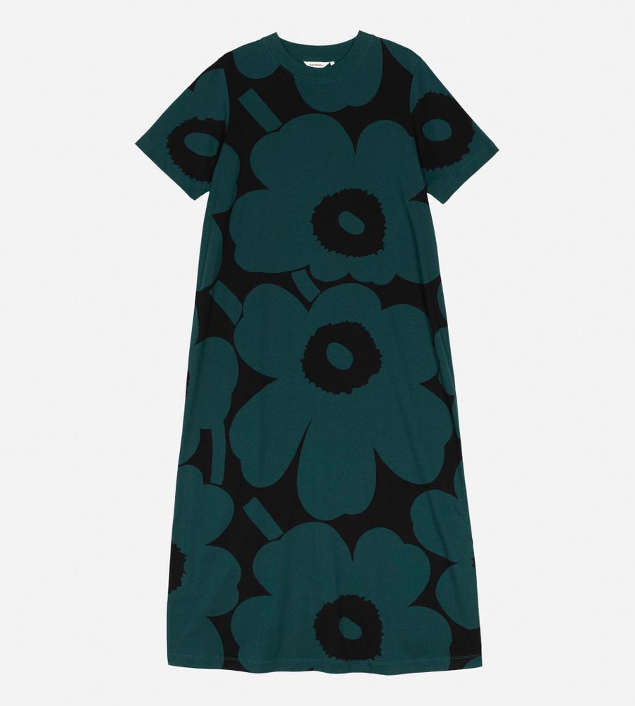 Marimekkoを代表するUnikko柄の半袖ロング丈ワンピース。大きく全面に配したフラワーモチーフが目を惹く華やかなデザインの一枚。サイドスリットとゆったりとしたフィット感のストンと落ちるシルエットがモダンなデザインポイント。一枚でスタイリッシュなお出かけコーディネートが完成するアイテムです。