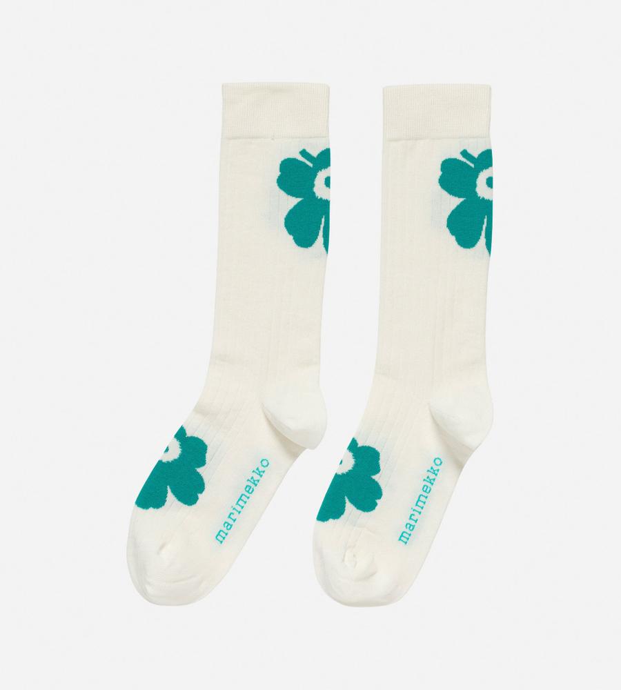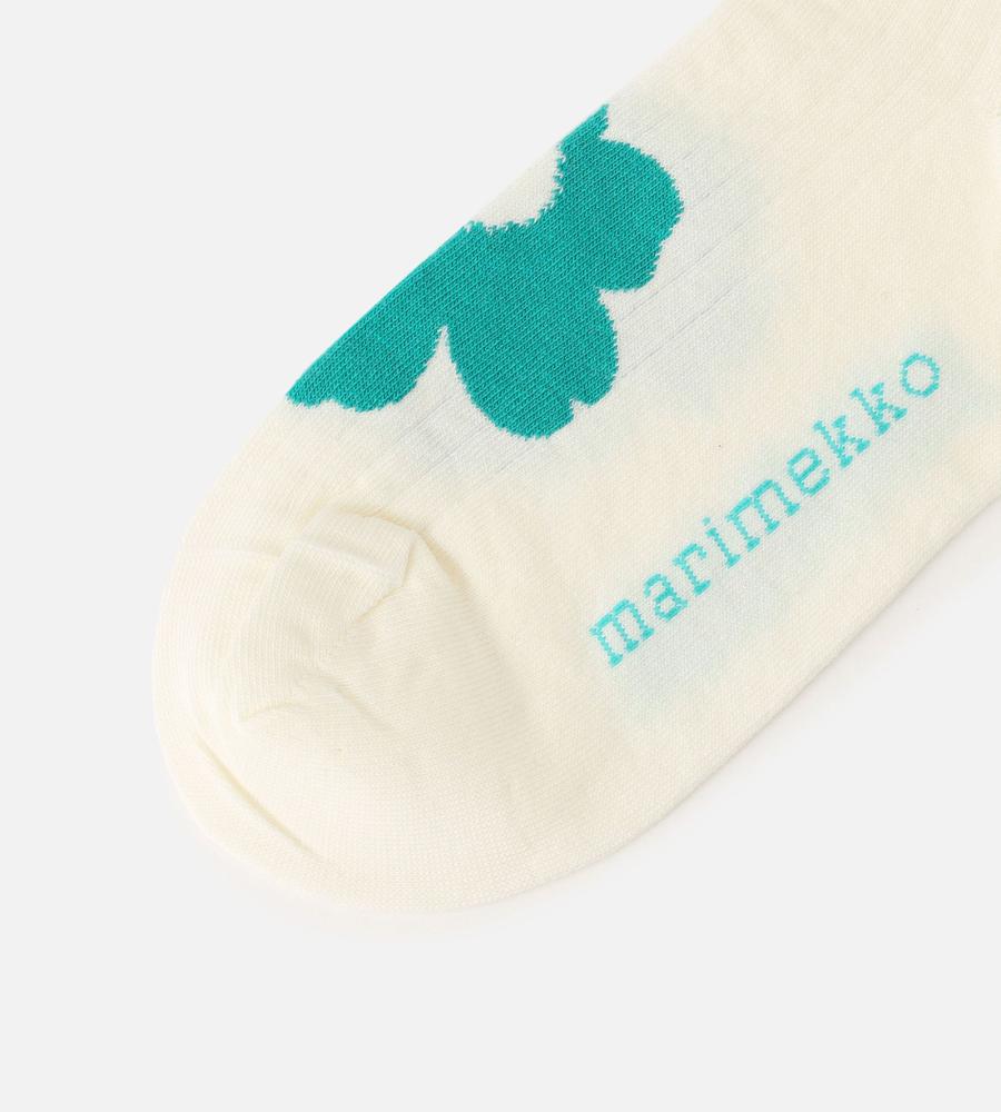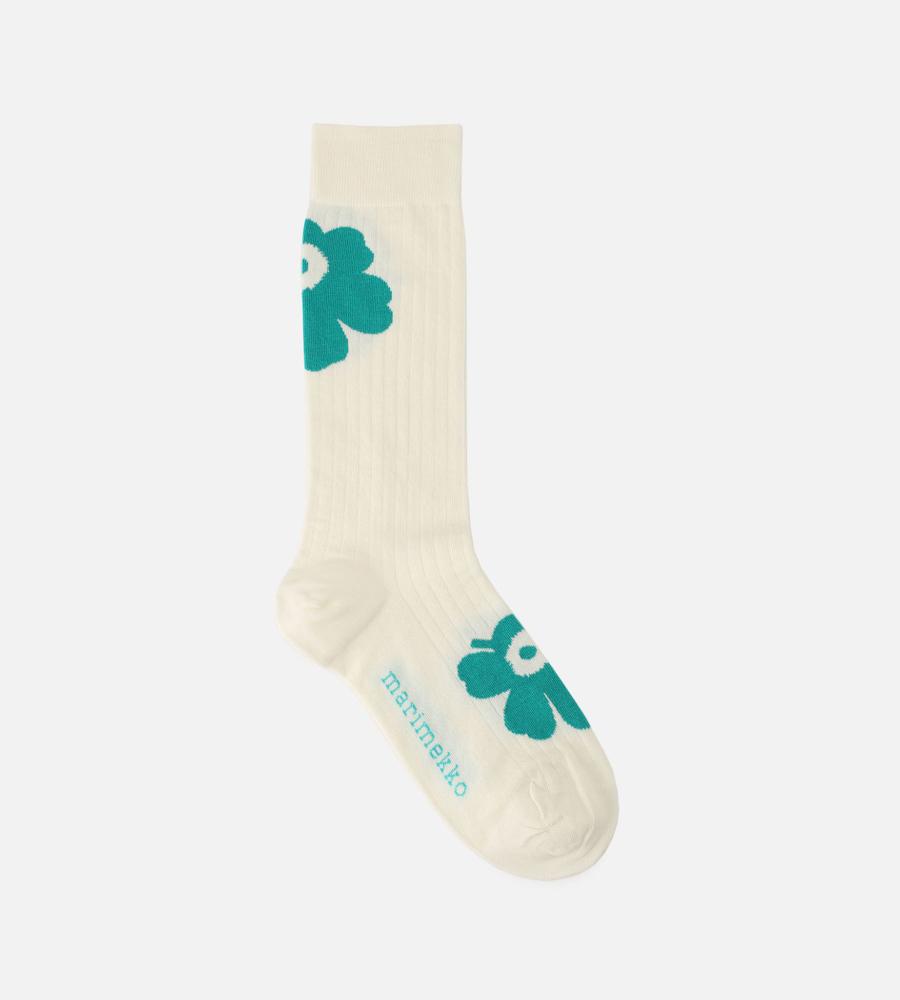足の甲とふくらはぎ部分に大きなUnikko柄を咲かせた、ブランドらしさ満点のソックス。細いリブを採用し、クリーンな印象に仕上げています。少し長めの丈を採用しているため、ショート丈ボトムスなどを合わせるスタイルでも見映えします。スニーカーだけではなく、パンプスなどとも合わせやすいアイテムです。