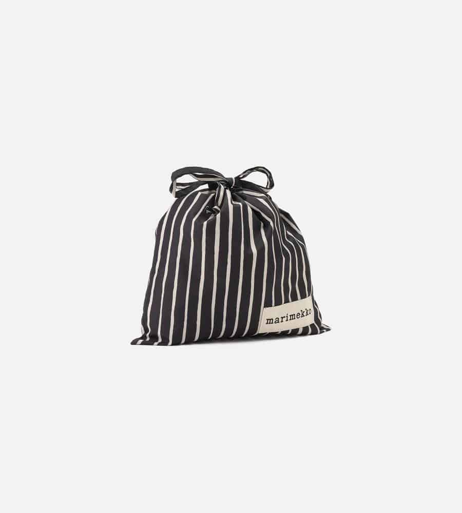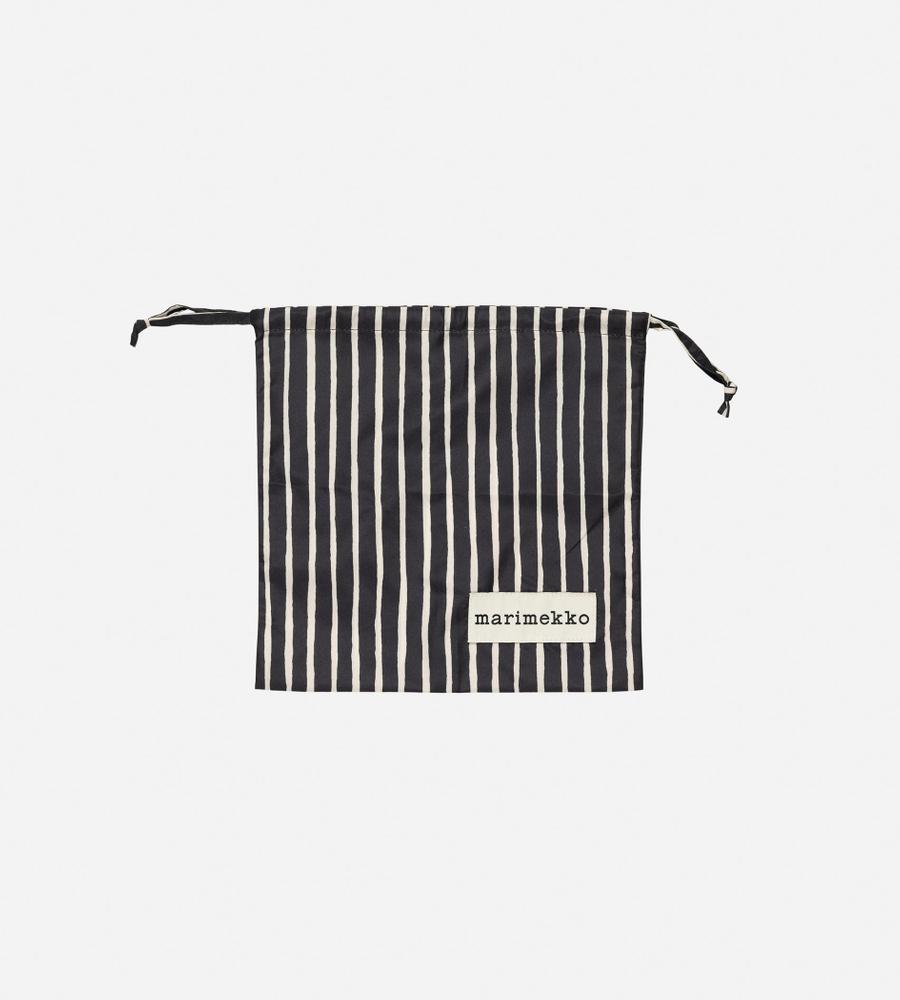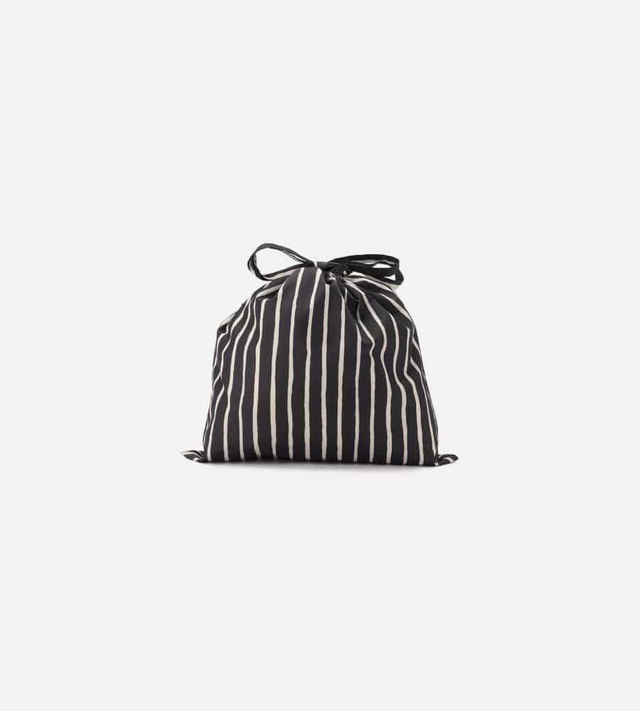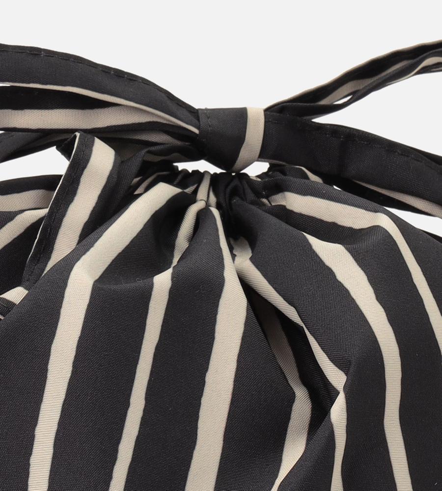 ハンドブラッシュの幅の異なるラインで構成されたPiccolo柄のポーチ。ストライプ柄と大きめのロゴタグがスタイリッシュなデザインポイント。両端のドローストリングで閉開するクシュっとしたトップが愛らしいフォルム。シンプルな形と、軽く扱いやすい布製で様々な用途で活躍する便利なアイテムです。