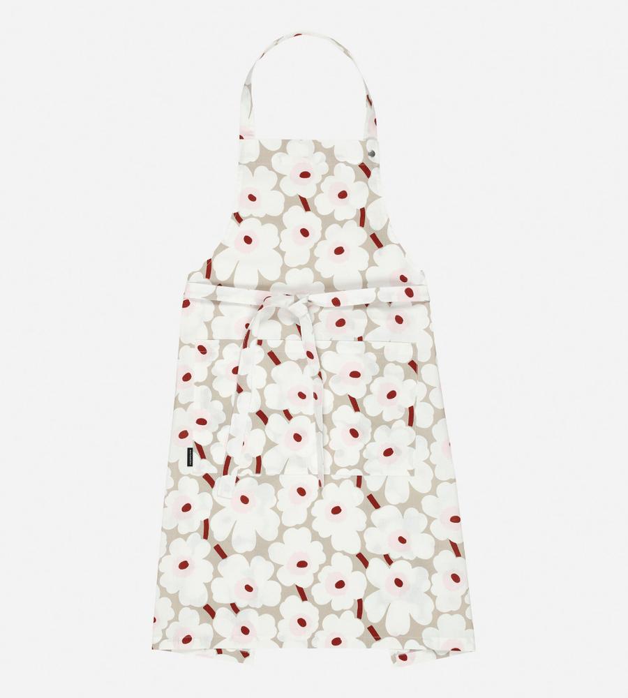 Marimekkoを代表するUnikko柄のエプロン。着脱が簡単な首かけタイプで、ホルターネックは3段階の長さ調節が可能です。大きなフロントポケット付きで実用性も高く、ご自宅での家事はもちろん、お庭仕事やお料理教室などにもおすすめ。上品で柔らかな色合いがどんな空間にも溶け込んでくれそうです。