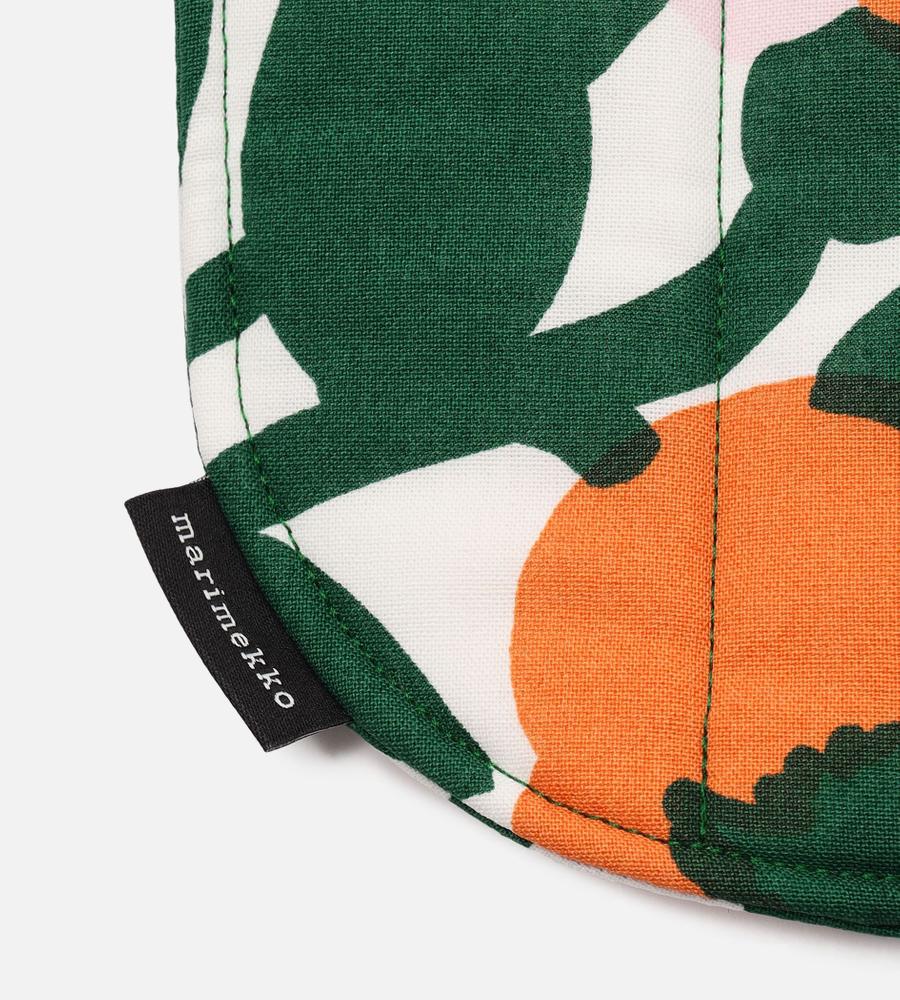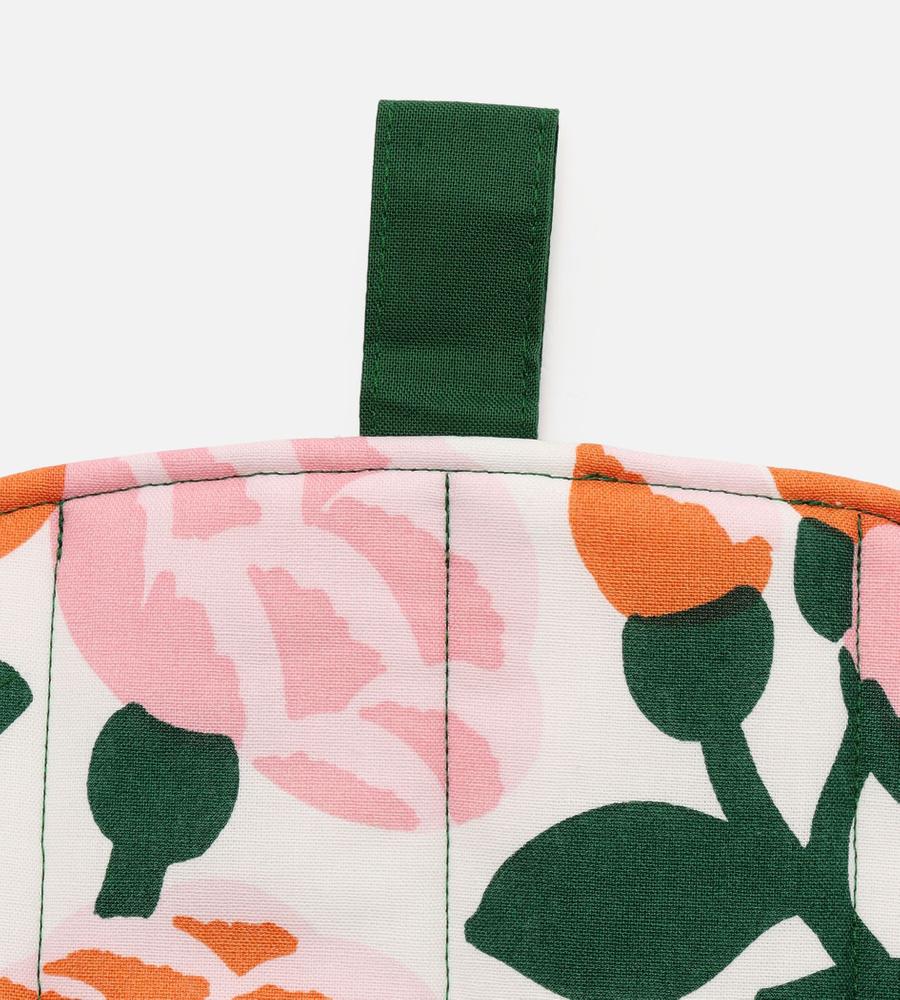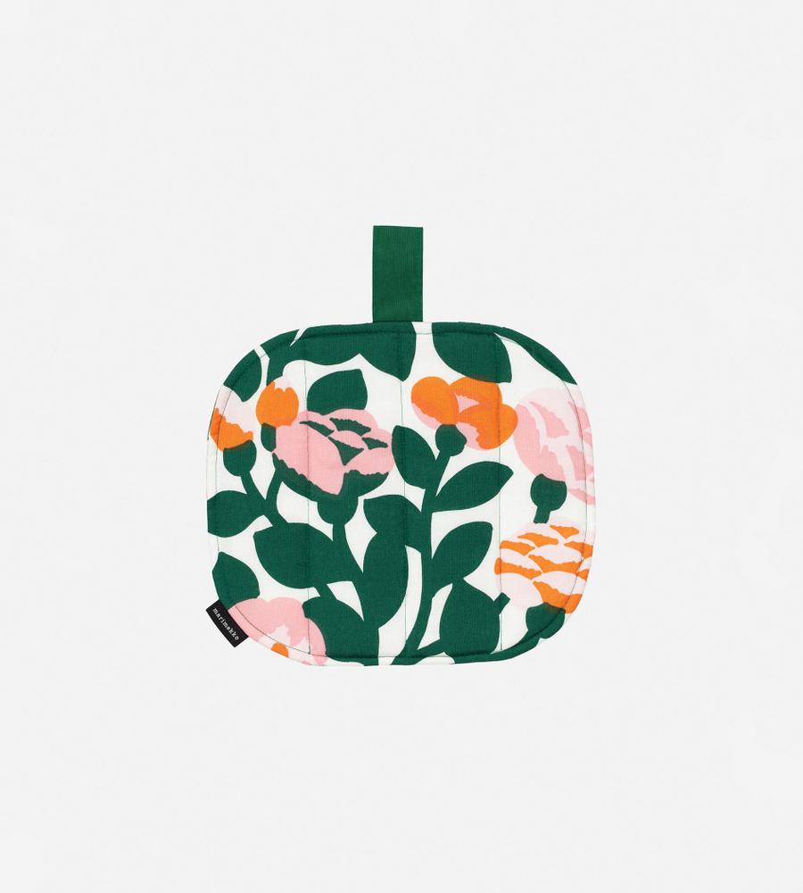 華やかなPieni Greenボタニカル柄の鍋つかみ。スクエアのフォルムは、鍋をつかんだり熱いポットを置いたりと料理中から食卓まで幅広く使える便利なアイテム。キッチンなど簡単に吊り下げられるループ付き。ブランドタグがさりげないアクセント。スタイリッシュなテーブルコーディネートが完成するアイテムです。