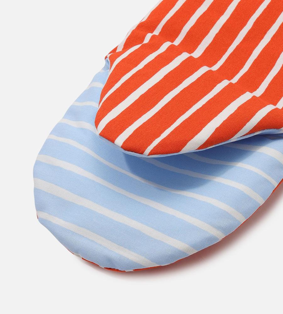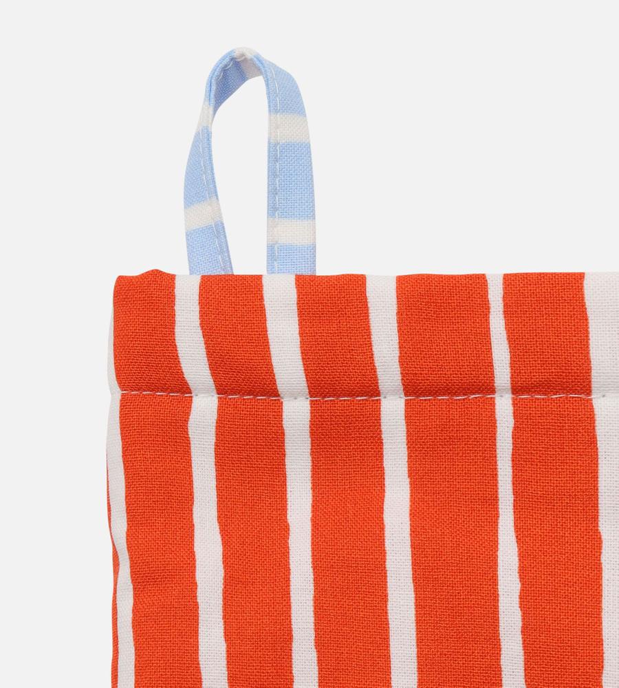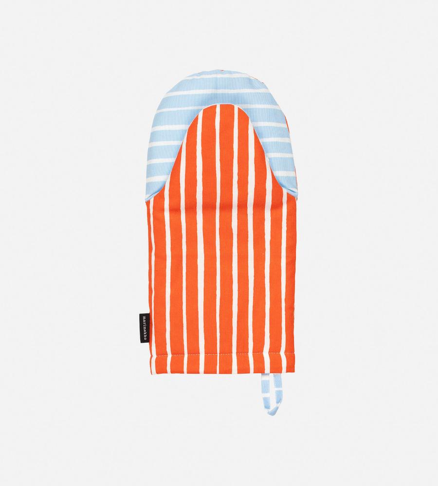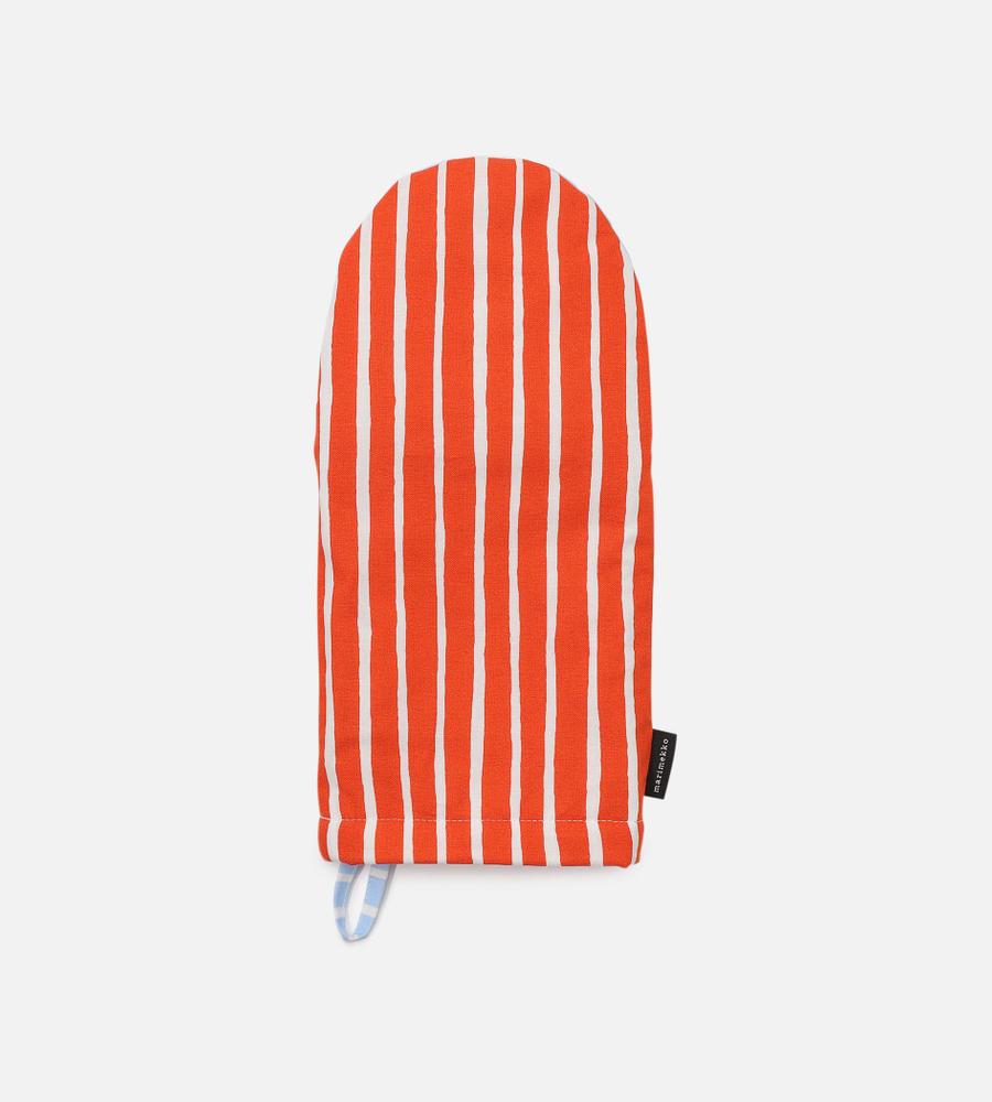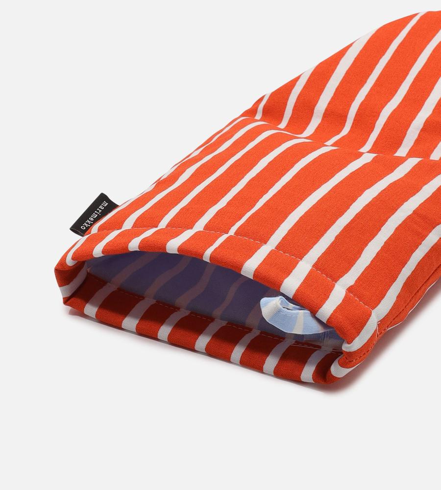 手描きタッチのストライプ柄が印象的なミトンです。色違いのテキスタイルで切り替えることで、目にも楽しい表情に仕上げています。左右どちらの手にも装着できるデザイン。程よい厚みがあり、安心感のある使い心地です。お料理好きな方へのギフトにもおすすめのアイテムです。