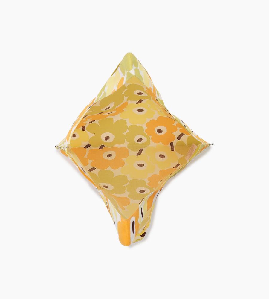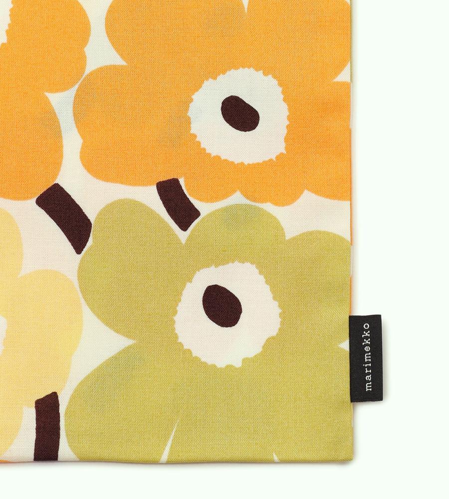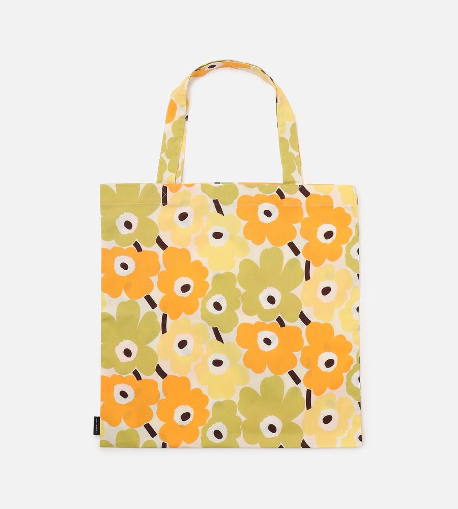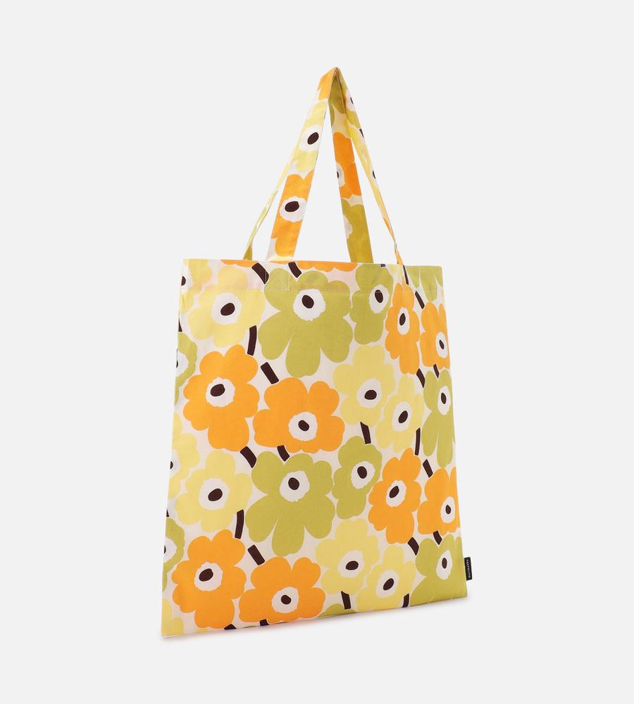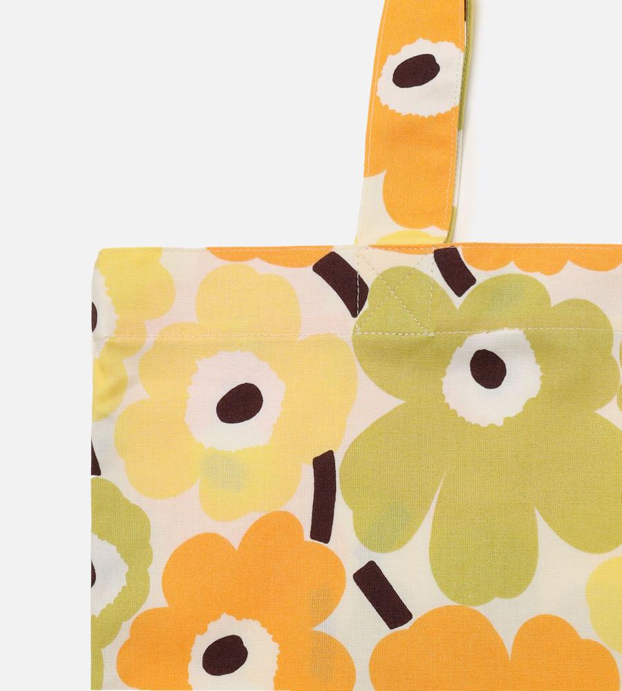 ライトグリーン×ライトイエローをベースに仕上げたMini Unikko トートバッグ。オーガニックコットンとリサイクルコットンをブレンドしています。さっと折りたたんで持ち運べるフラットなフォルムは日常使いに活躍。