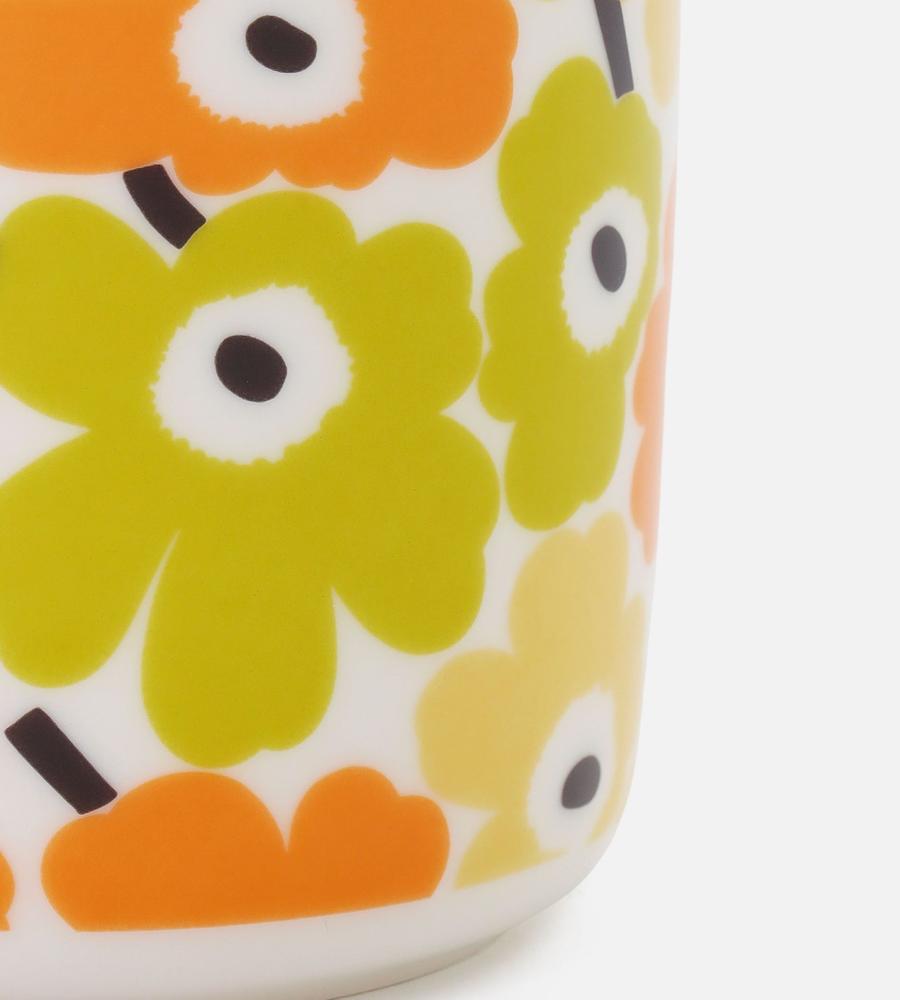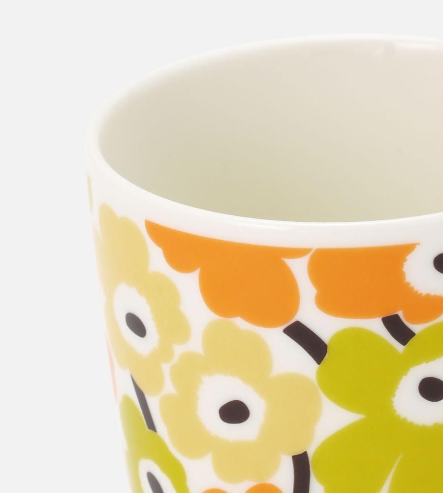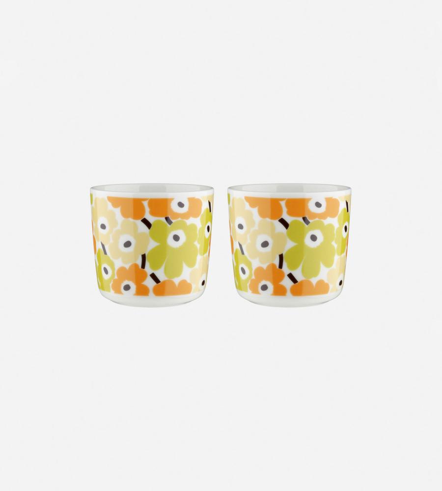 ライトグリーンやライトイエローで華やかに仕上げたUnikko柄のコーヒーカップセット。ハンドルのないすっきりとしたシルエット。手になじみが良い小ぶりのサイズ感も使いやすさの決め手に。ギフトとしてもおすすめのボックス入りです。
