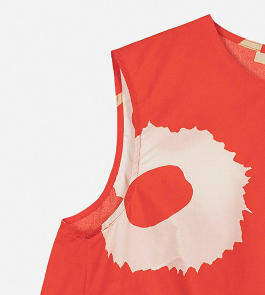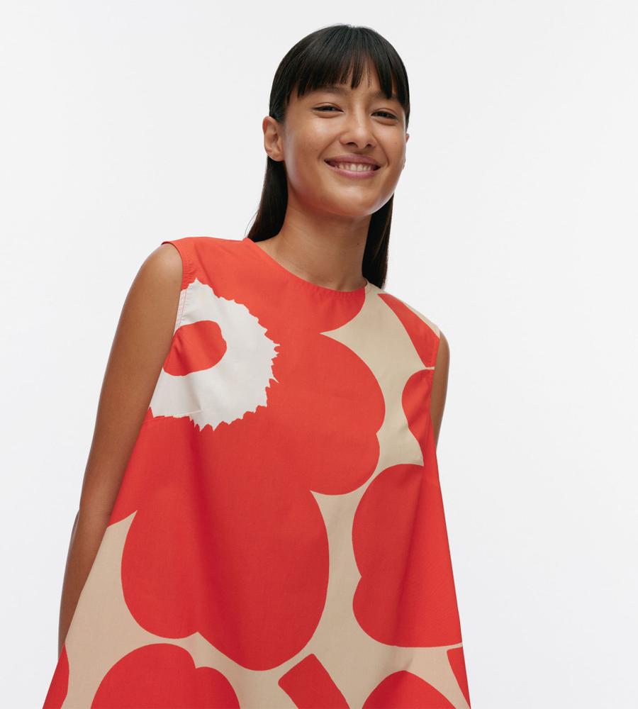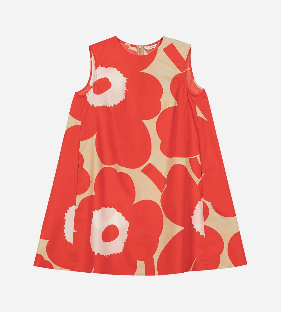 レッド×ブラウン×オフホワイトで展開したUnikkoパターンのノースリーブワンピース。裾に向かって広がるAラインシルエット。バックファスナー仕様、サイドシームポケット付き。1枚で存在感溢れるスタイルが完成します。