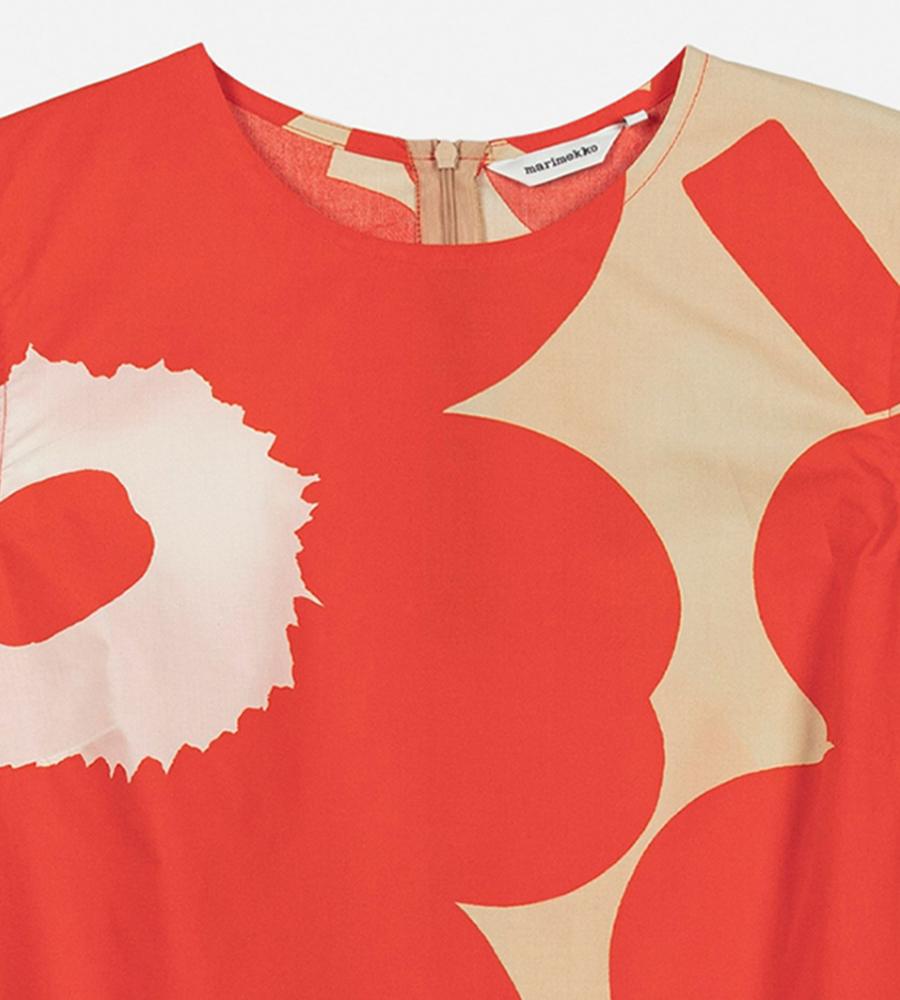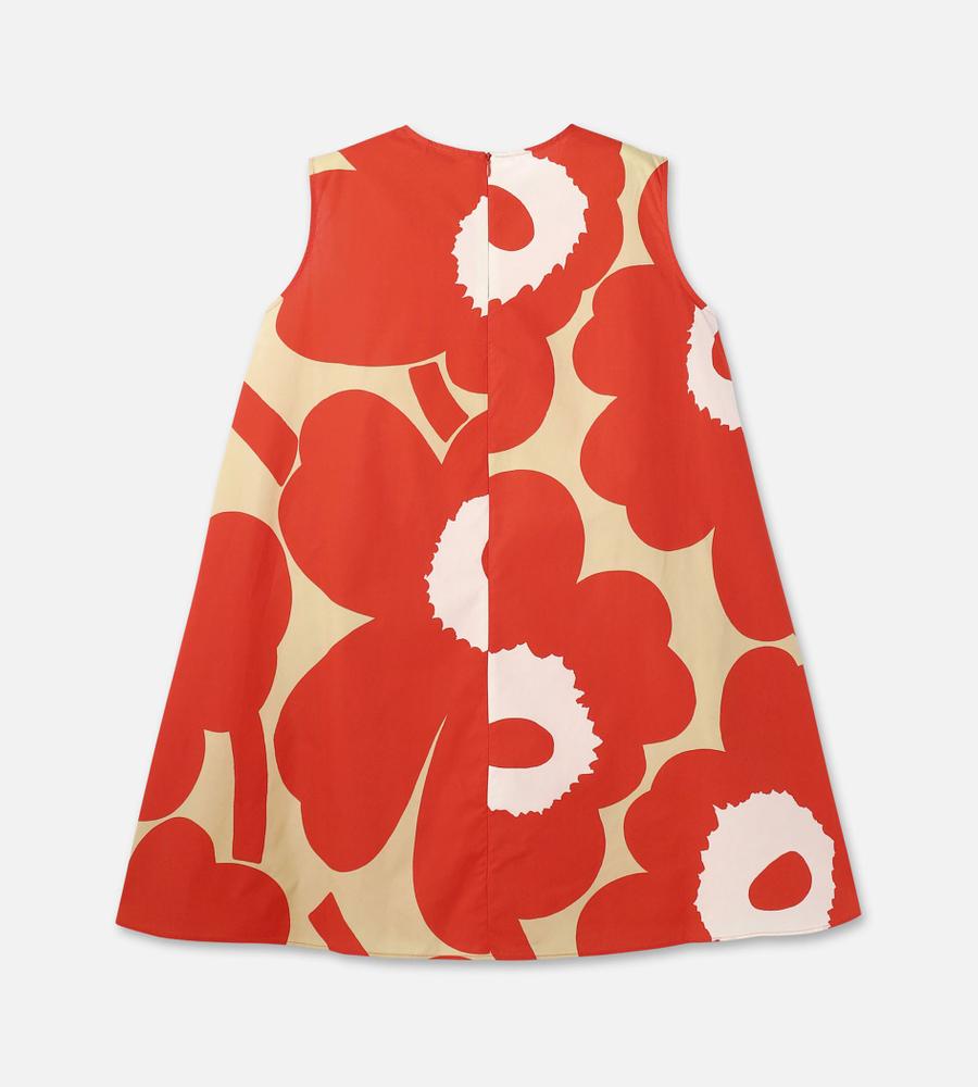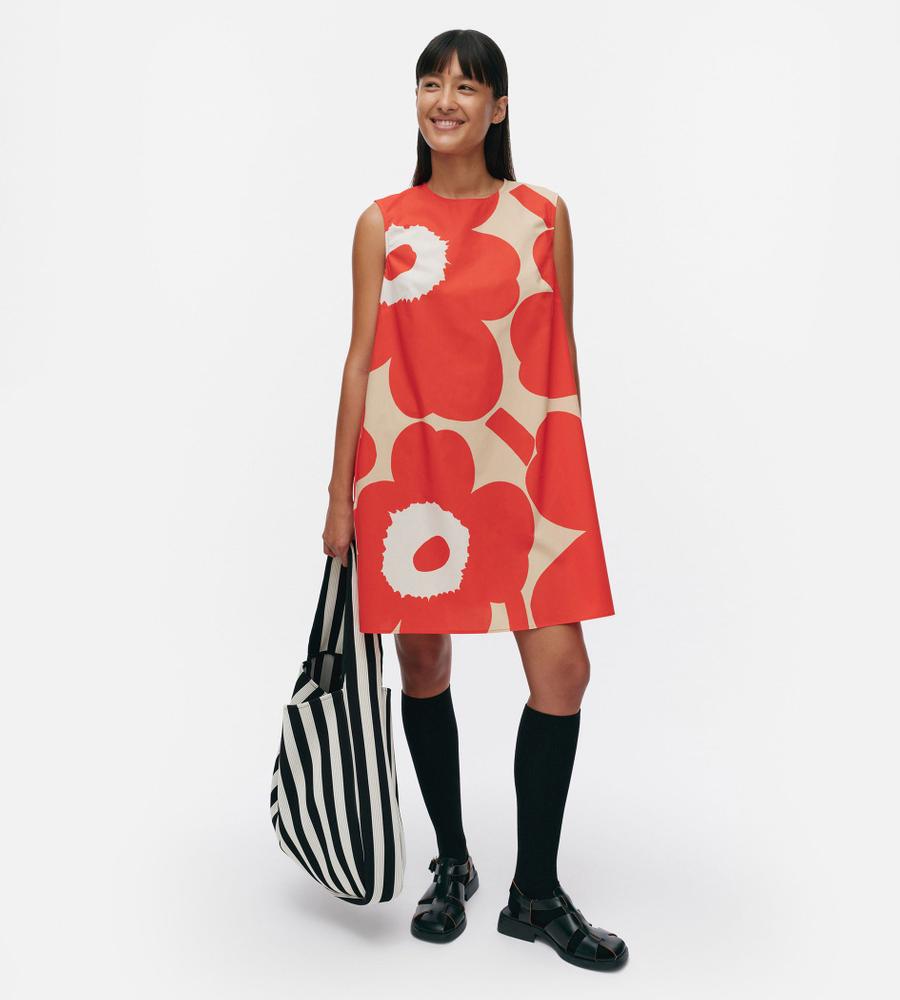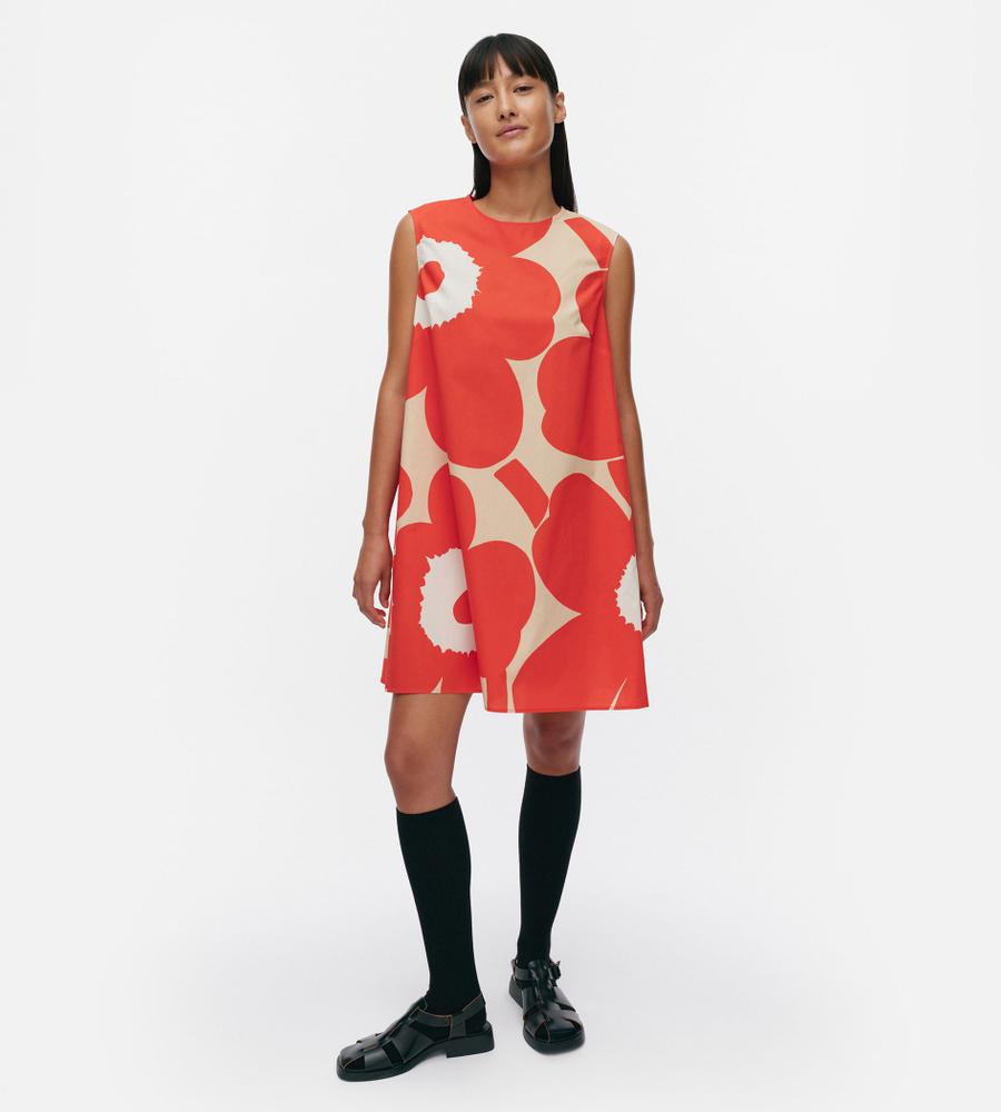 レッド×ブラウン×オフホワイトで展開したUnikkoパターンのノースリーブワンピース。裾に向かって広がるAラインシルエット。バックファスナー仕様、サイドシームポケット付き。1枚で存在感溢れるスタイルが完成します。