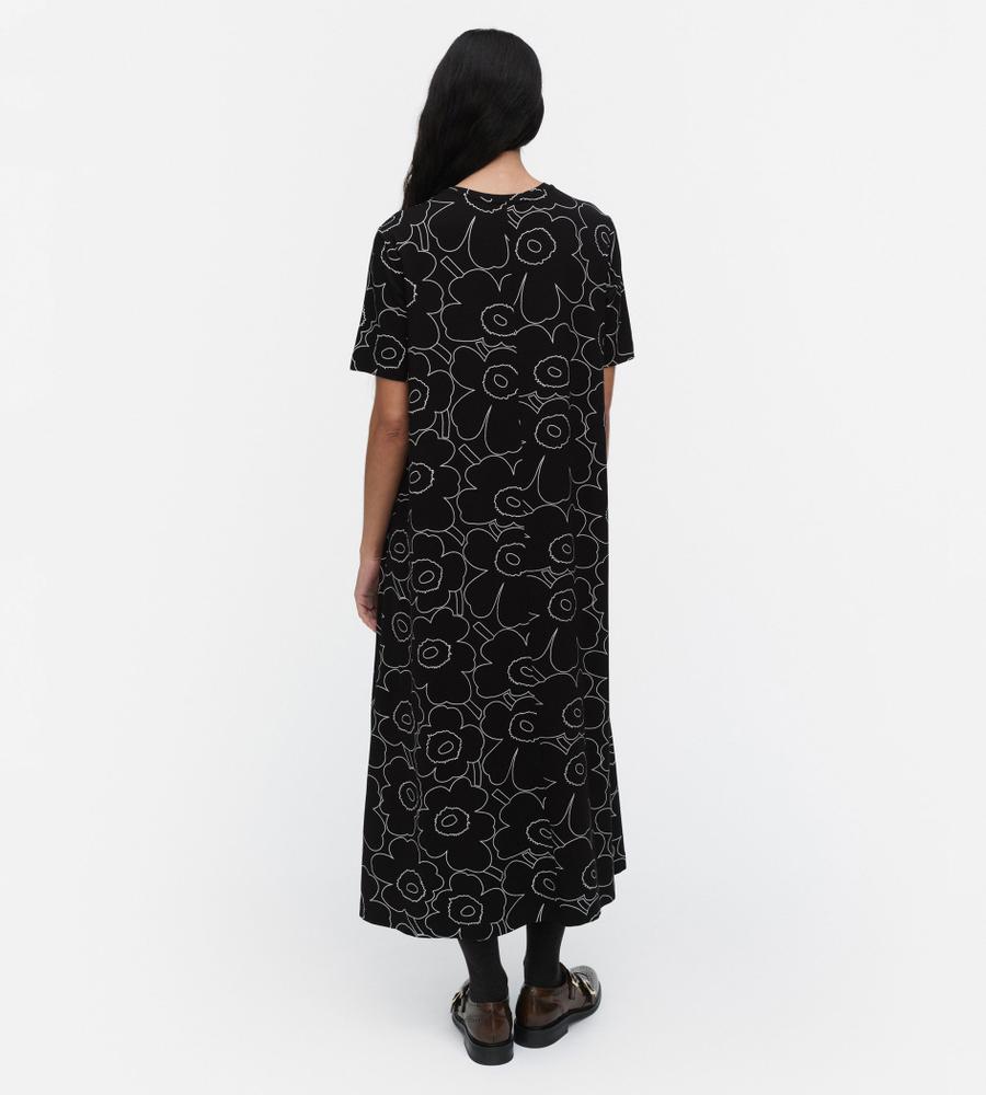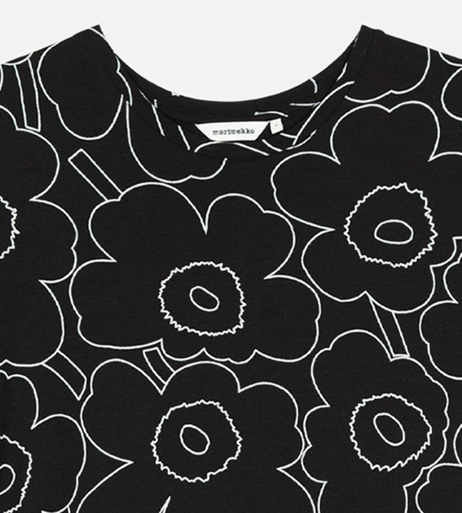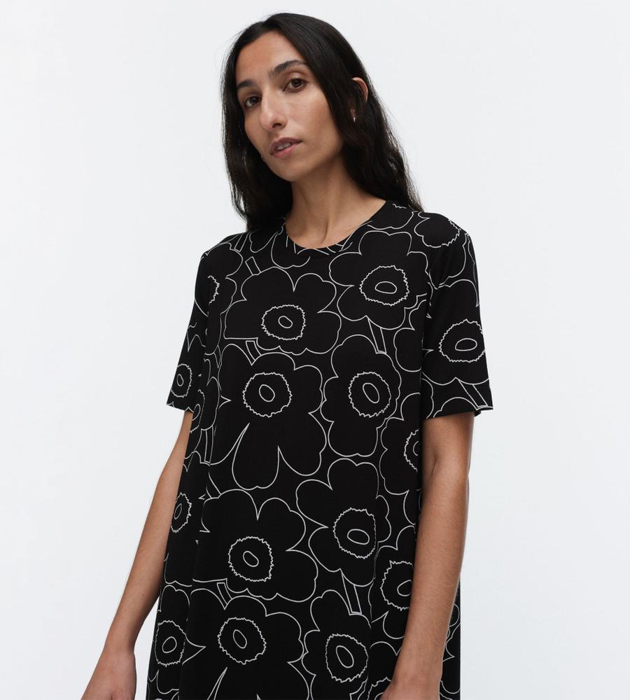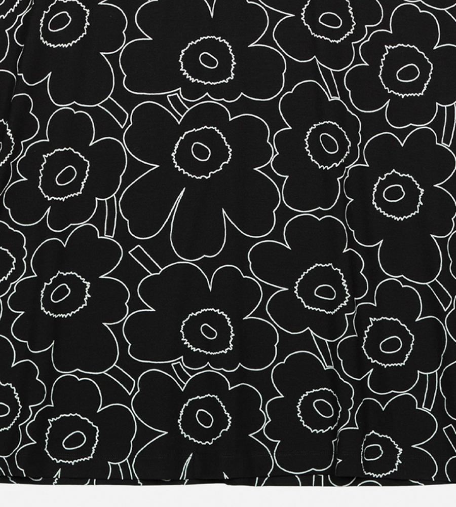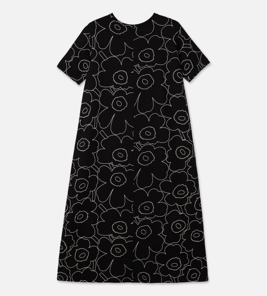 黒ベースのUnikko柄がクールな半袖ワンピース。すとんと落ちるシルエットは、気負わずリラックスして着こなせます。アウターも羽織りやすく、季節の変わり目にも重宝する一枚です。