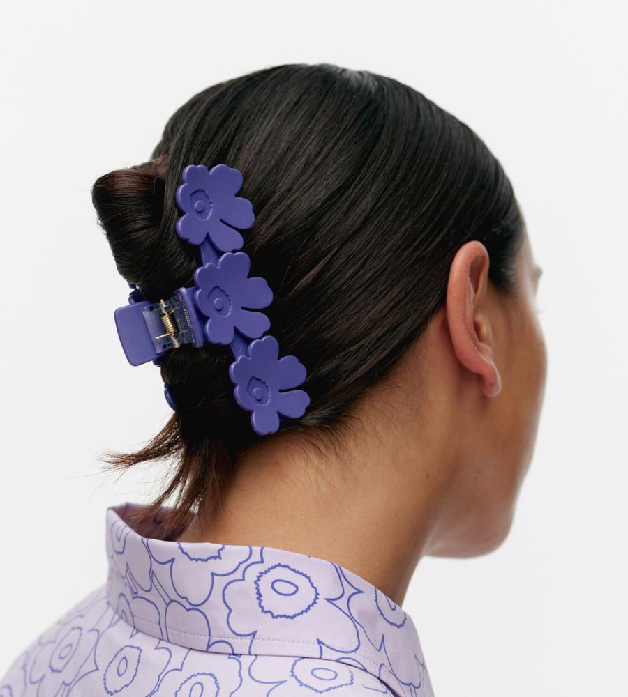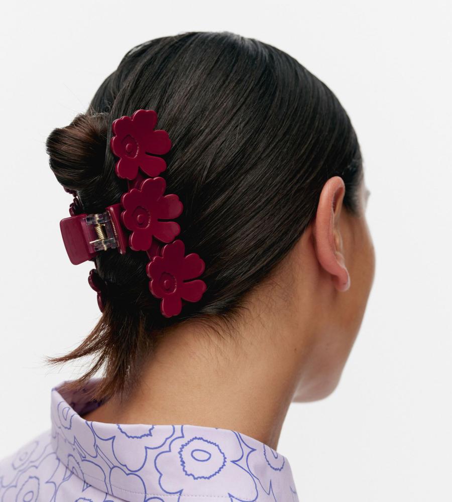 3つのUnikkoの花をあしらったアクリルヘアクリップ。ホールド力のある大きめなフォルムで、アップヘアをまとめるのにちょうどよいサイズ感です。クリップ式で着け外しも簡単。ヘアアレンジの仕上げに添えるだけで華やかな印象になり、コーディネートのアクセントにもぴったりです。