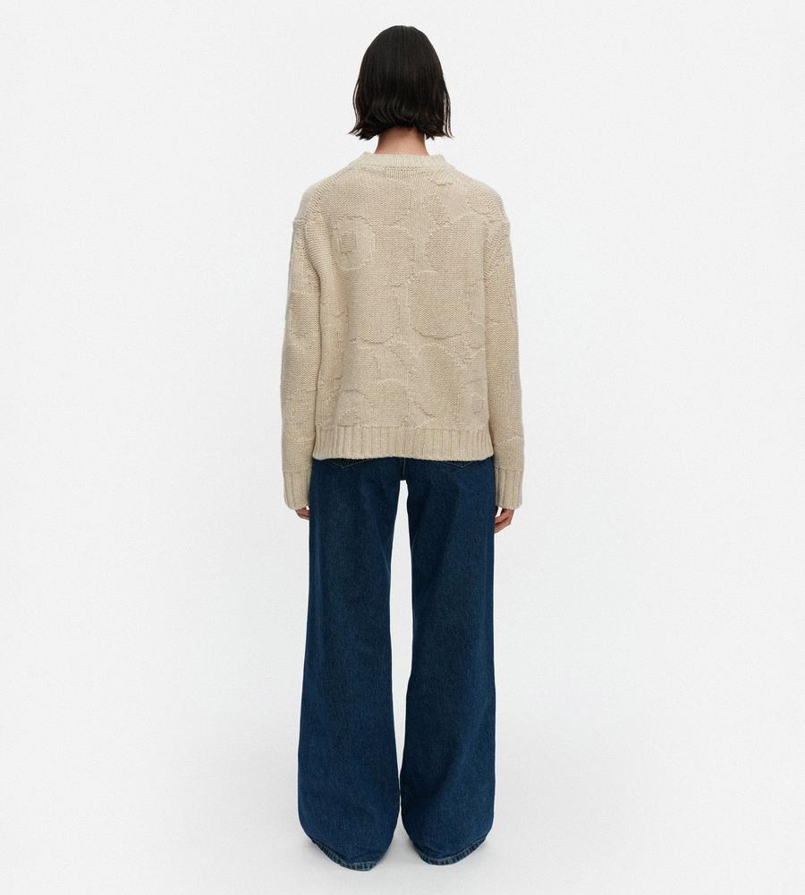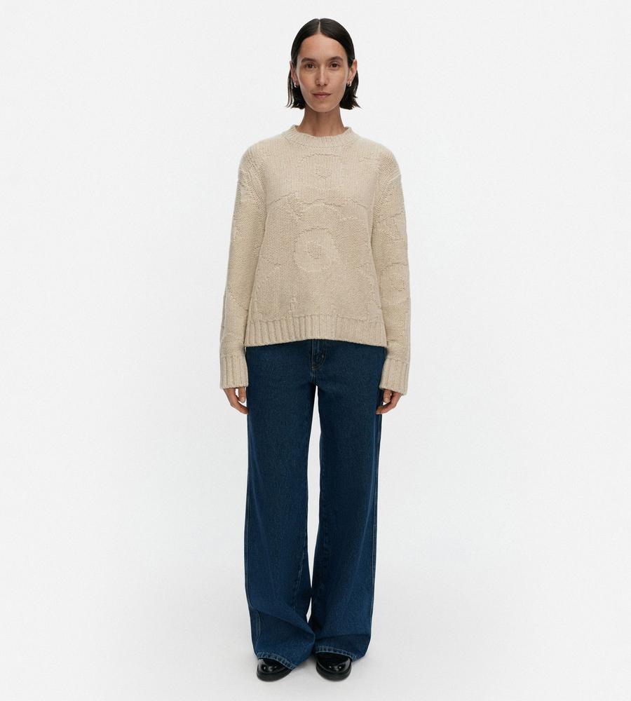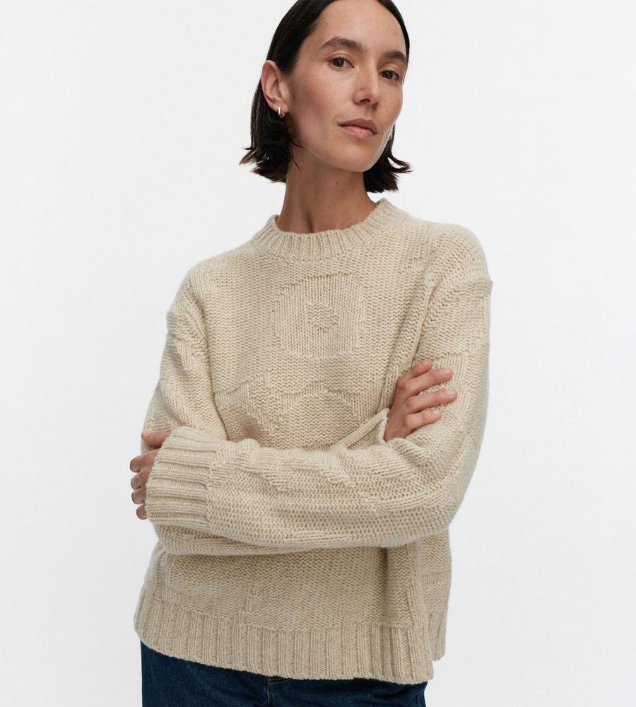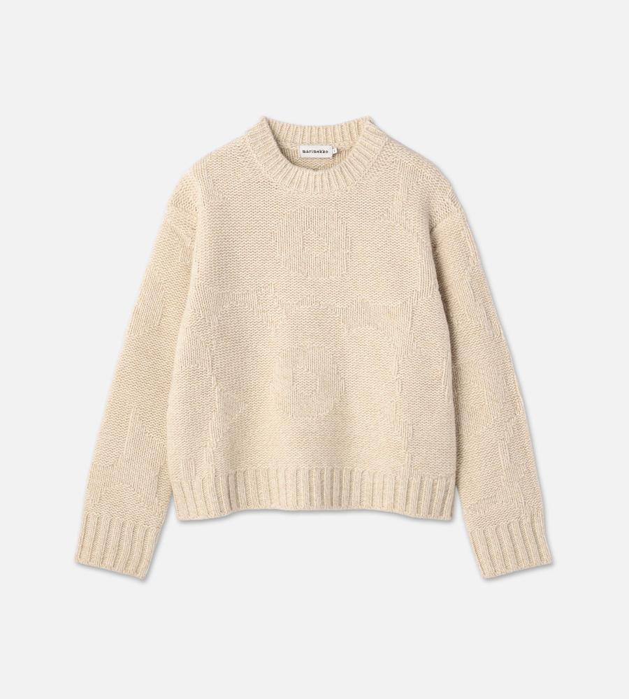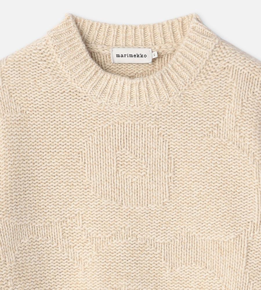 ゆったりとしたフィット感のモダンなシルエットの長袖ニット。Marimekkoを代表するUnikko柄モチーフの編み模様がさりげなく華やかなデザイン。袖口と裾には幅のあるリブのアクセント。毛混合のあたたかな生地感で秋冬の寒いシーズンにぴったり。毎日のコーディネートで活躍するアイテムです。