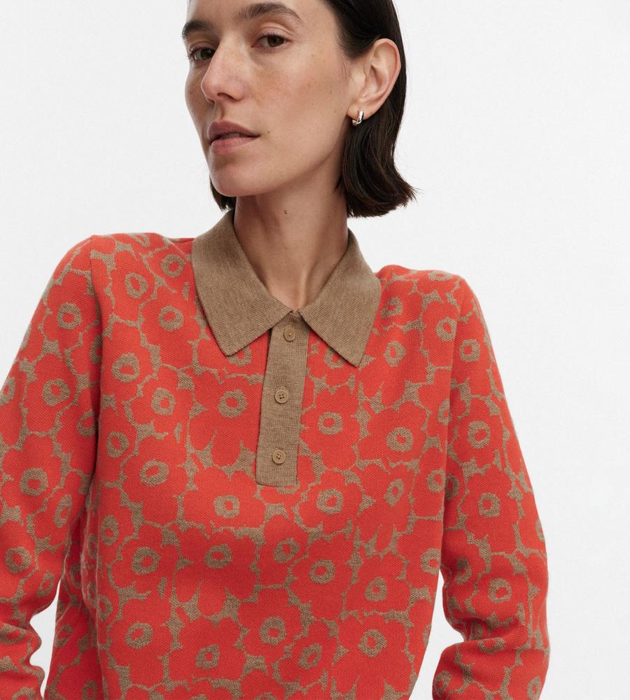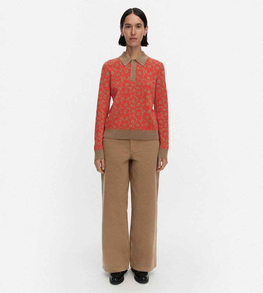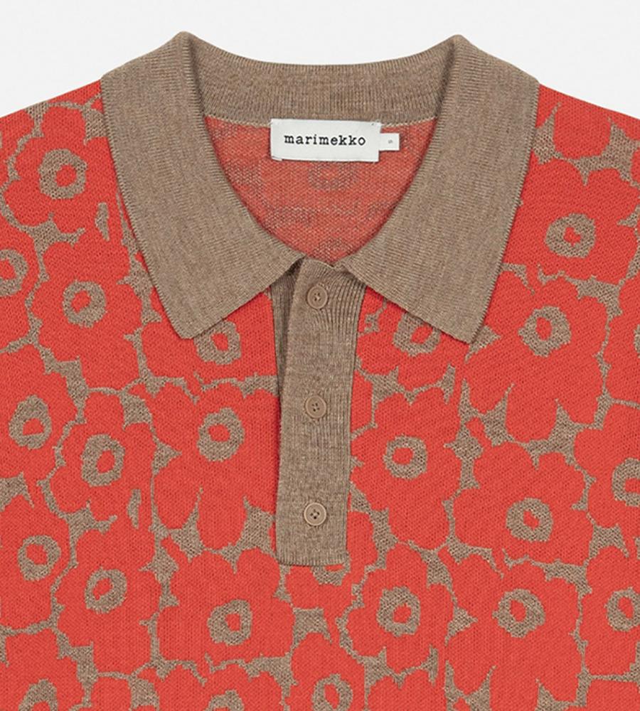 華やかに目を引くUnikko柄のポロニット。トラッド感ある衿つきのデザインで、さらりと着こなせるのがうれしい。つかず離れずのシルエットで、どんなボトムともバランス良くスタイリングできます。