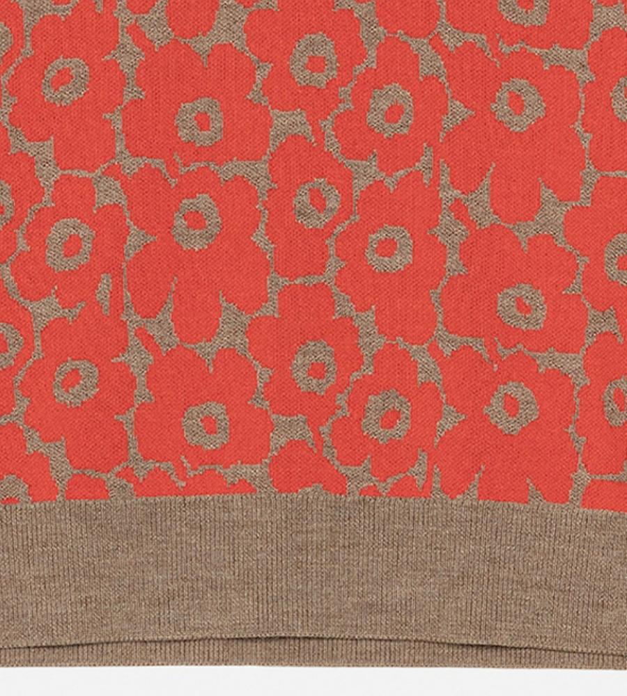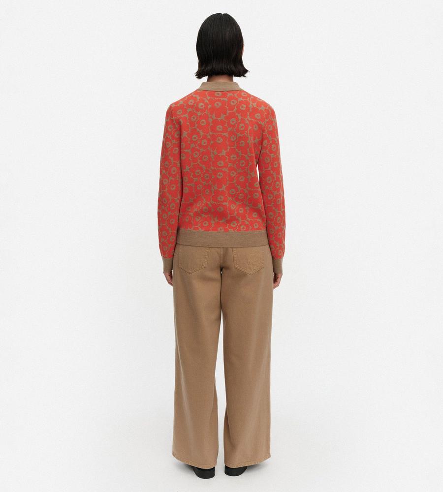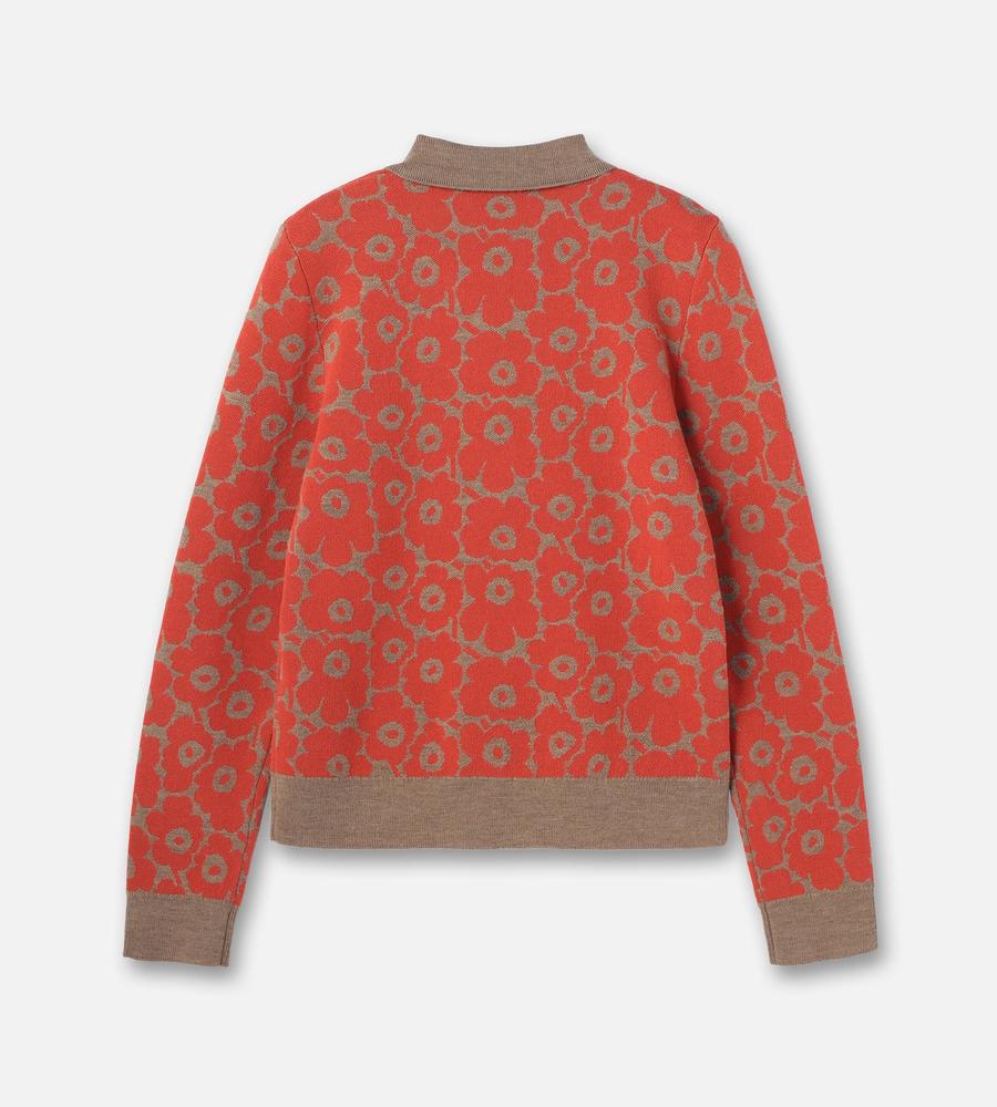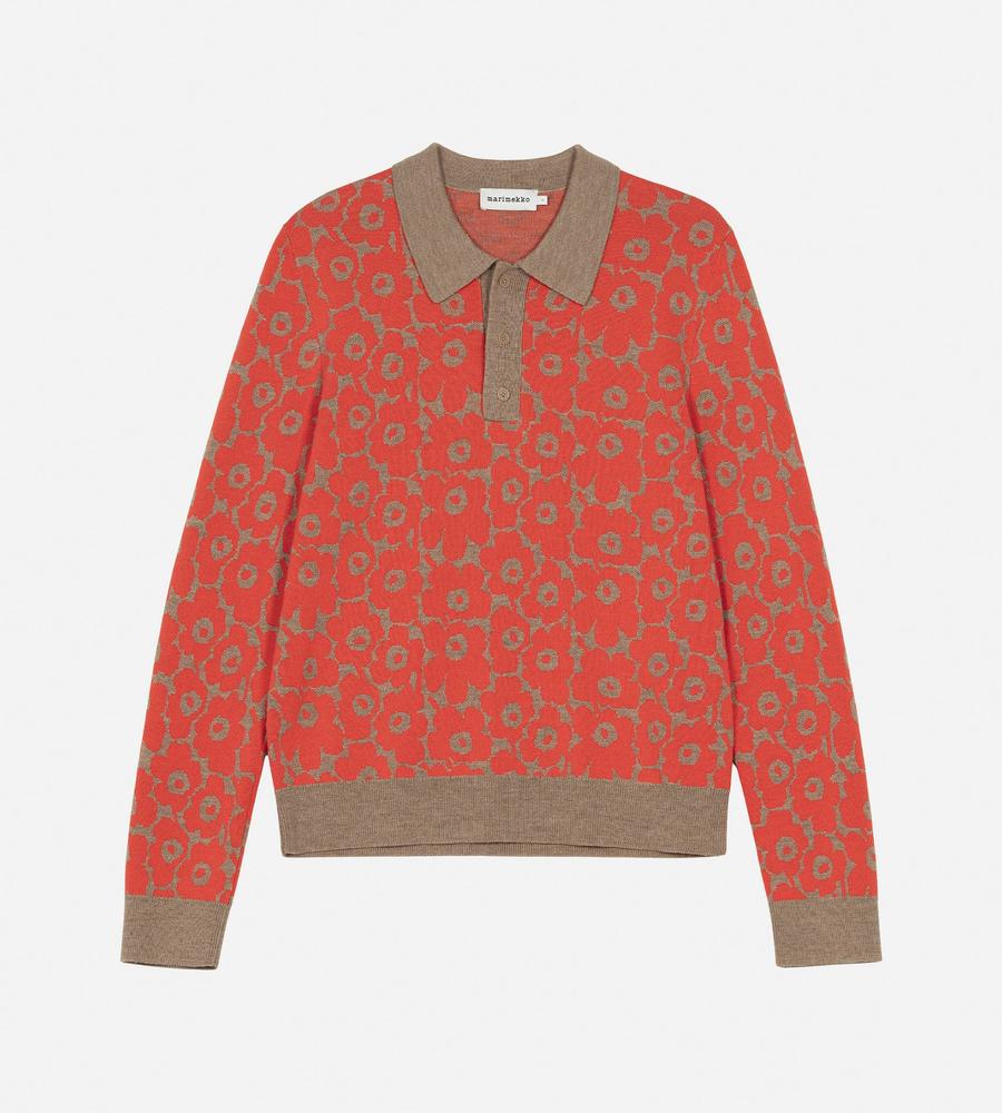 華やかに目を引くUnikko柄のポロニット。トラッド感ある衿つきのデザインで、さらりと着こなせるのがうれしい。つかず離れずのシルエットで、どんなボトムともバランス良くスタイリングできます。