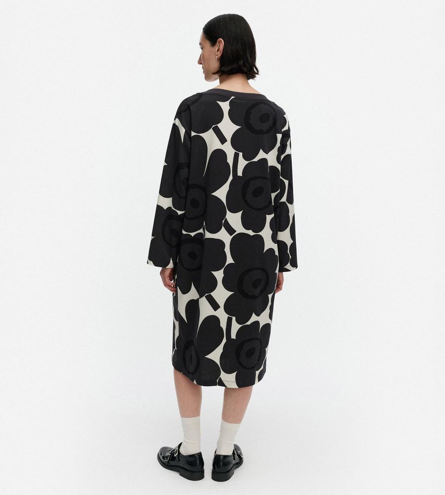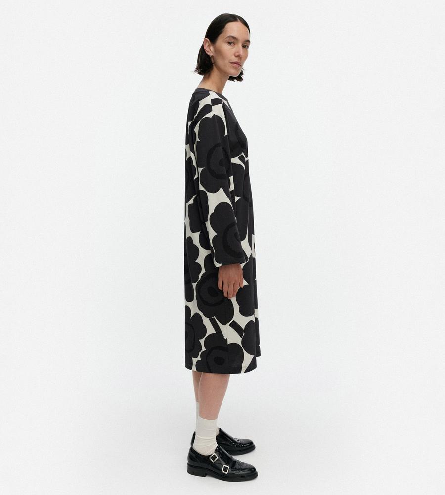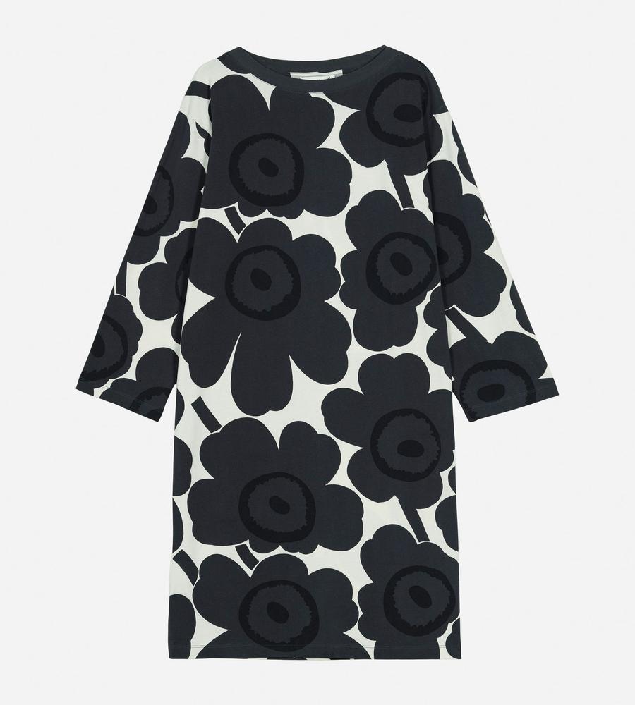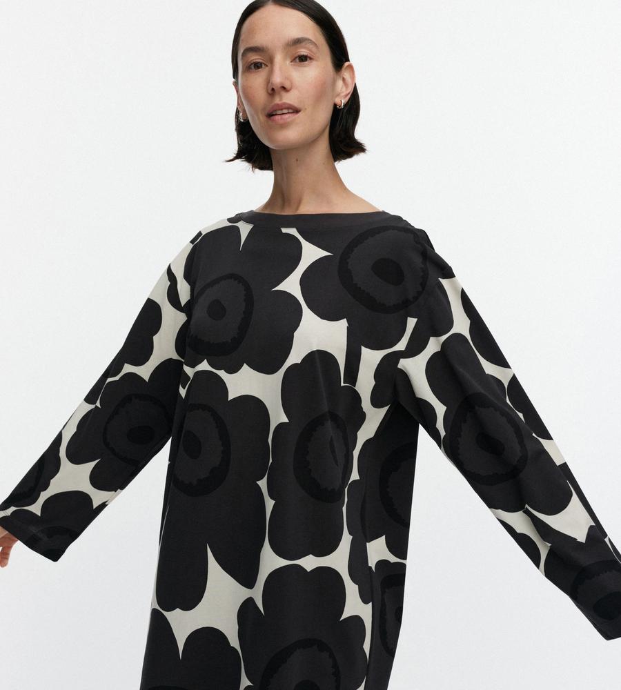 Marimekkoを代表するUnikko柄モチーフを大きくプリントしたインパクトのあるデザインのワンピース。ボートネック、ゆとりのあるストレートカットのシルエットと幅のある袖がモダンなムードを演出。フラワーモチーフが華やかなデザインで、スタイリッシュなお出かけコーディネートが完成するアイテムです。