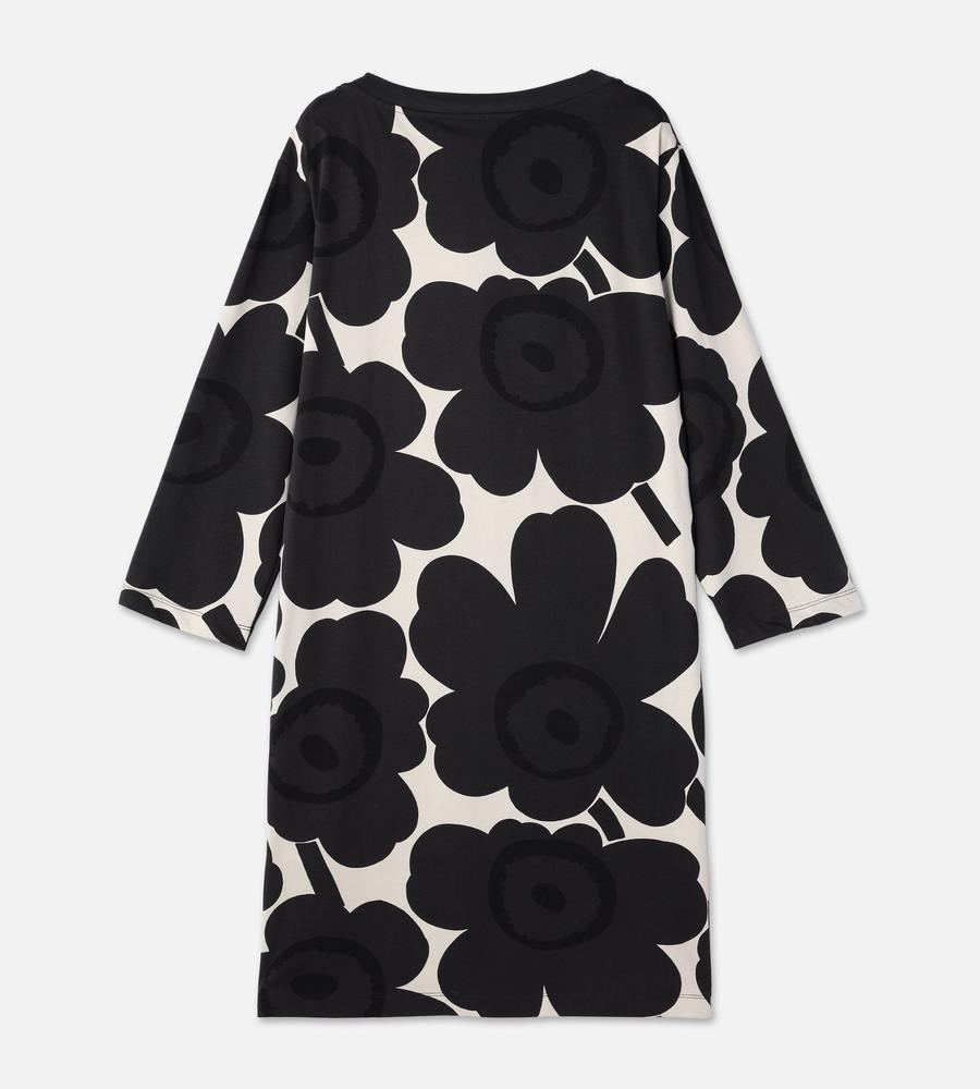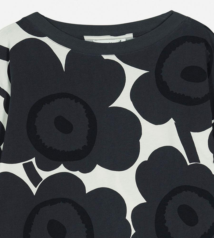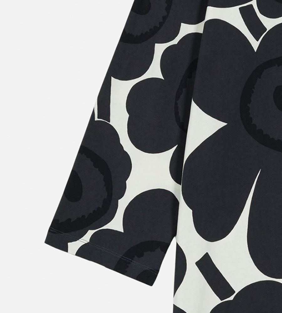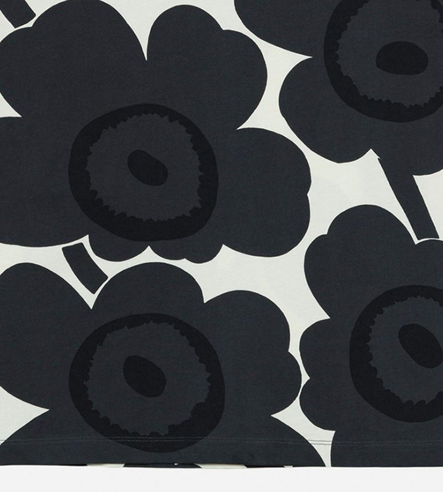 Marimekkoを代表するUnikko柄モチーフを大きくプリントしたインパクトのあるデザインのワンピース。ボートネック、ゆとりのあるストレートカットのシルエットと幅のある袖がモダンなムードを演出。フラワーモチーフが華やかなデザインで、スタイリッシュなお出かけコーディネートが完成するアイテムです。