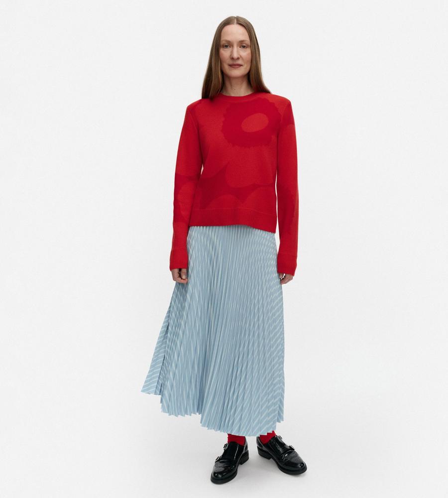 世界中で人気のMarimekkoからPiccoloスカートが登場です。細やかなプリーツから広がるふんわりレディライクなAラインシルエット、毎日のコーデを華やかにドレスアップしてくれます。ニットやカットソーなど、あわせるトップス次第でロングシーズンお使いいただけるのも魅力のアイテムです。